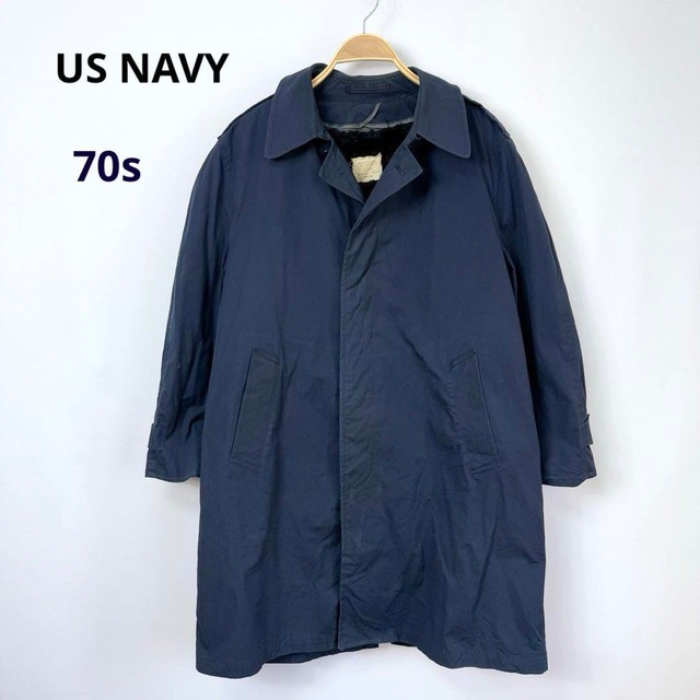 【商品詳細】 70s 米軍 アメリカ軍 US NAVY 米海軍 ボアライナー付き オールウェザー ステンカラーコート ミリタリーコート アルファインダストリーズ社製 チンストラップ付き チンスト付き LINER FOR COAT ALL WEATHER, MAN'S CTN/POLY BLUE alpha industres,inc DLA100-76-C-0913(1976年コントラクト) 落ち着いたネイビーカラーにステンカラーのデザインが合わせやすいアイテム。 ボアライナー付きでジッパーで取り外し可能なライナーを外せば春、秋まで着れます。 スーツの上からでも着れるデザインなのでカジュアルにもフォーマルにも着て頂けます。 お探しの方是非! 【ブランド】unknown 【素材】不明 【袖丈】長袖 【ドローコードの有無】無し 【色】ネイビー 紺 【サイズ】 表記サイズ : 42S Lくらいのサイズ感かと思います。 必ず下の実寸サイズを確認お願いいたします。 着丈 :100.5 身幅 :63 裄丈 :85 【状態】 袖、首元、襟、お腹、左右ポケット口、裾、バック左右袖付け横、背中、腰、バック裾上に薄汚れ数カ所あり。お腹リペア跡あり。襟裏生地引けダメージ数カ所あり。 あくまで古着となりますので記載の無い小さな汚れがある場合がございます。画像にてご確認、古着という事をご理解の上、ご購入よろしくお願いします。 【管理番号】S90-1-VJ3-50216b