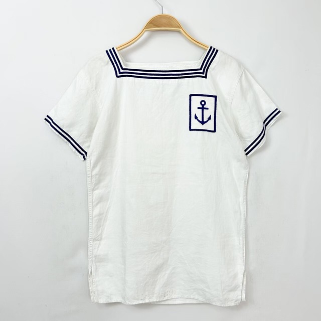 【商品詳細】 50年代 50s フランス軍 フランス海軍 リネン マリンセーラーシャツ 半袖 トップス ミリタリー シャツ レディース ユーロミリタリー 50s French navy sailor shirts 古いリネンのテロンとした生地が気持ちの良い50年代のフランス軍のセーラーシャツ。 裾にスリット入りです。 【ブランド】unknown 【素材】 【袖丈】半袖 【ドローコードの有無】無し 【色】ホワイト 白 【サイズ】 表記サイズ : 不明 総丈:69.5 身幅 :47 肩幅:43.5 袖丈 :16 【状態】 左袖、首元、左袖付け横、胸によく見ないと分からない程度薄汚れ数カ所あり。前後裾内側の文字が透けています。 あくまで古着となりますので記載の無い小さな汚れがある場合がございます。画像にてご確認、古着という事をご理解の上、ご購入よろしくお願いします。 【管理番号】S39-7-S255-50323b