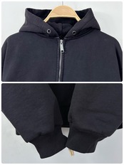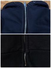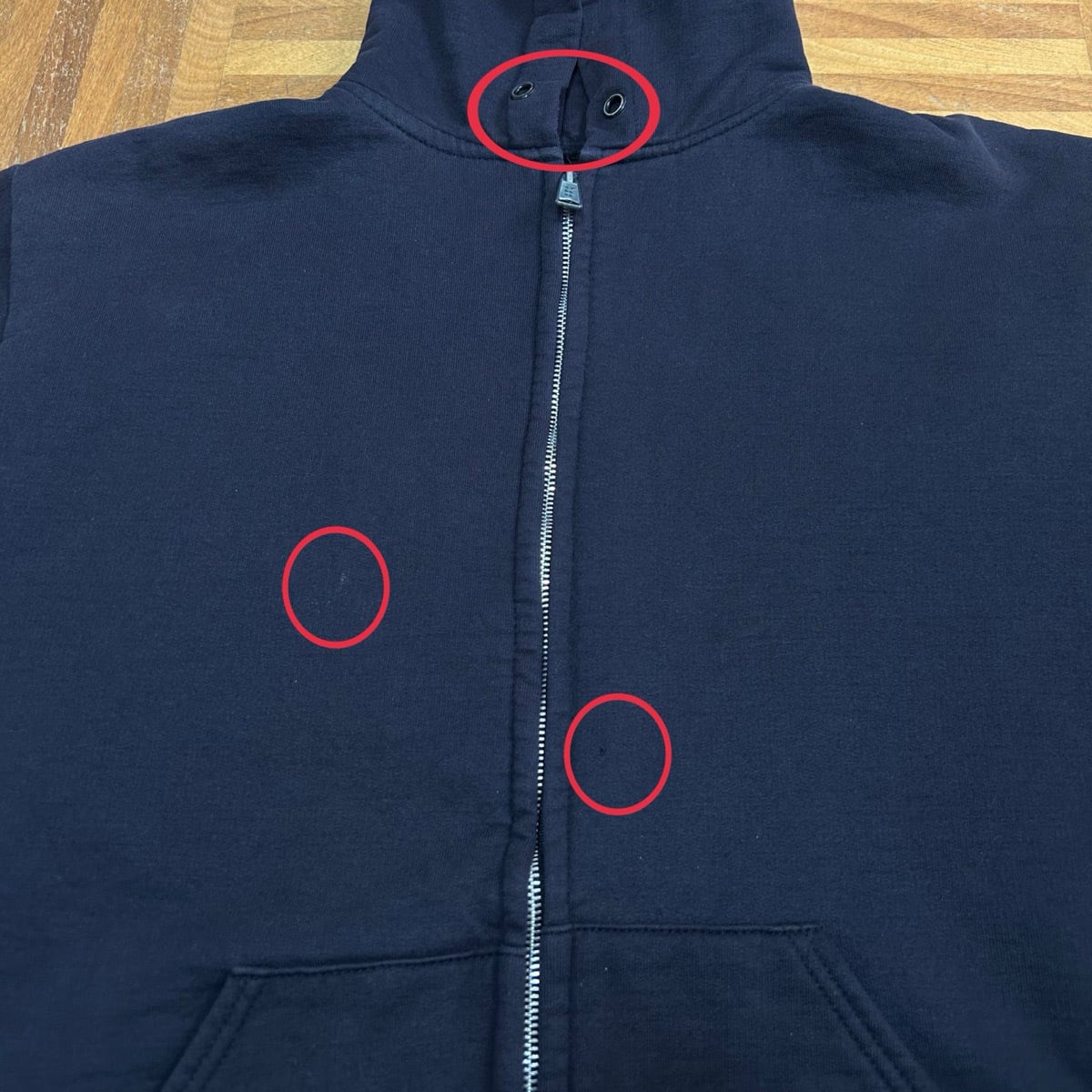 フードの紐無し。右胸下薄汚れ数カ所あり。お腹に3㎜程度のダメージあり。