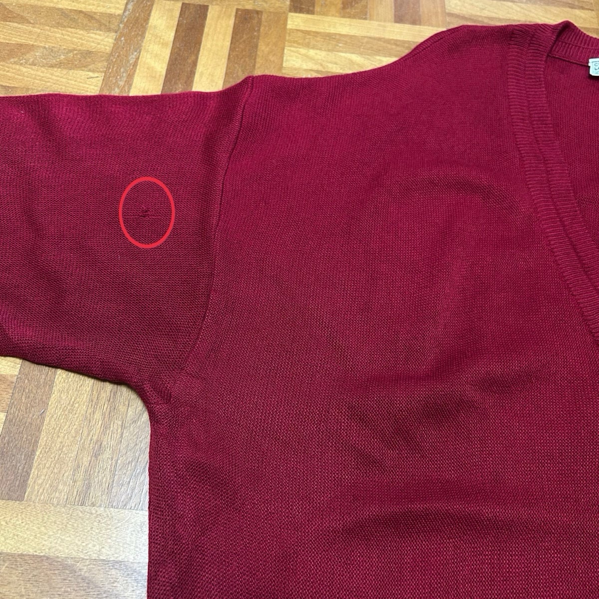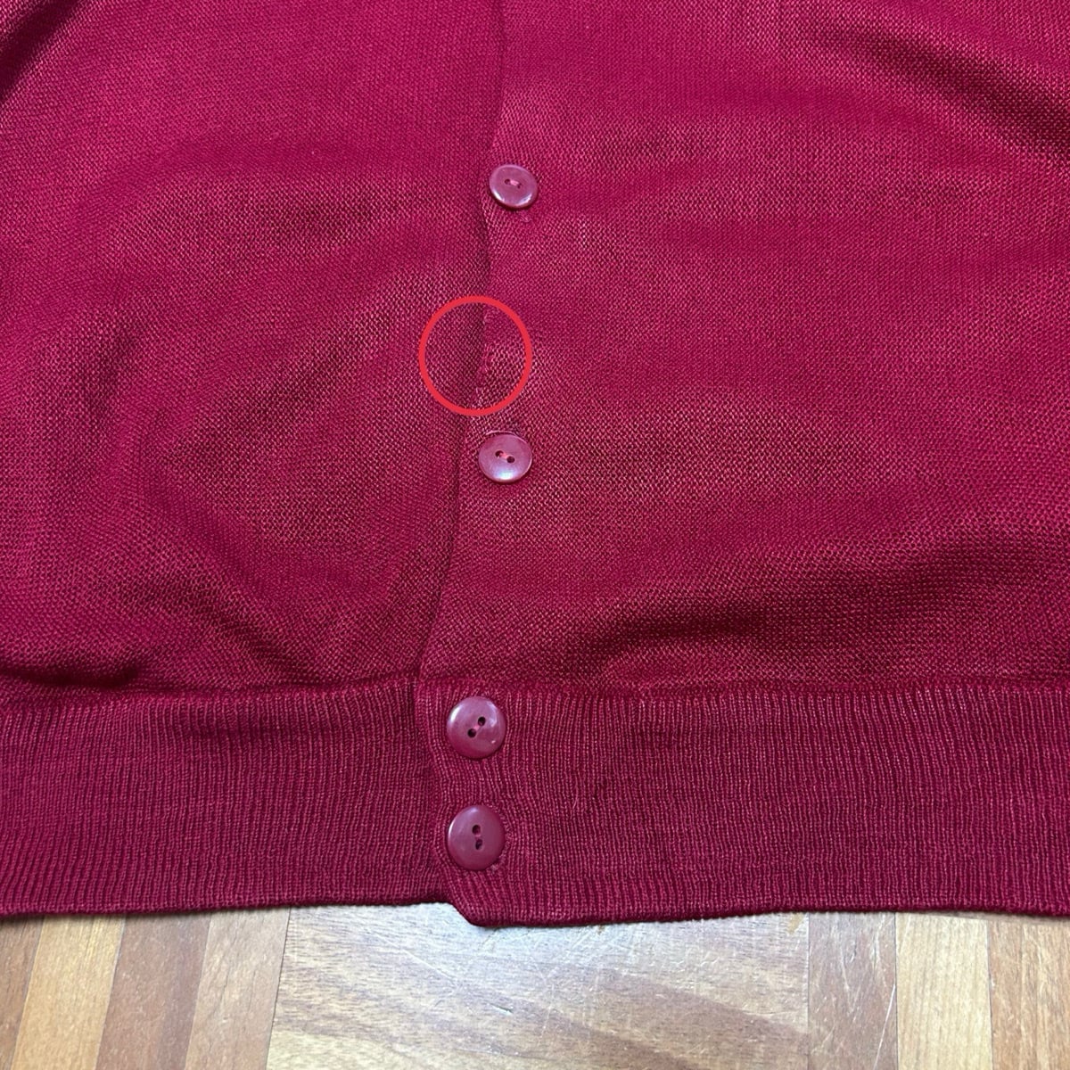 右袖、下から3番目ボタン上、腰辺りに5㎜〜1㎝程度のダメージ数カ所あり。左袖先リペア跡とダメージあり。左脇糸引けあり。