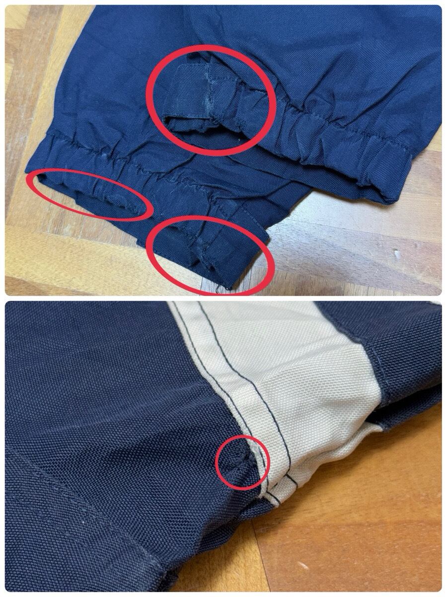 袖、フロントジップ下、裾に薄汚れ数カ所あり。バック肩若干色褪せあり。右ポケット、バック裾擦れあり。左袖、袖先擦れダメージ、リペア跡数カ所あり。フード、裾のドローコード紐伸びています。バック左袖付け横生地引けあり。
