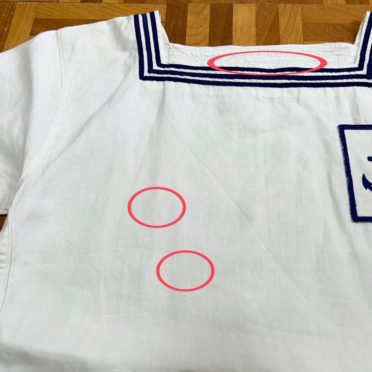 左袖、首元、左袖付け横、胸によく見ないと分からない程度薄汚れ数カ所あり。前後裾内側の文字が透けています。