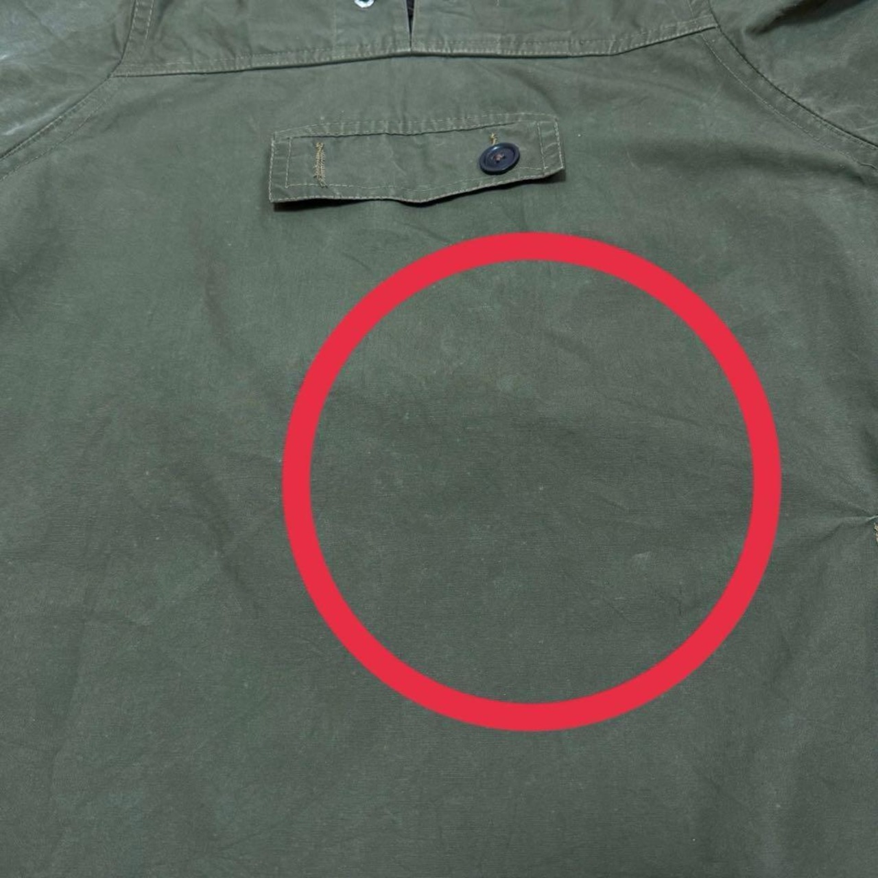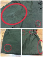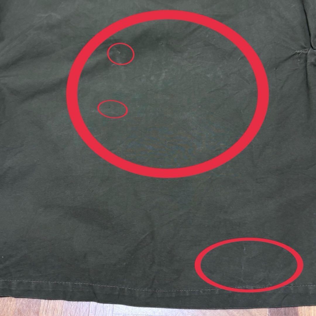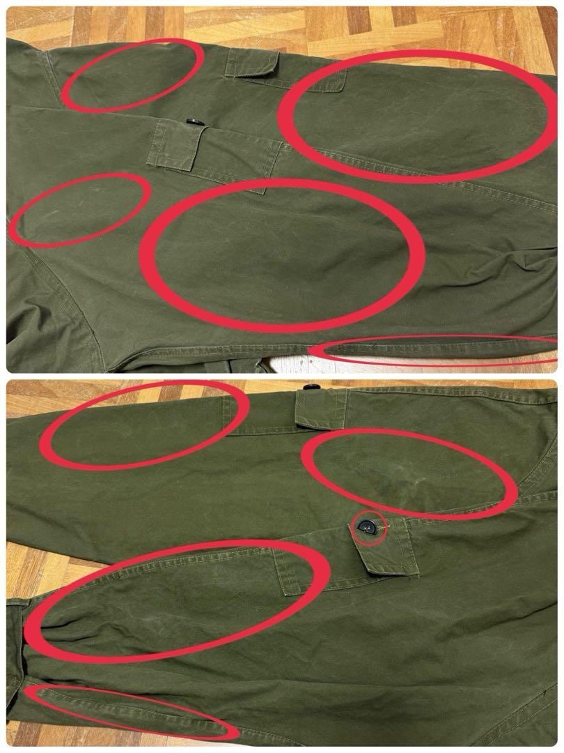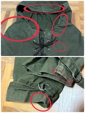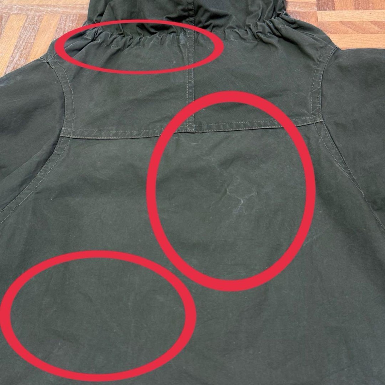 袖、フード、首元、お腹、バック首元、背中、擦れで白っぽくなっているところ数カ所あり。袖、左サイド、左ウエスト、ミシン目ほつれあり。右袖、右裾、腰に薄汚れ数カ所あり。左袖ポケットボタンかけあり。胸ポケット右ボタン無し。袖先擦れダメージ数カ所あり。