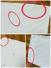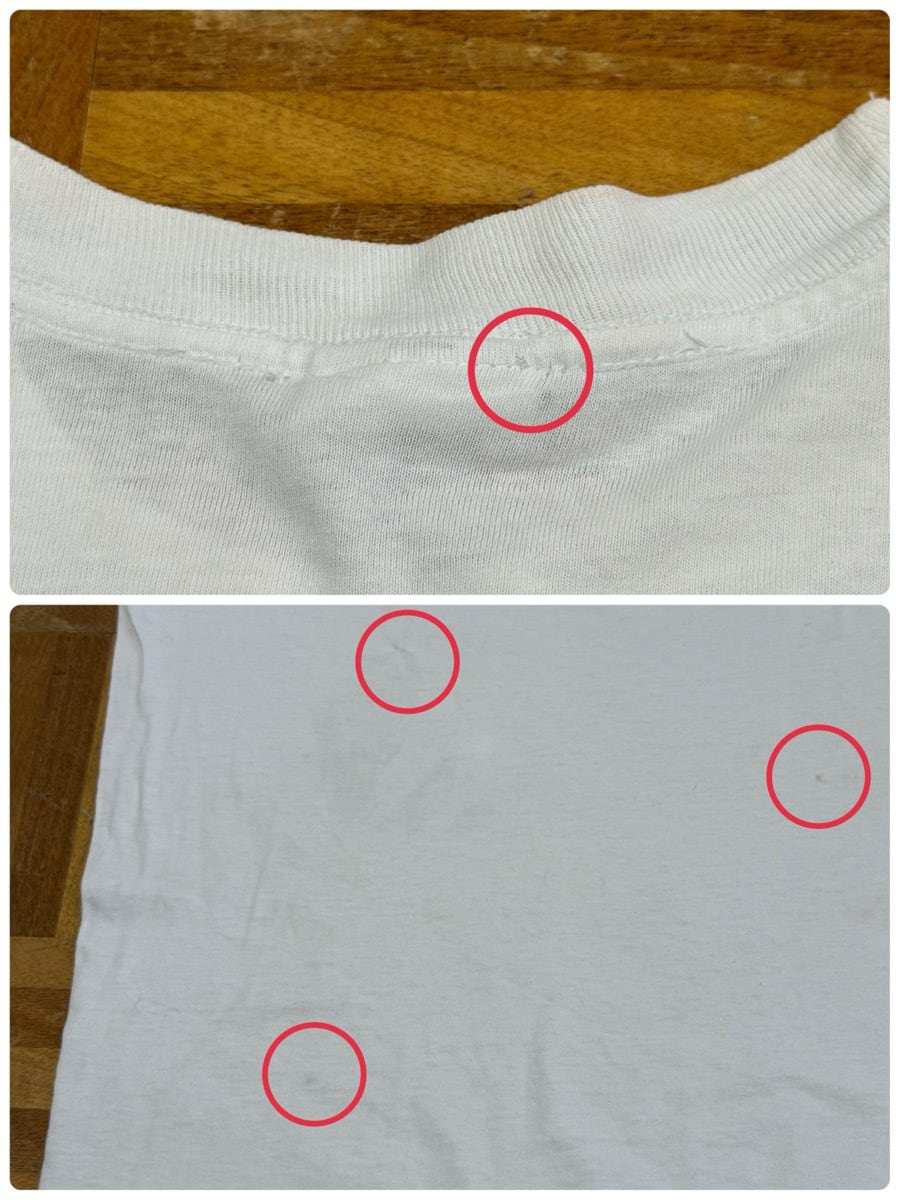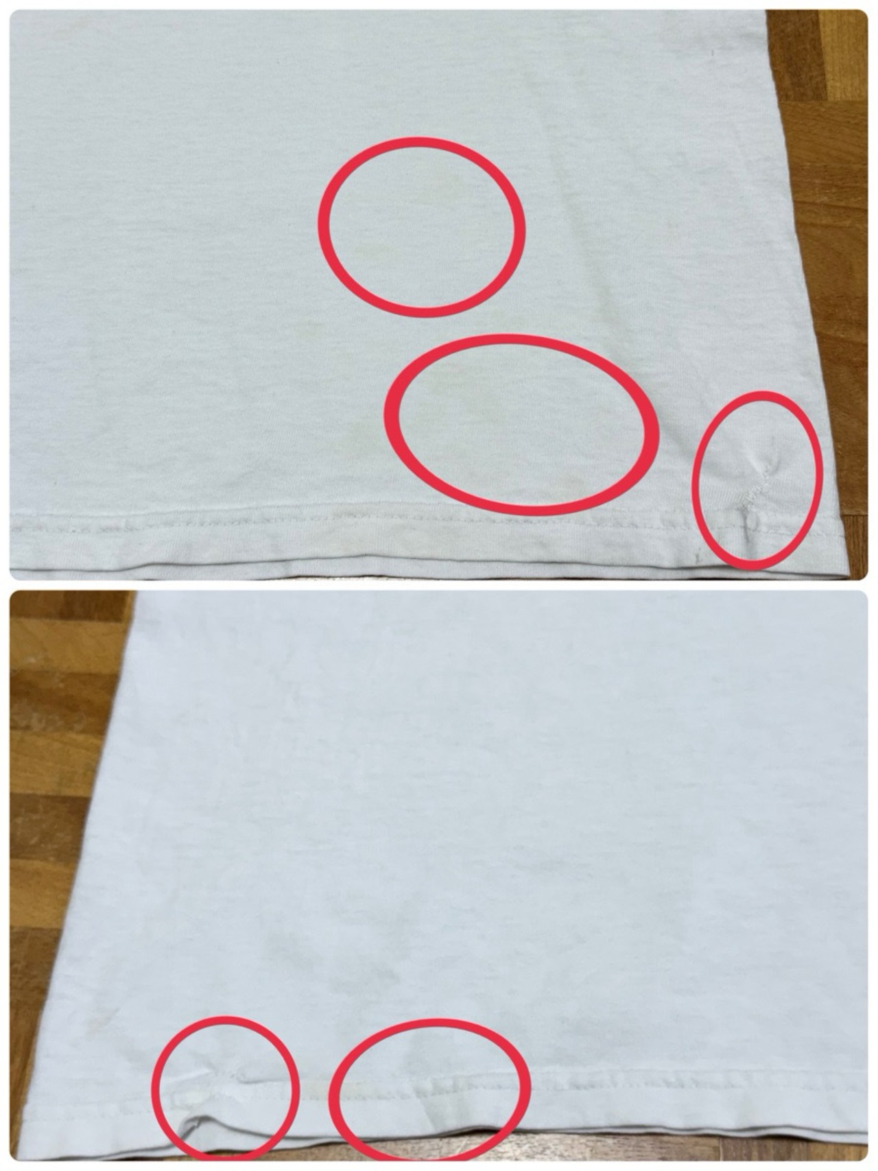 首元、左右裾、背中リペア跡数カ所あり。袖、首周り、胸、お腹、裾、腰、バック左裾上に薄汚れ数カ所あり。バック首元3㎜程度のダメージあり。