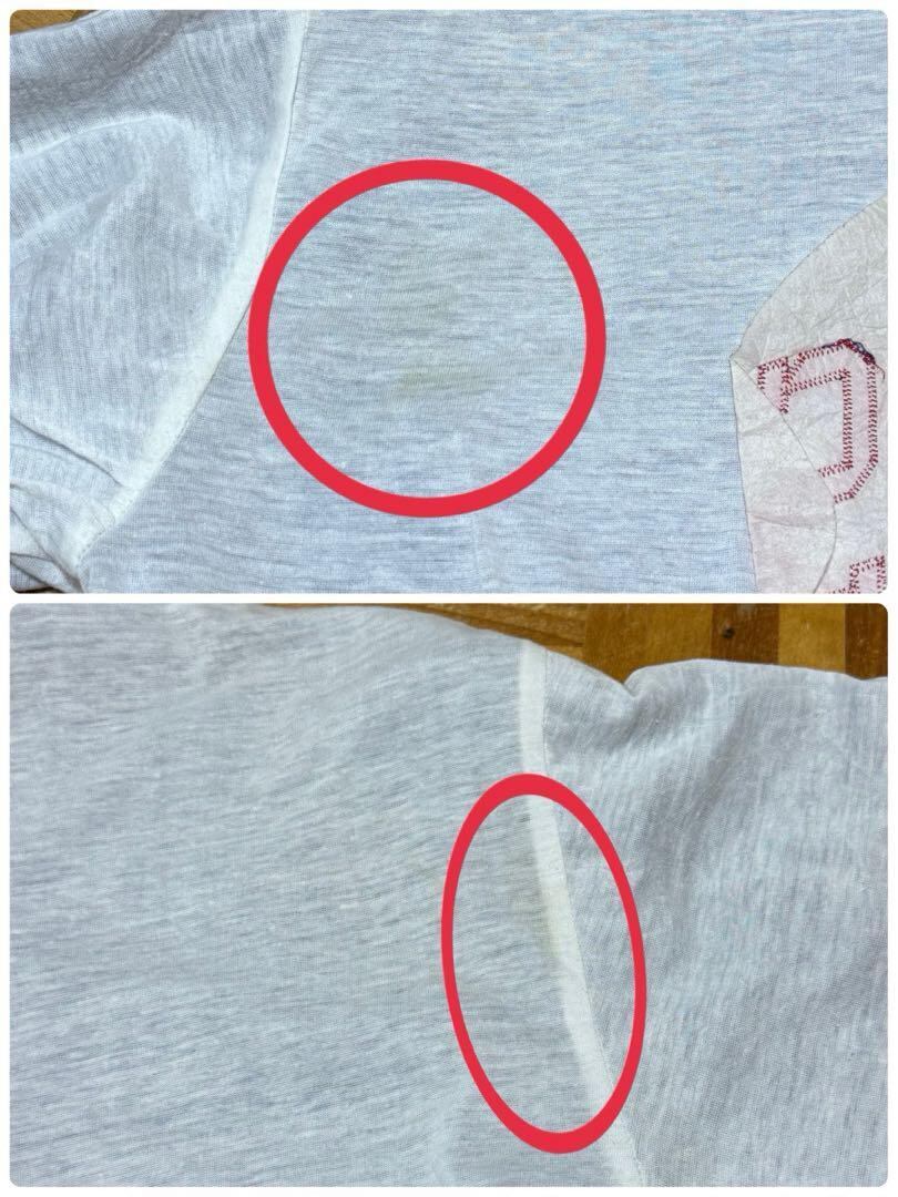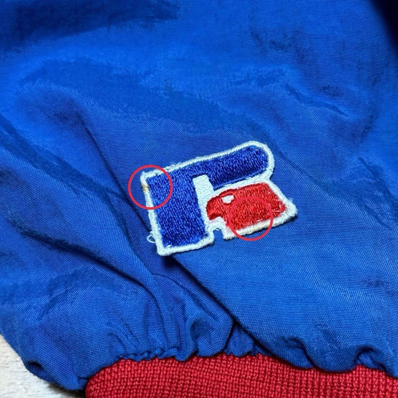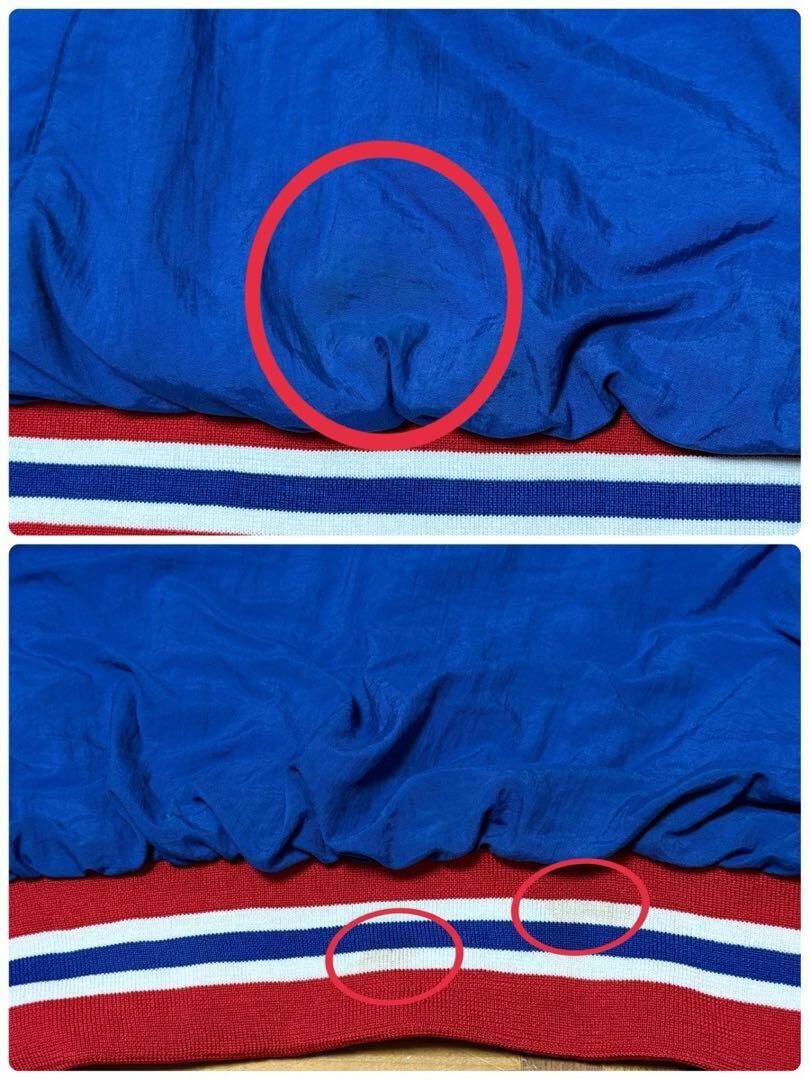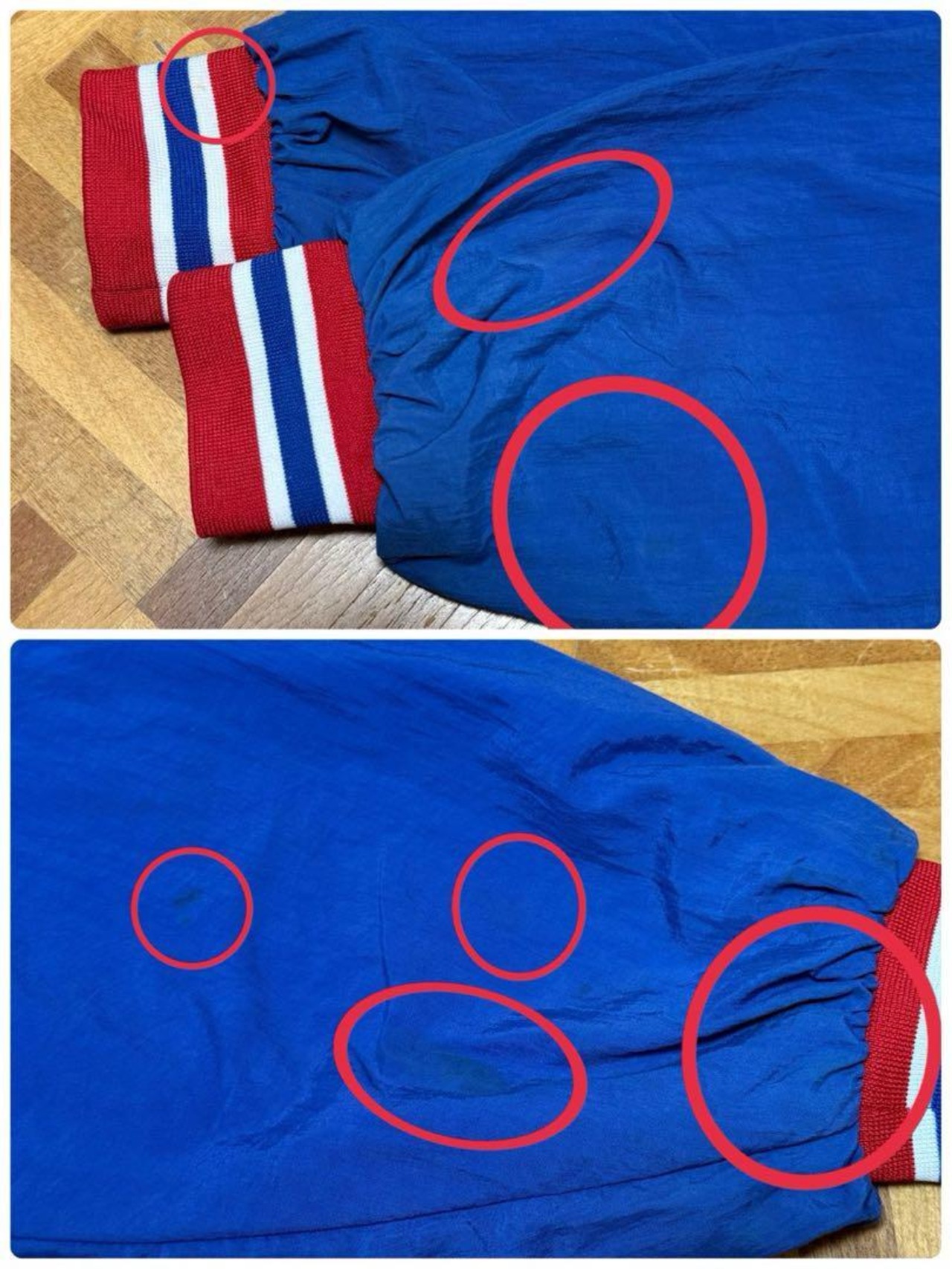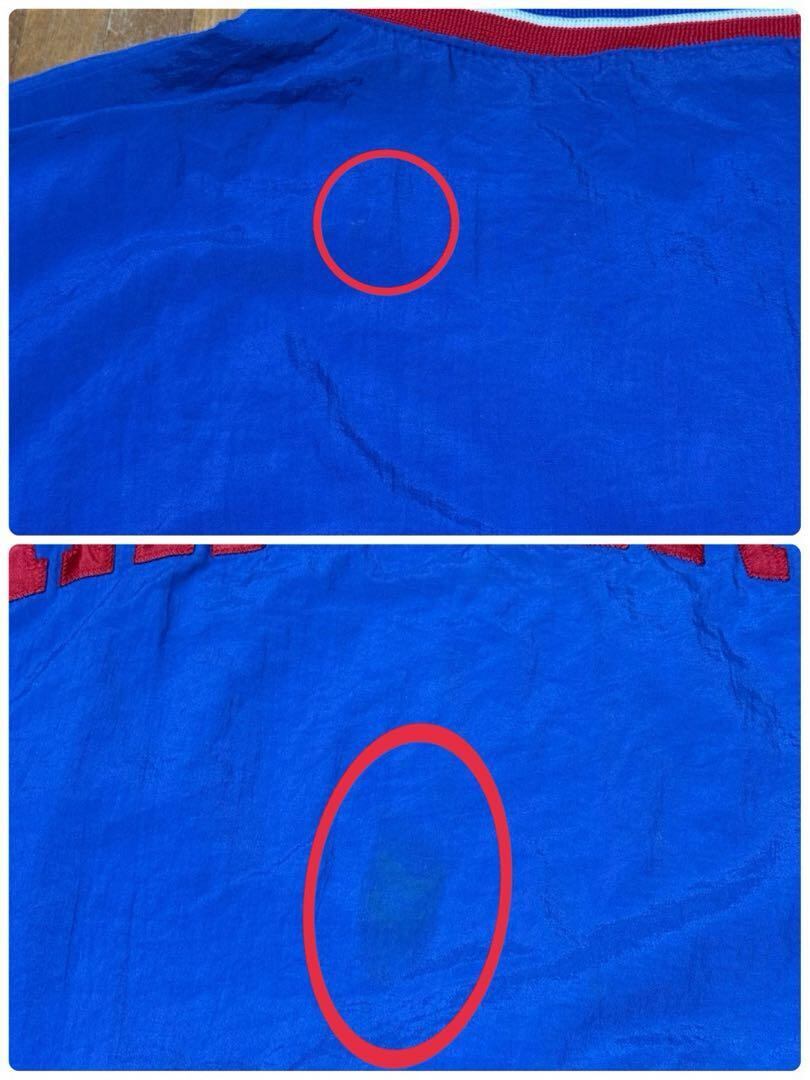袖、袖先ワッペン、お腹、バック首元下、前後裾薄汚れ数カ所あり。裏地右胸、バック左袖付けに薄汚れあり。