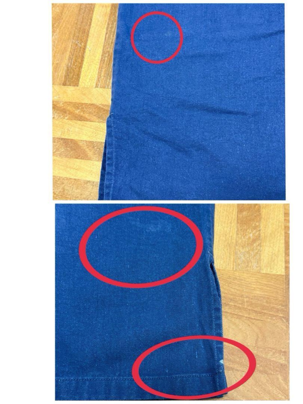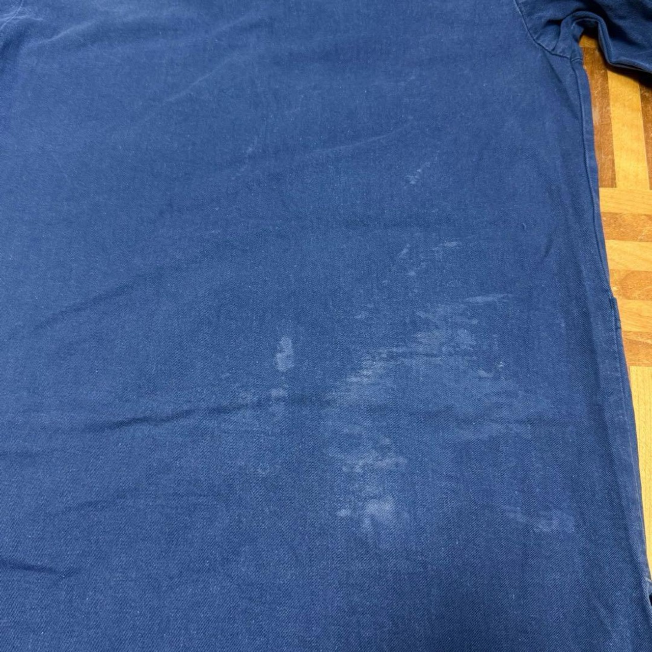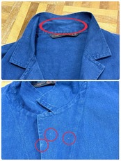 右袖、右下ポケット、生地引けダメージあり。襟周り内側、左襟裏側、袖、裾辺り、背中、腰辺り、バック右裾に薄汚れ数カ所あり。