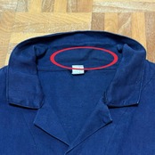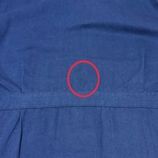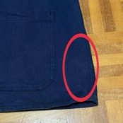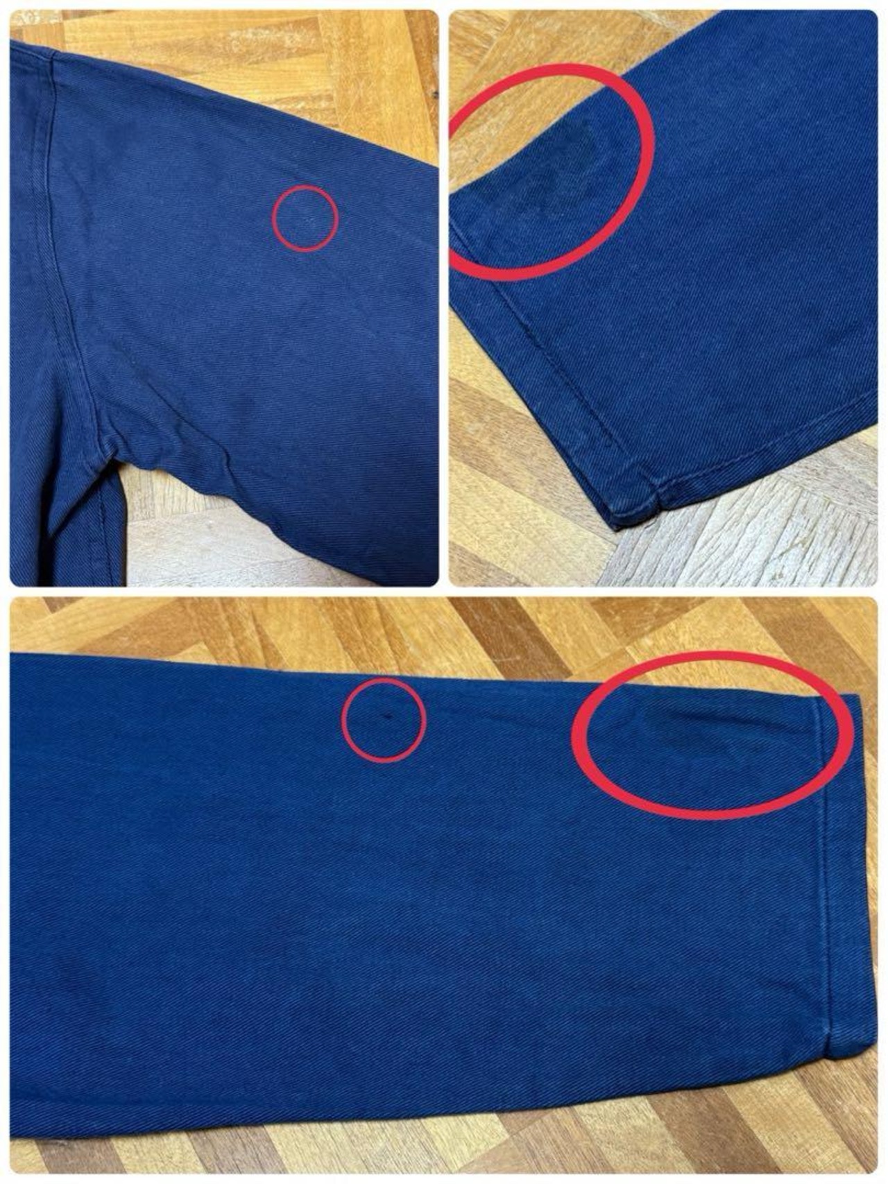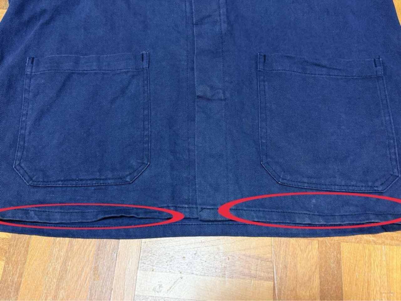 右袖先、首周り内側、裾、左裾上、腰上、薄汚れ数カ所あり。バック右袖生地引けダメージ数カ所あり。