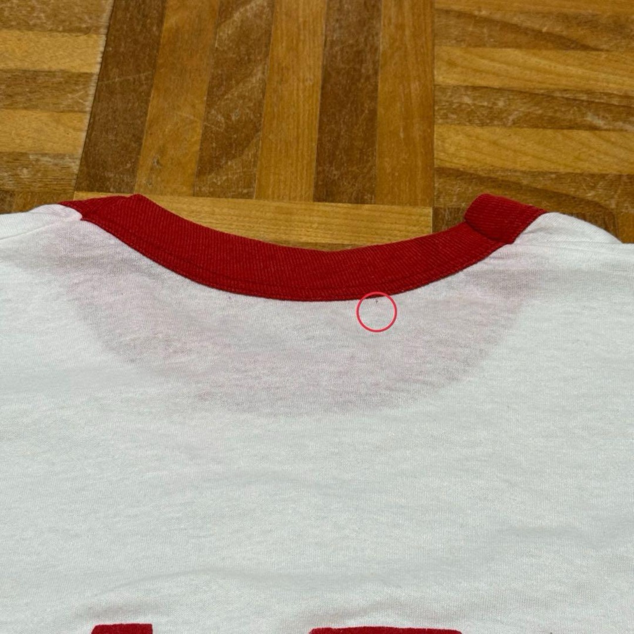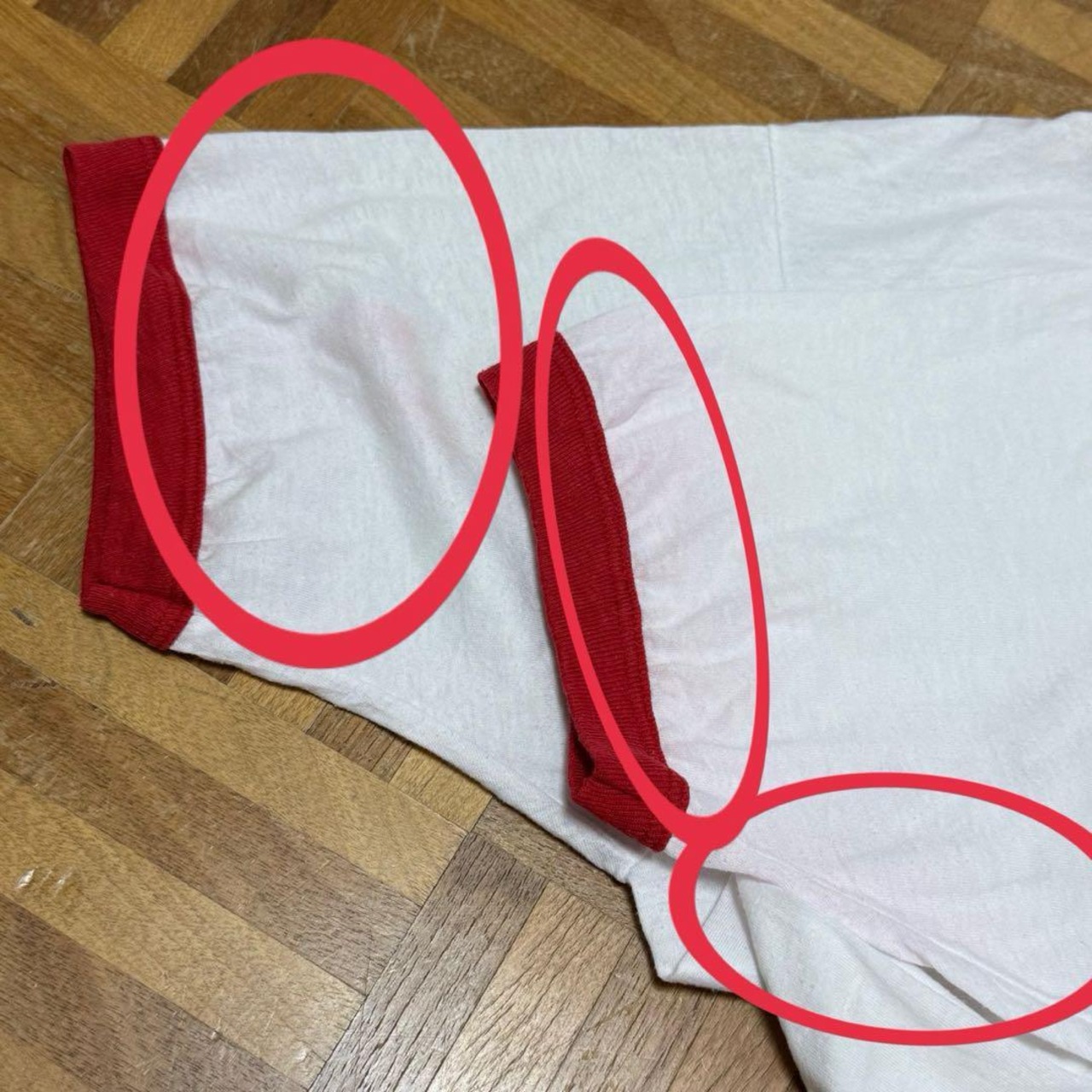 首周り、袖赤くなっているところ数カ所あり。右サイド薄汚れあり。バック首元ピンホールあり。