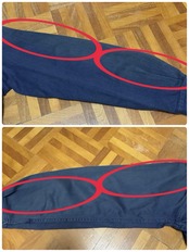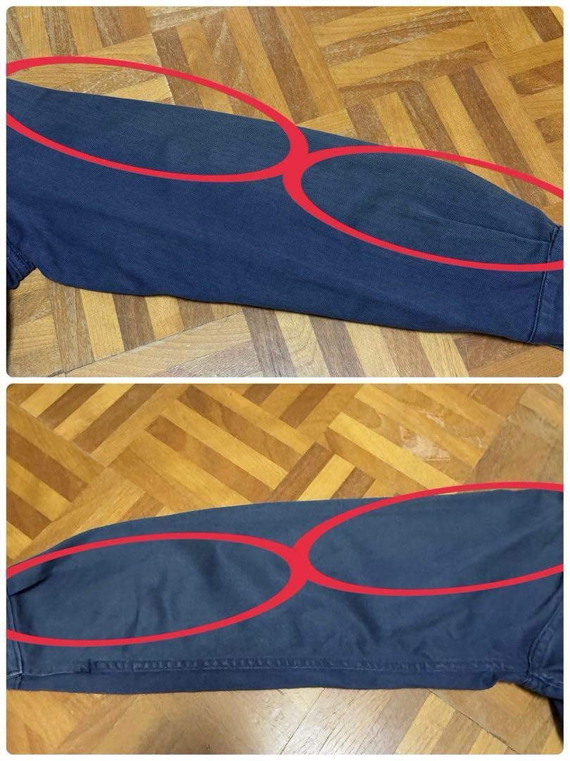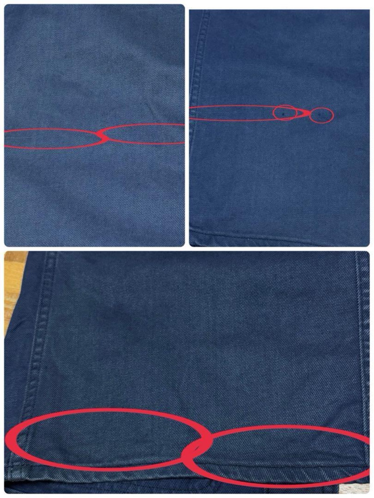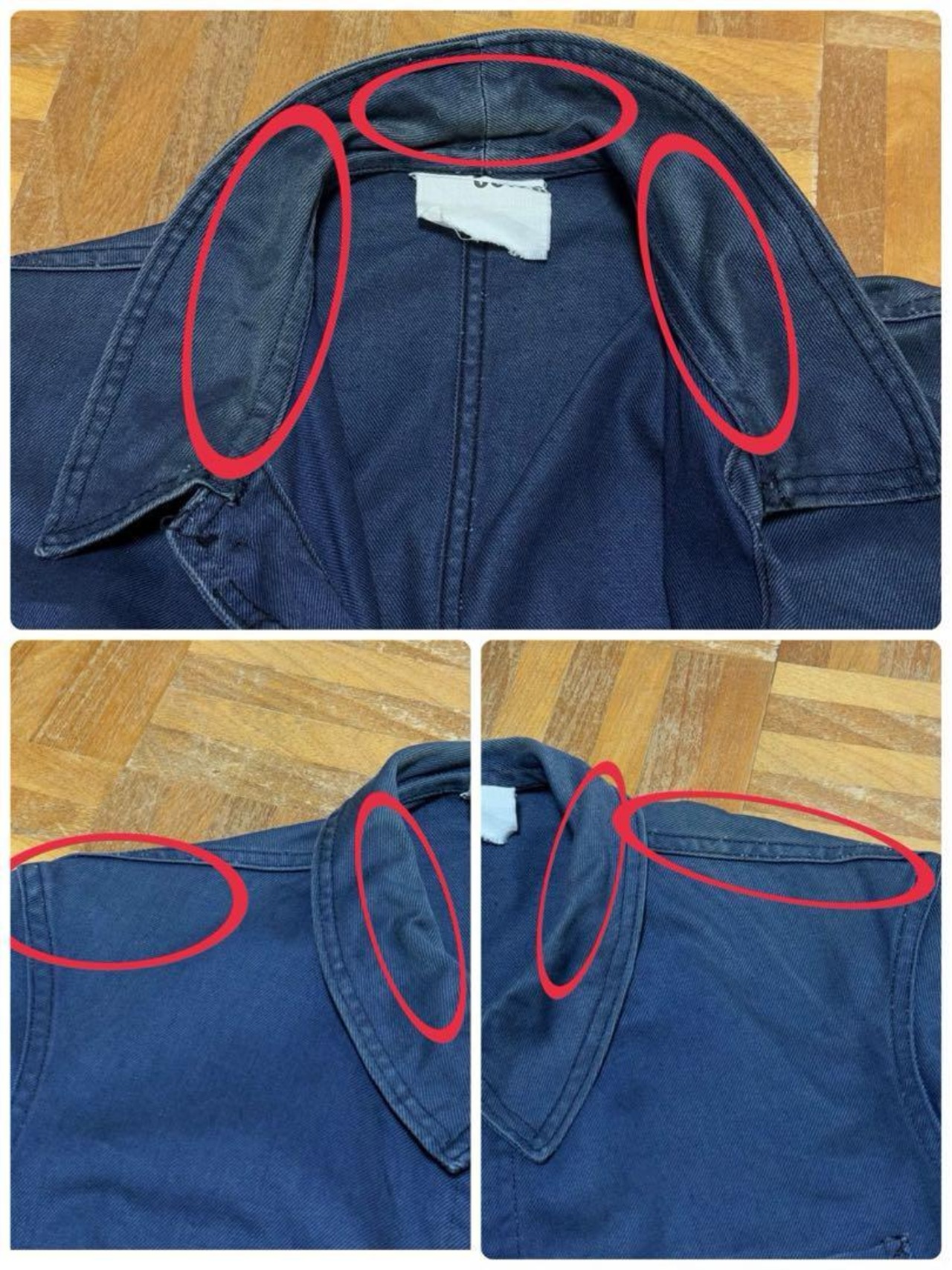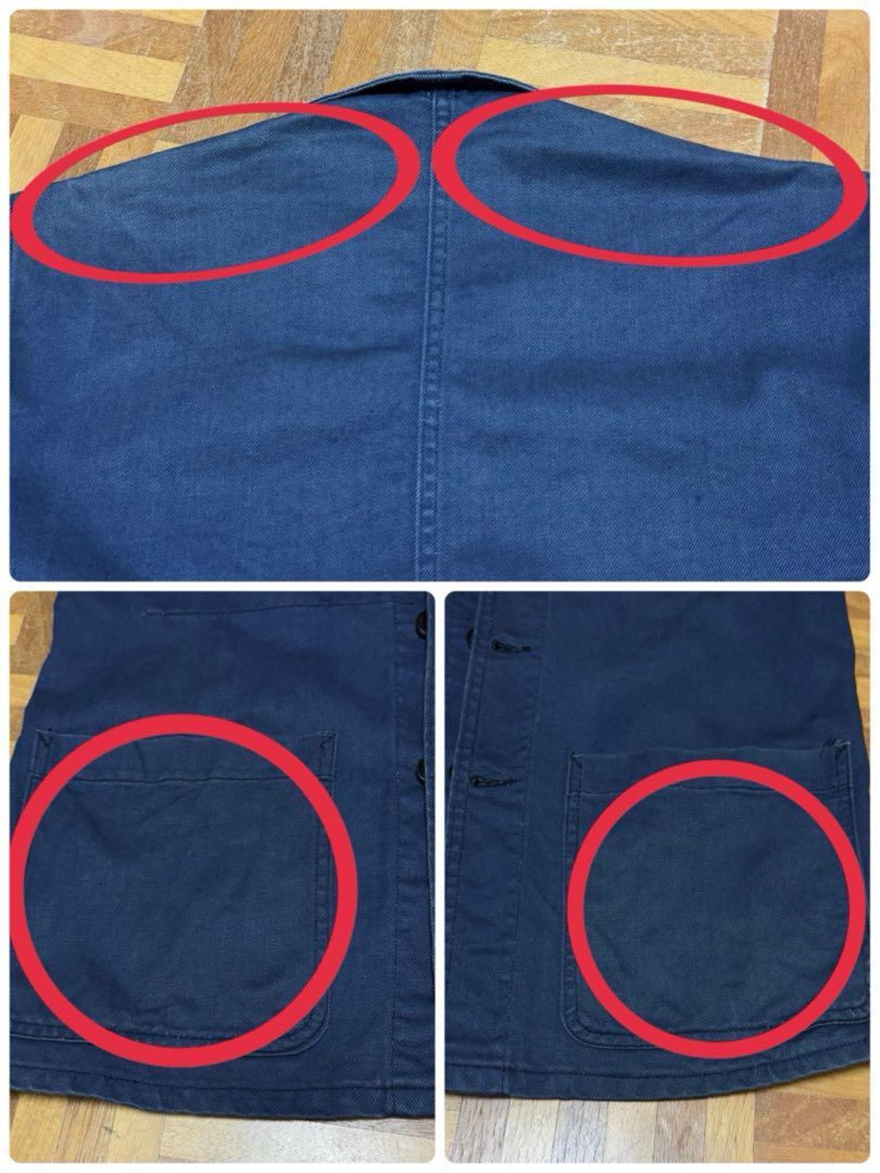 襟周り、左袖、前後肩周り。下ポケット、バック裾、薄汚れ数カ所あり。内側左脇下薄汚れあり。右袖、バック右裾、生地引け数カ所あり。背中、バック右裾生地難あり。