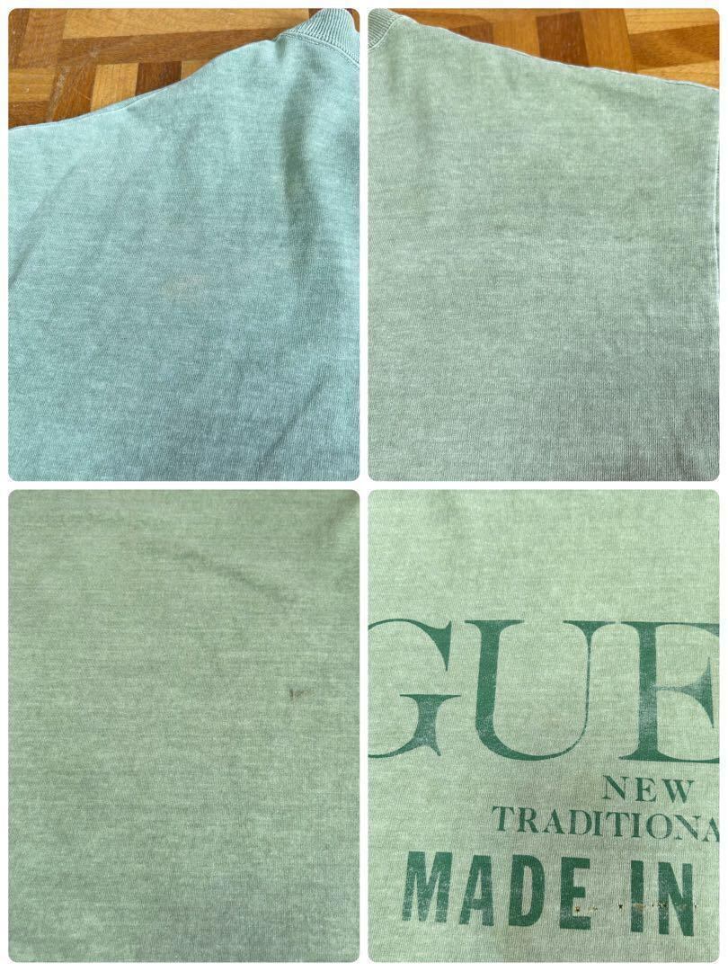 左脇下、プリント部分、プリント下辺り2m〜3m程度のピンホール数カ所あり。裾糸引けあり。プリント部分白っぽくなっています。左右裾辺り、バック左袖、バック左右肩下辺り、腰に薄汚れ数カ所あり。