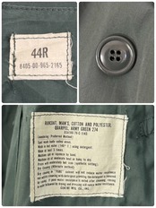 左1番上ボタン無し。左2番目ボタンかけあり。袖、襟、肩、右ポケット辺り、左裾、ベルト、バック左肩下、バック右ウエスト下、バック裾薄汚れ数カ所あり。袖、襟、肩辺り、バック裾、ベルト擦れで白っぽくなっているところ数カ所あり。内側、裾、右ポケット辺り、背中に薄汚れ数カ所あり。