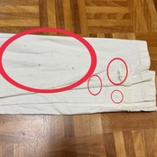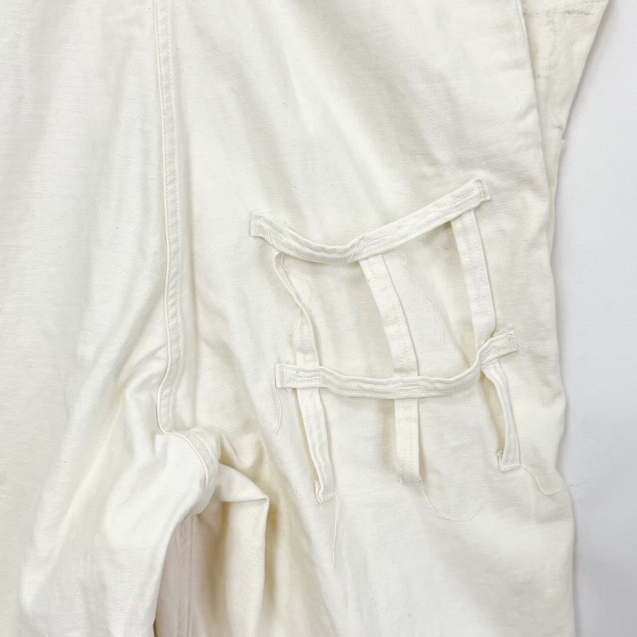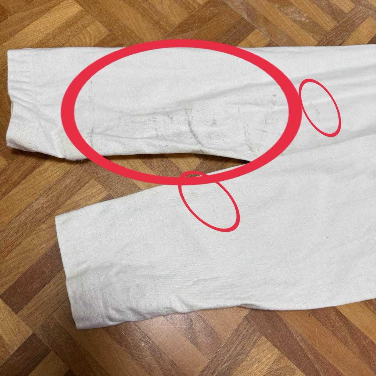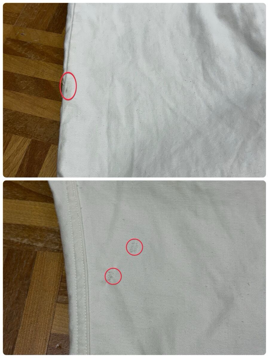 袖、左胸、左裾上、バック左太ももに薄汚れ数カ所あり。バック右膝辺り、リペア跡、生地引けダメージあり。