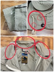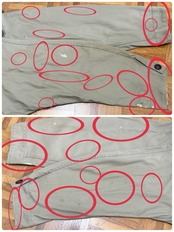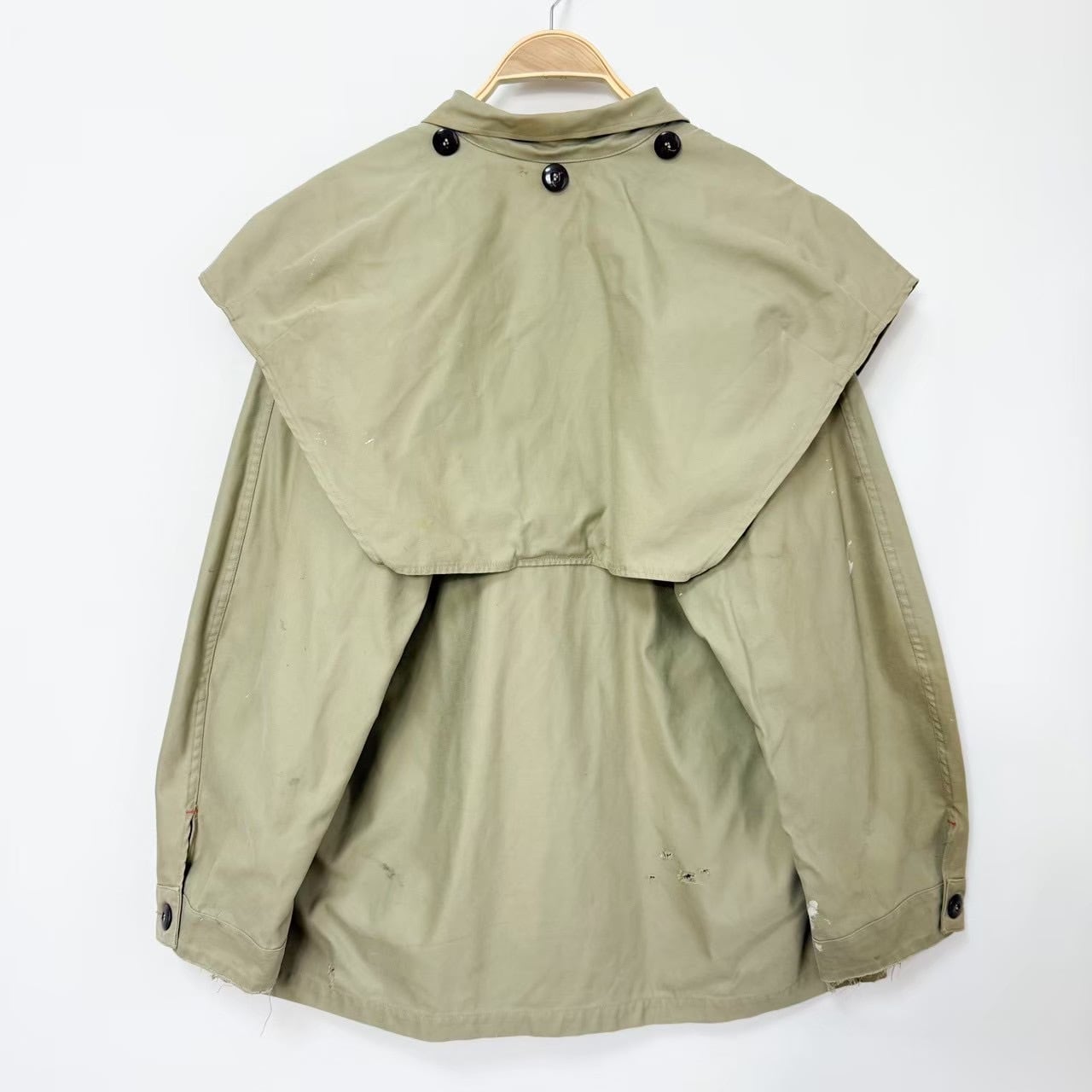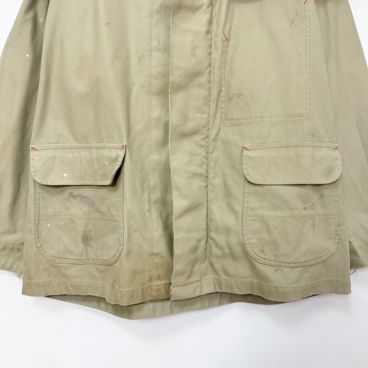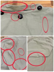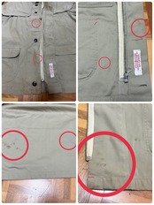 フード内側、袖、襟周り、前後肩、胸、お腹、前後裾、左右下ポケット、バック首元、背中、薄汚れ数カ所あり。左袖、袖先、裾、右ポケット横、バック右脇、バック裾辺り5㎜〜2.5㎝程度のダメージ数カ所あり。バック右袖全体的に薄汚れあり。内側首元紐片方取れています。フード2箇所、フロント3、5番目ボタン無し。内側裾辺り薄汚れ数カ所あり。バック右肩下生地難あり。