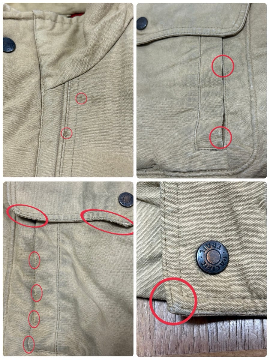 襟周りジップありますが、付属品無し。袖先、首元下、ポケット口、裾、5㎜〜1.5㎝程度のダメージ数カ所あり。袖、襟周り内側、胸辺り、背中、全体的に色褪せ、色むら数カ所あり。袖、右胸、お腹、左右ポケット辺り、裾、薄汚れ数カ所あり。背中、擦れで白っぽくなっているところ数カ所あり。