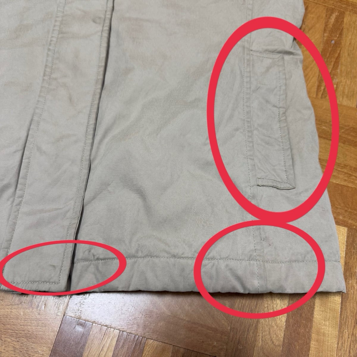 袖、左胸、お腹、左右ポケット口、バック左脇辺り、背中、前後裾、バック右サイド、内側裾に薄汚れ数カ所あり。