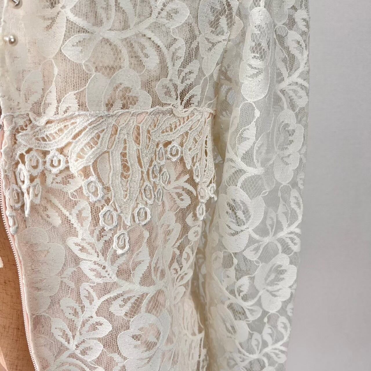 繊細なフローラル総レースに、ハイネックとヨーク切替を組み合わせたロマンティックな一着です。