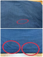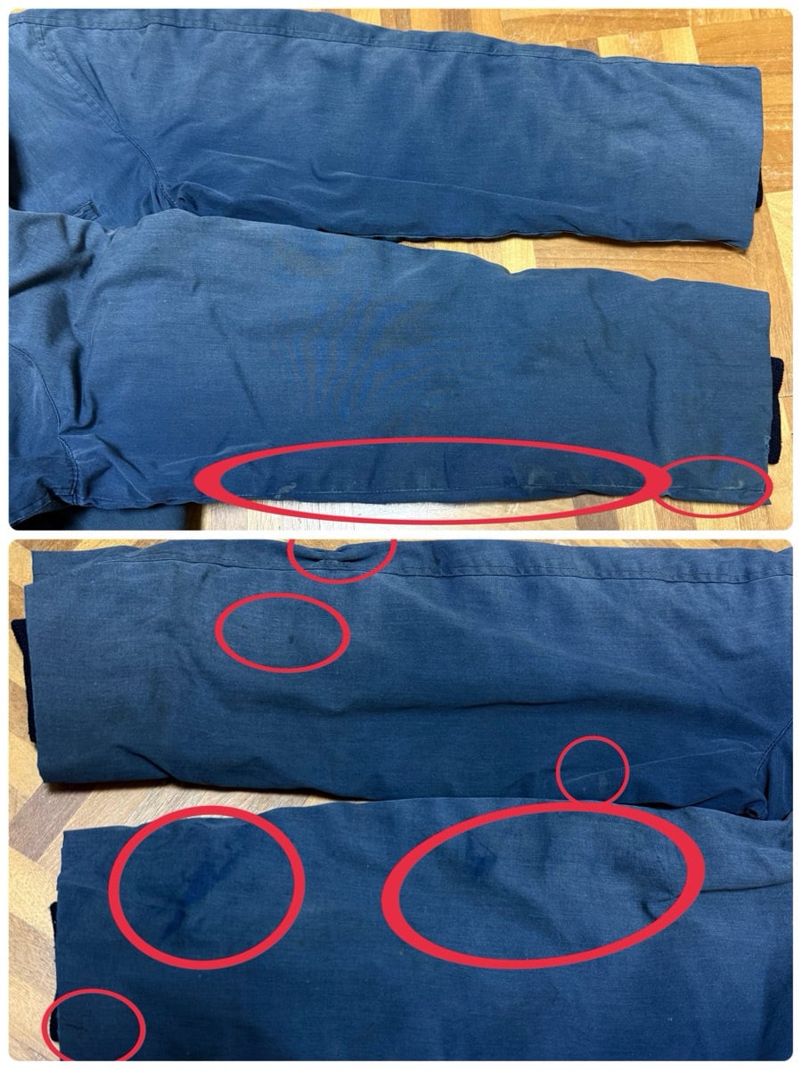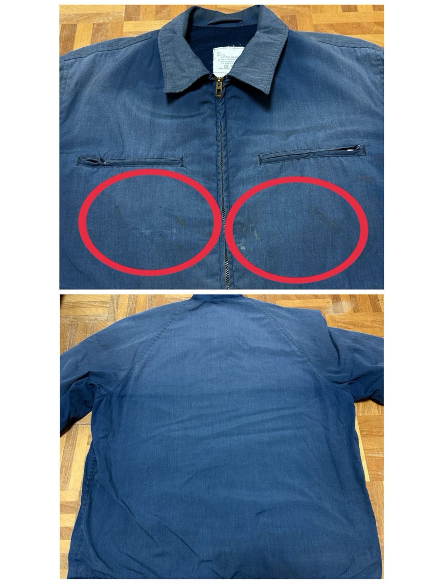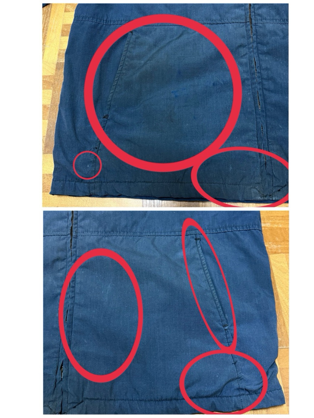 右袖リペア跡あり。袖、襟周り内側、胸、お腹、前後裾、ポケット口、薄汚れ数カ所あり。袖、首元、色むら数カ所あり。襟、袖、胸、背中色褪せ数カ所あり。バック右袖付け横生地難あり。袖先擦れダメージあり。