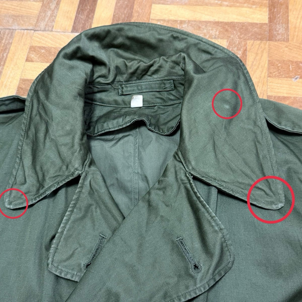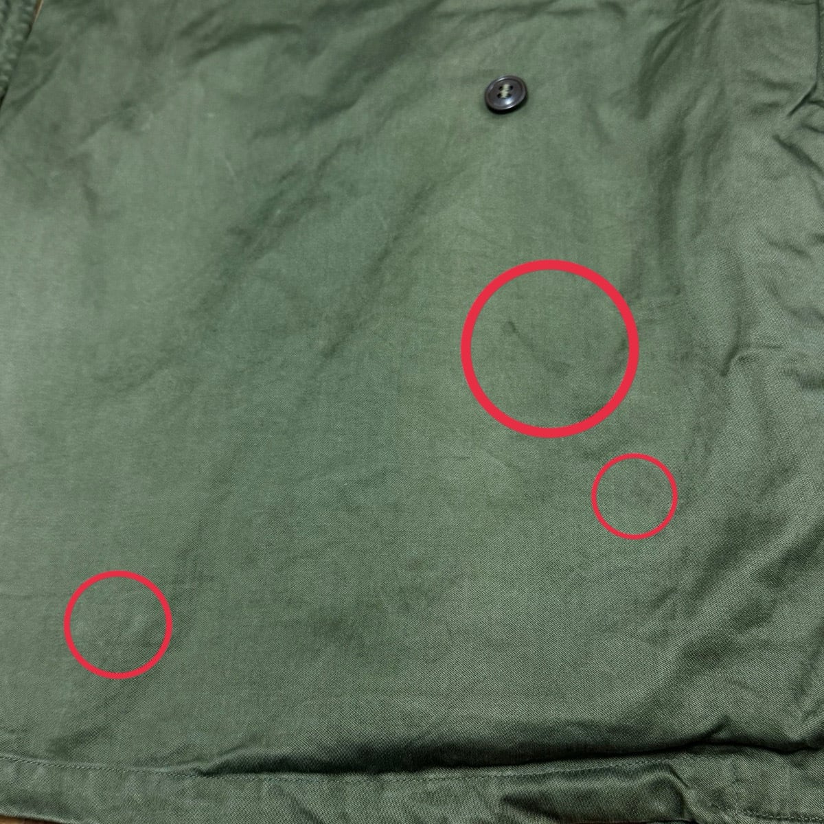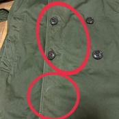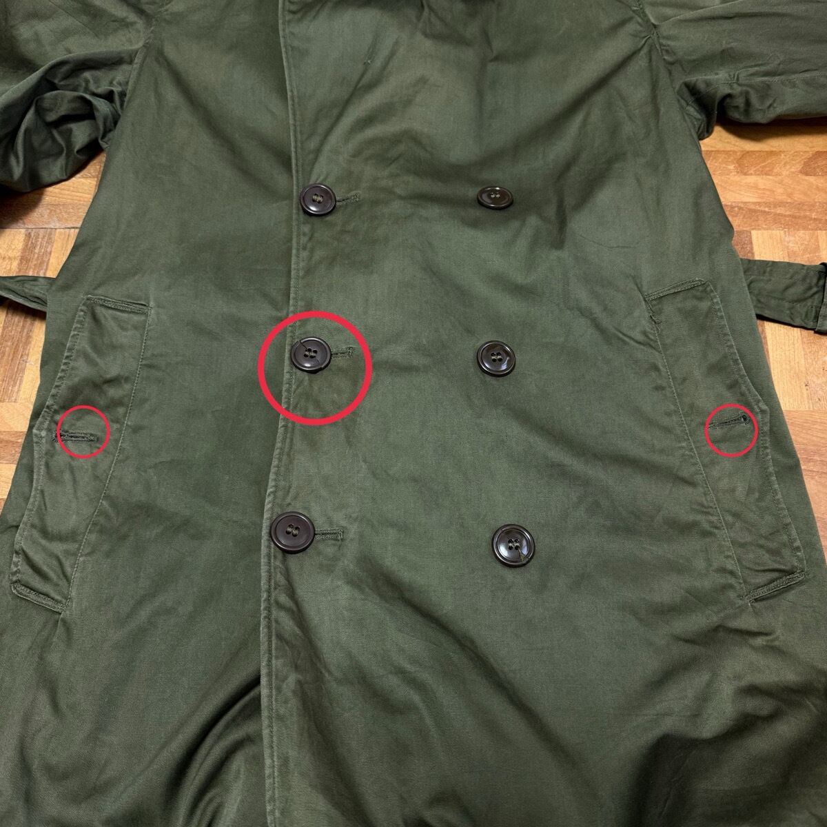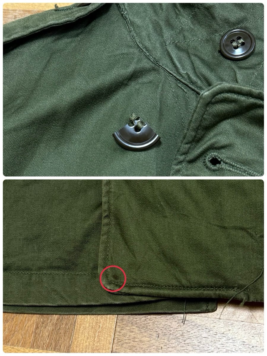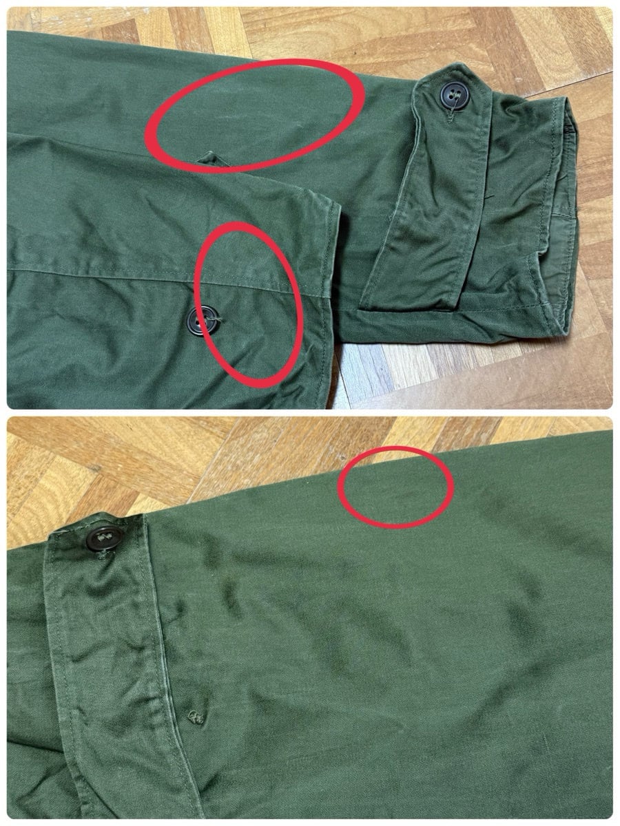袖、襟先、裾、3番目ボタン下擦れで白っぽくなっているところ数カ所あり。右袖、裾辺り薄汚れ数カ所あり。左襟裏のボタンのあたりあり。フロント首元横ボタンかけあり。左右ポケットボタン無し。フロント2番目ボタン割れあり。フロントボタン辺り若干色褪せあり。