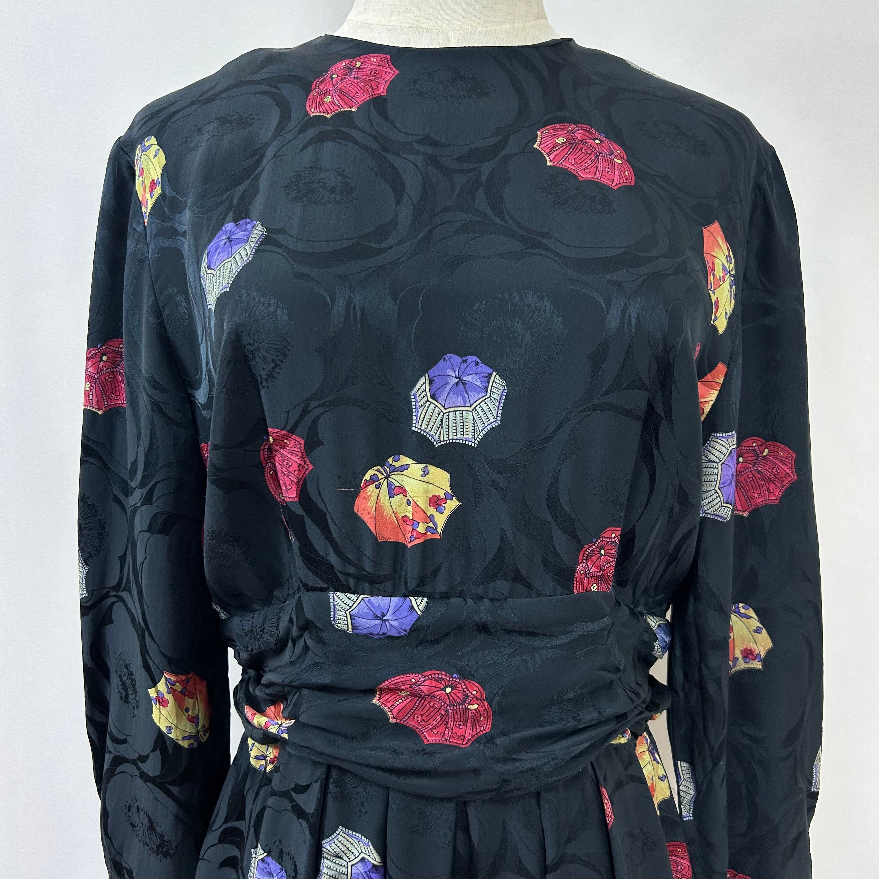 アンブレラ 傘 総柄 プリント 膝下丈 ロング丈 長袖 シルク ワンピース
