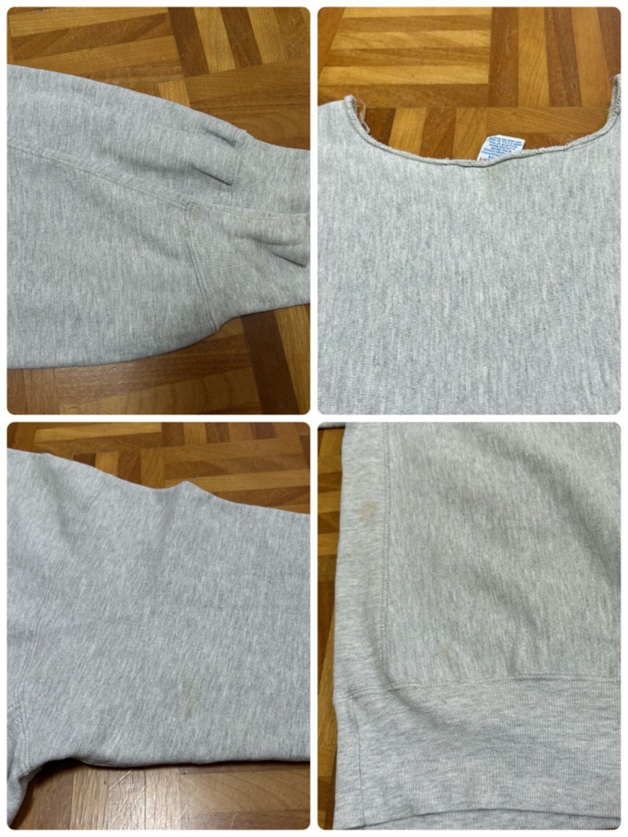 袖、前後首元、右胸、右脇、お腹、右サイド、裾上、バック裾内側、バック左サイドに薄汚れ数カ所あり。首元切ってリメイクしてあります。
