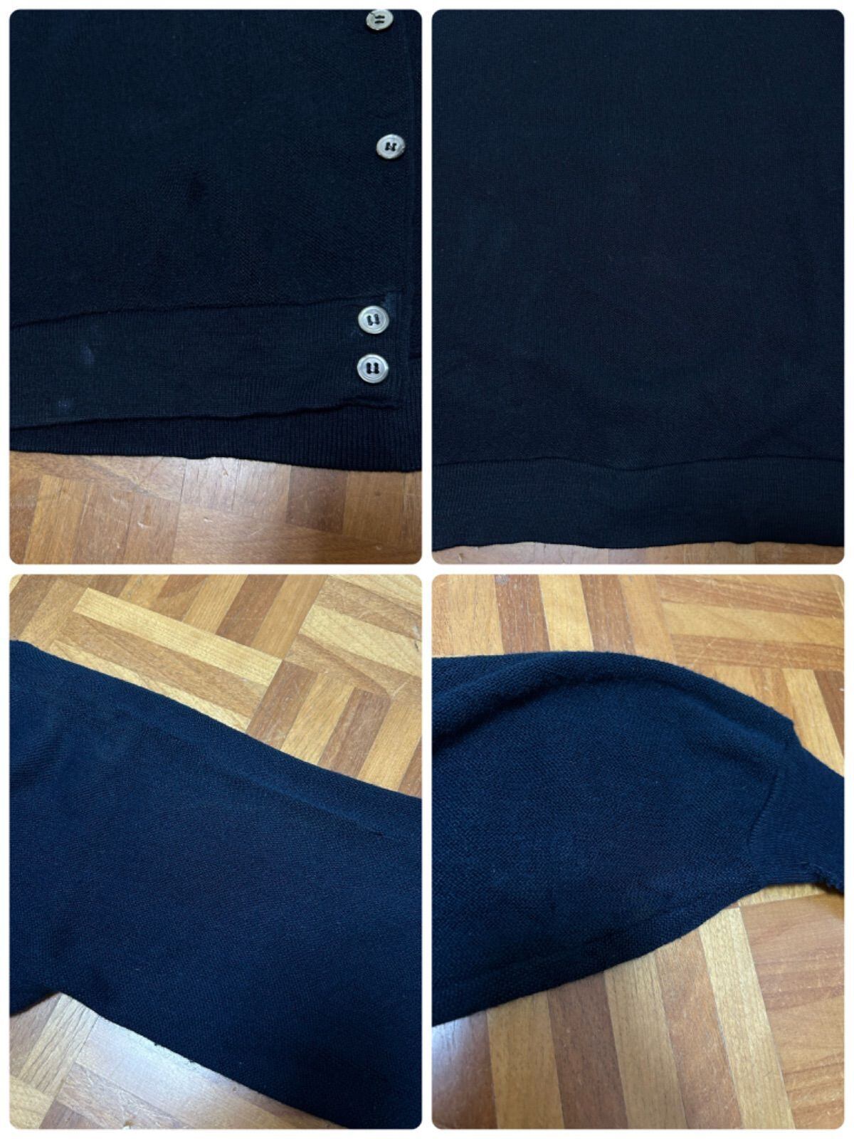 左袖3㎜程度のダメージあり。袖、バック腰辺り薄汚れ数カ所あり。毛玉あり。