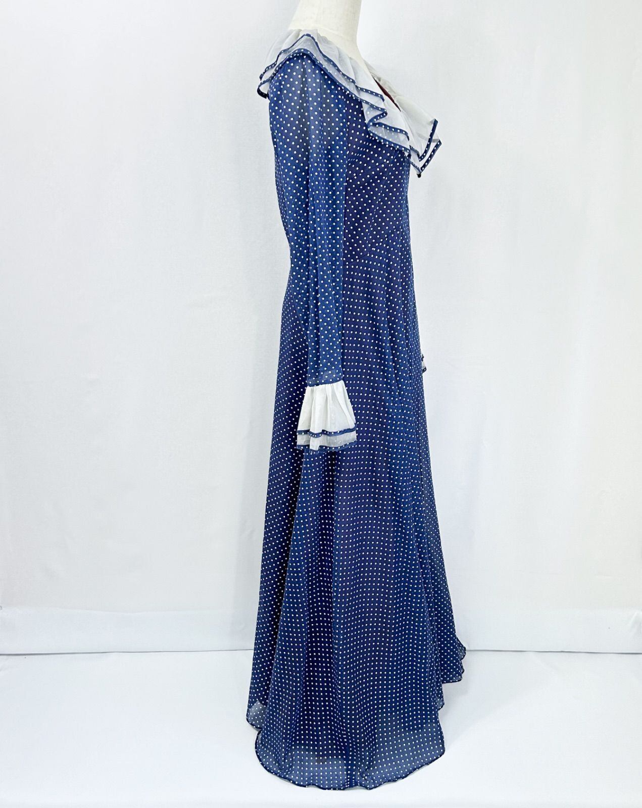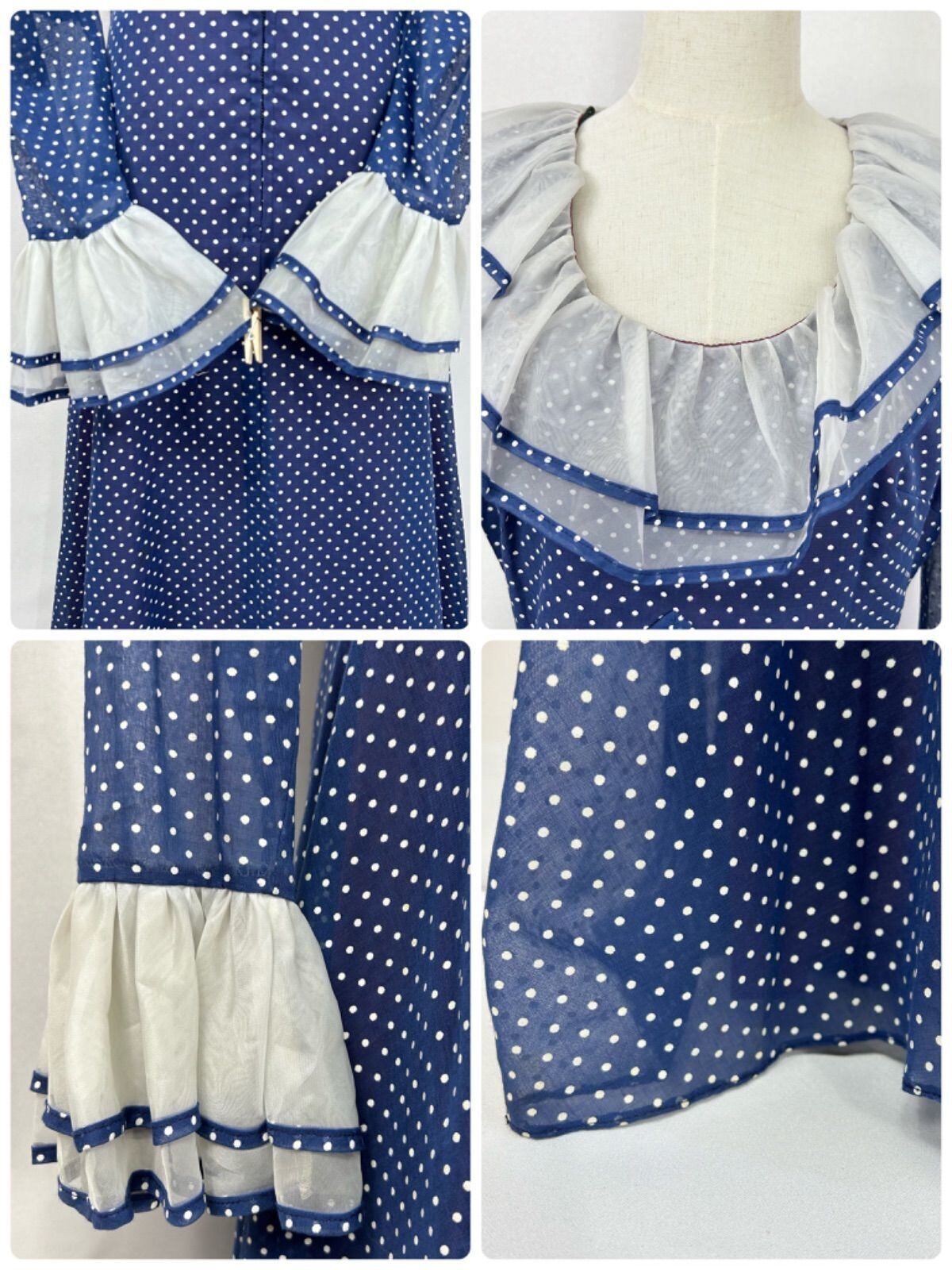 ビンテージ 70s 80s ユニオンメイド ティアードフリル襟 ドット柄 長袖 ロングフレアワンピース ドレス