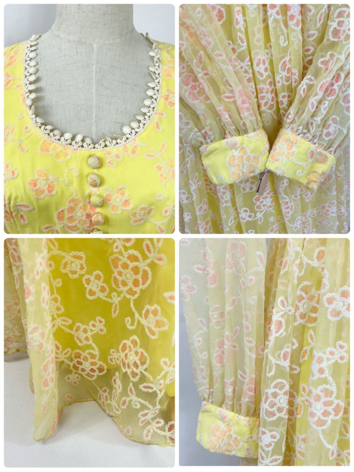 ヴィンテージ USA製 花柄 刺繍 首元レース イエロー ロングフレアワンピースドレス