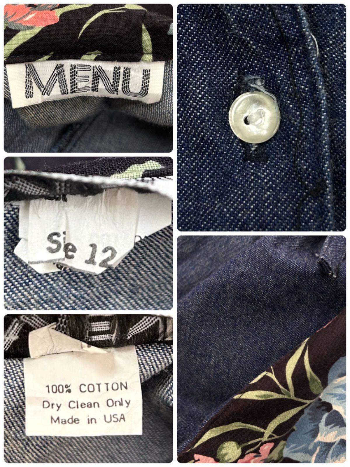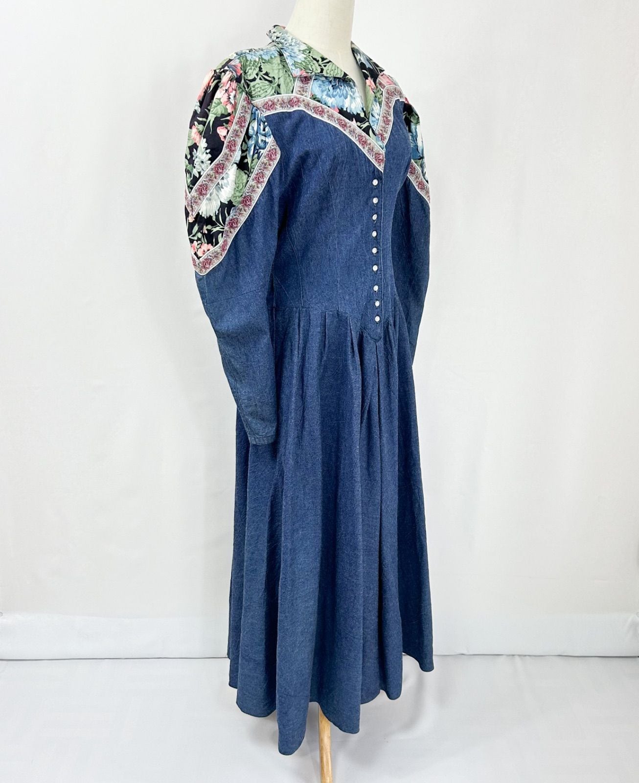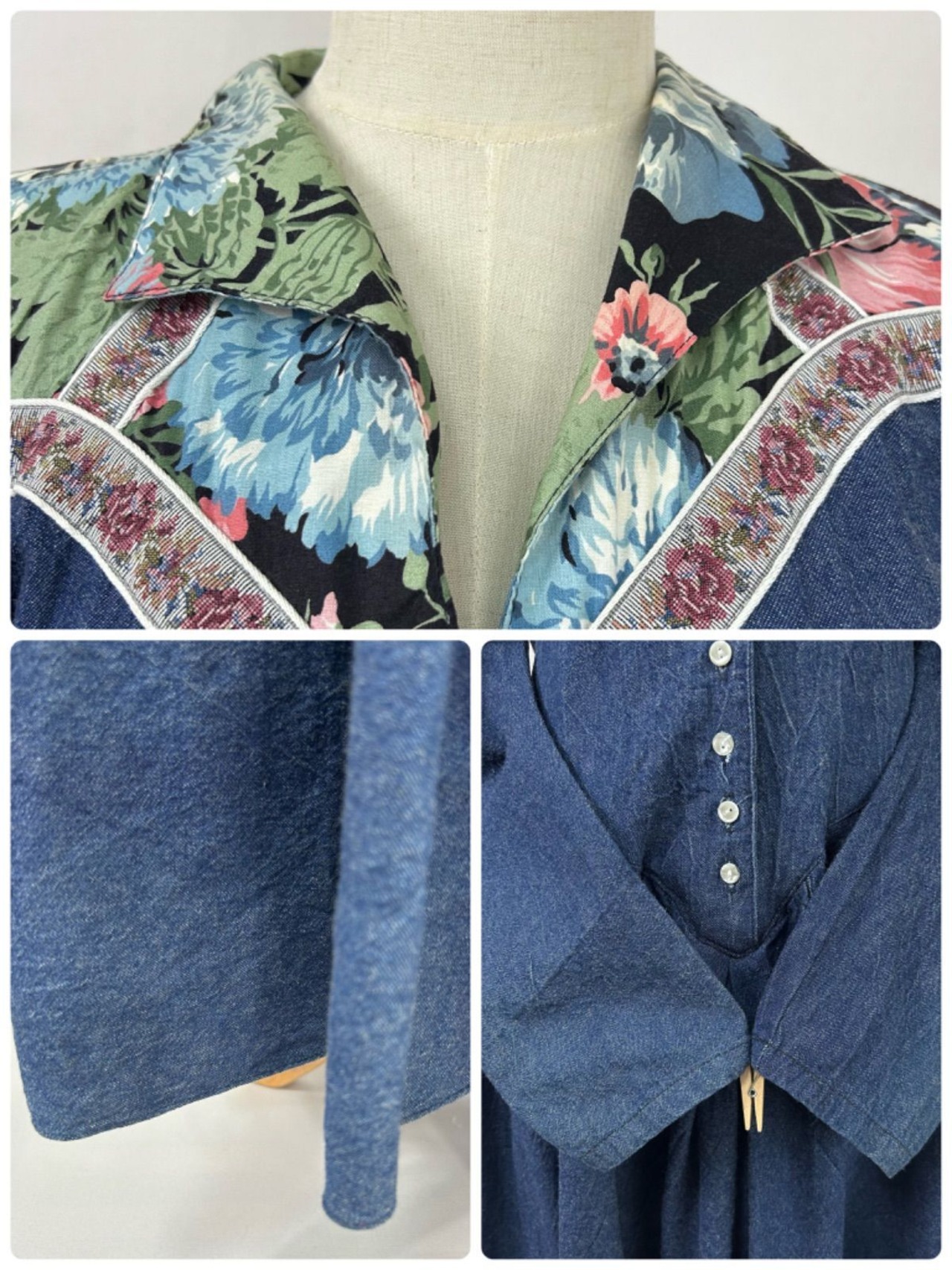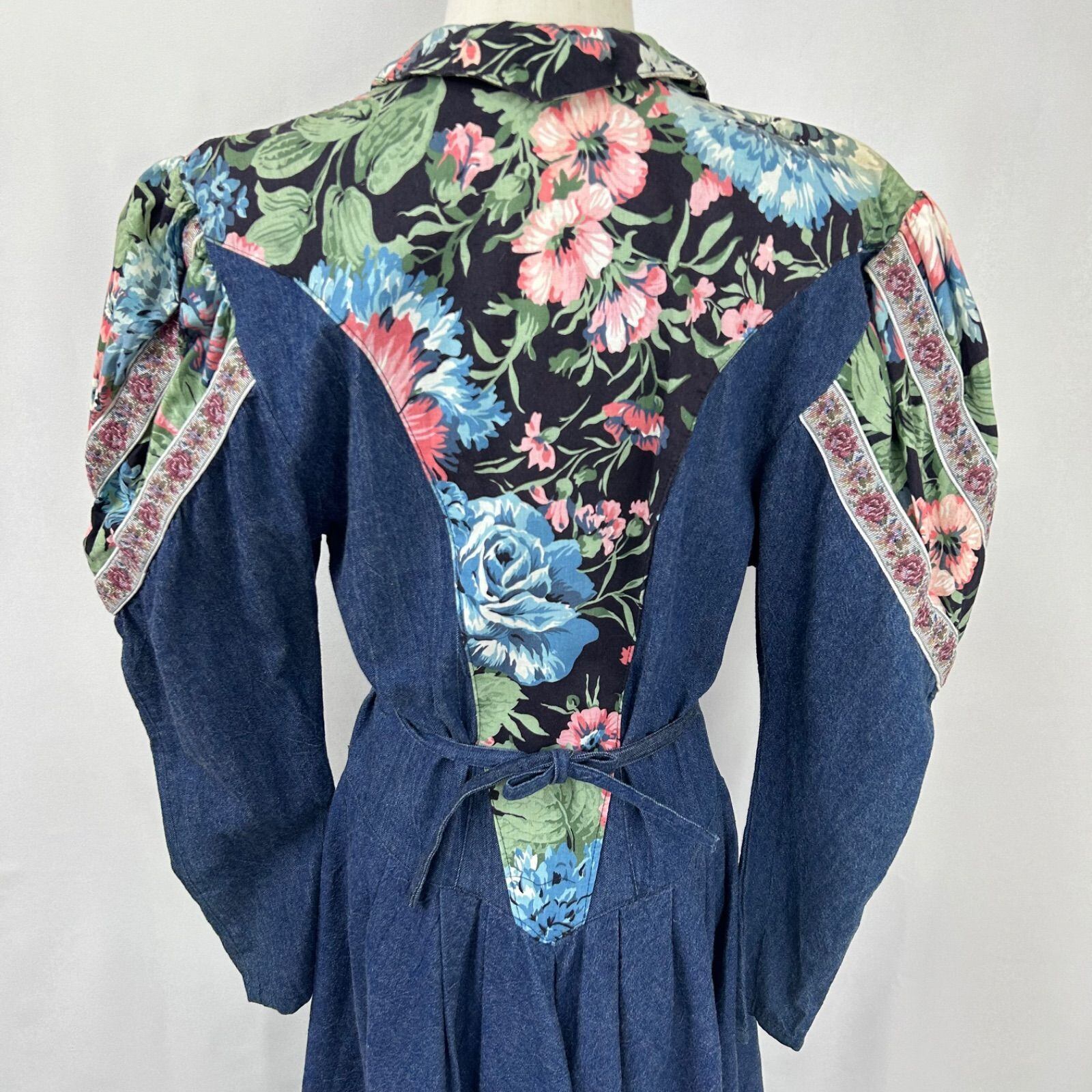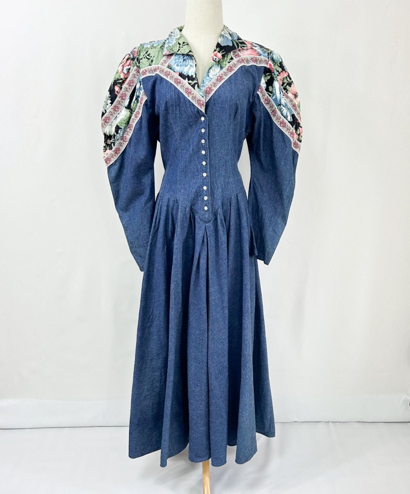 80s USA製 花柄 切り替え パフスリーブ デニム ロングワンピース