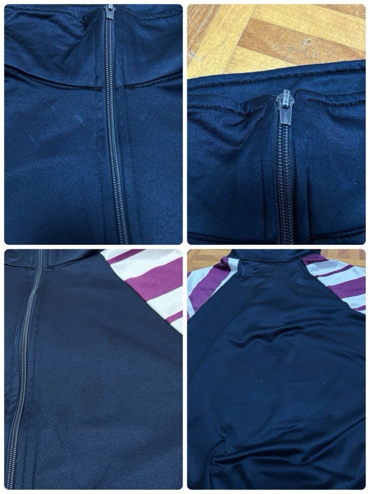 フロントジップの先折れています。袖、左胸、バック右肩、背中に薄汚れ数カ所あり。フロント、バック、袖所々薄っすら毛羽立ちあり。首元下、あたりの様なもの数カ所あり。