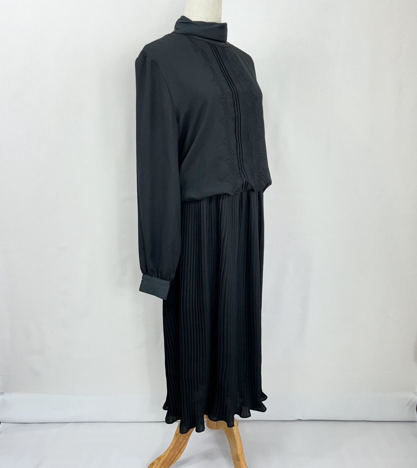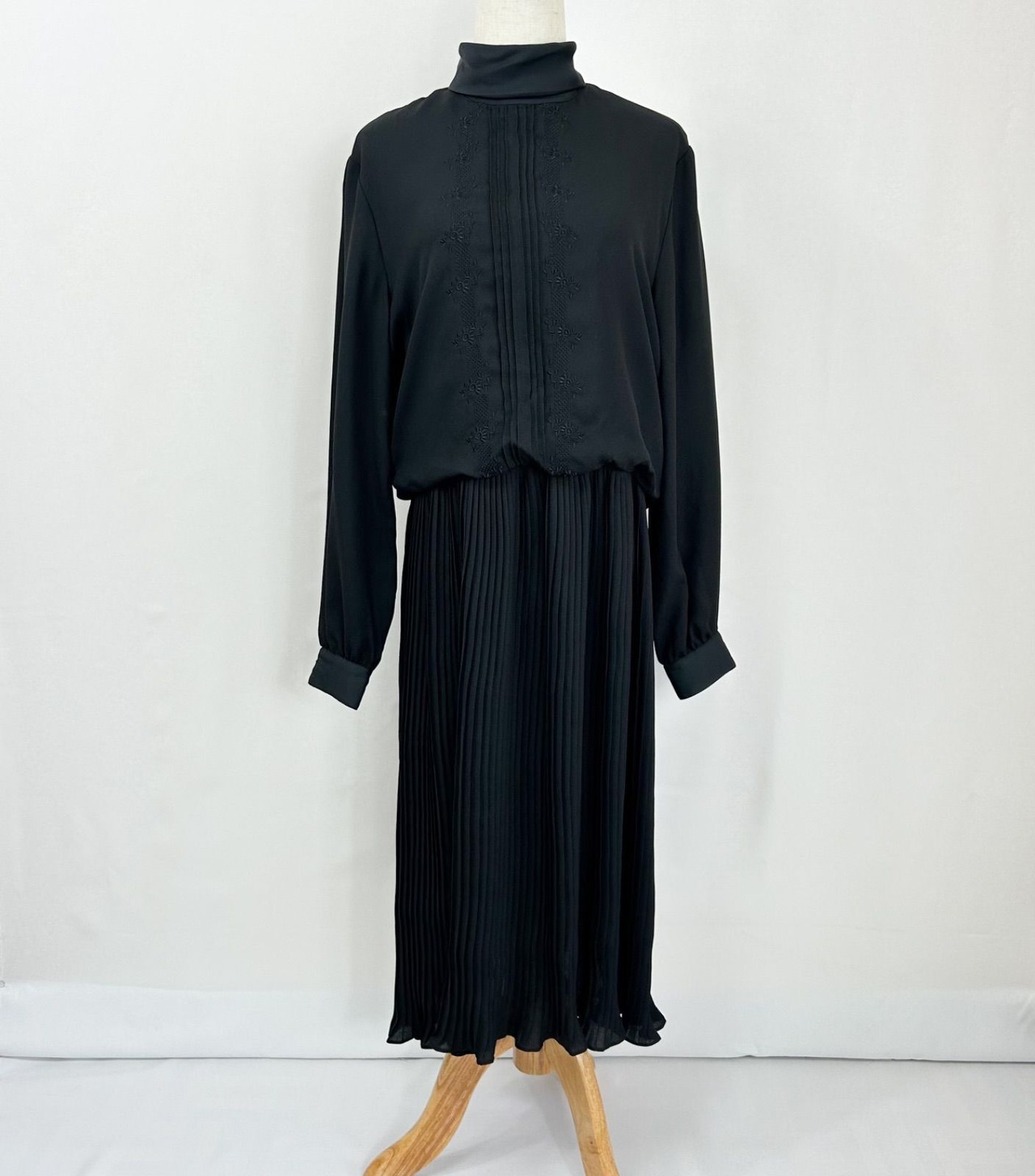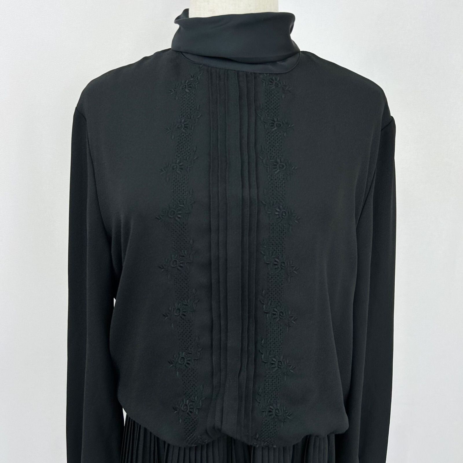 花柄刺繍 ピンタック ハイネック プリーツ 長袖 ロング丈 ワンピース