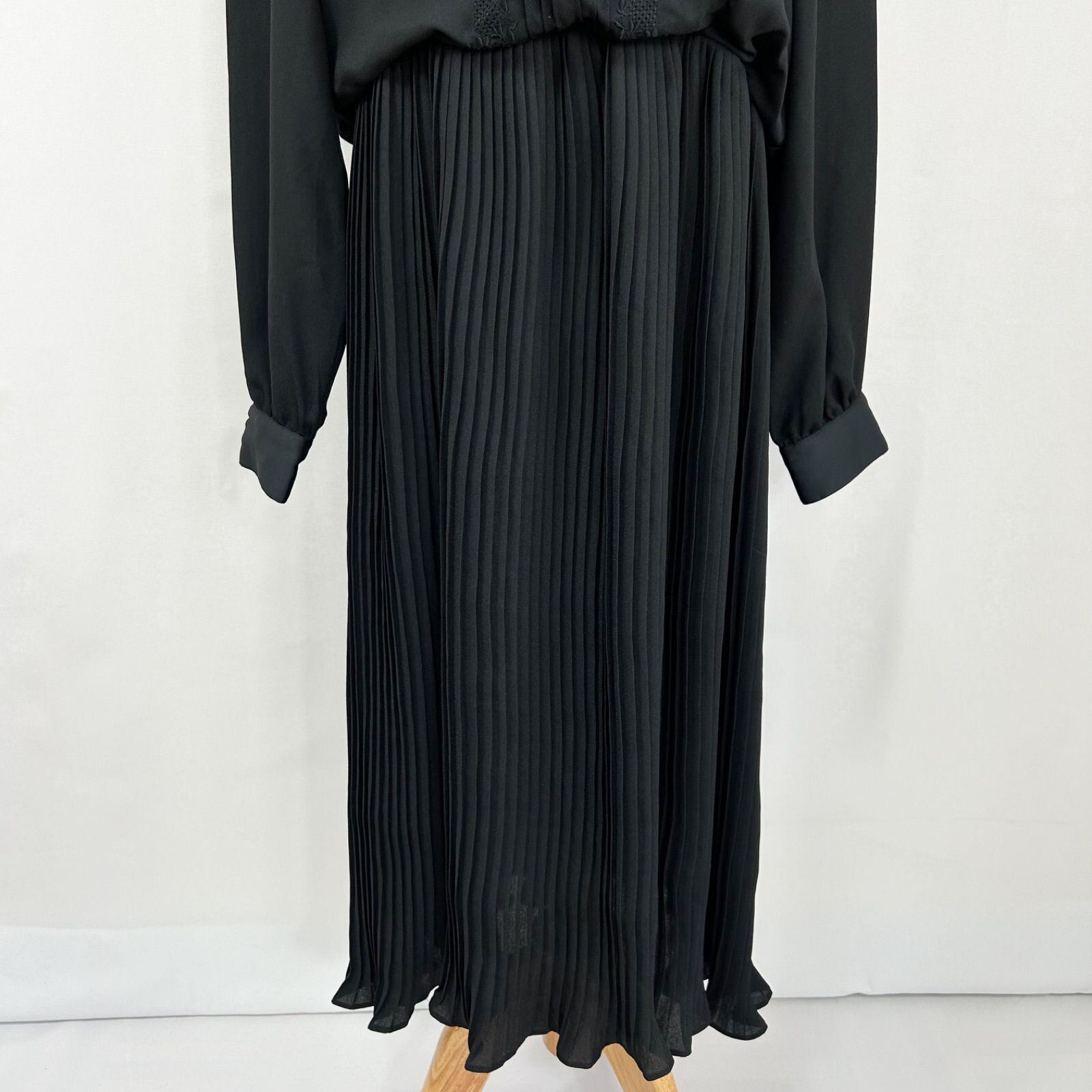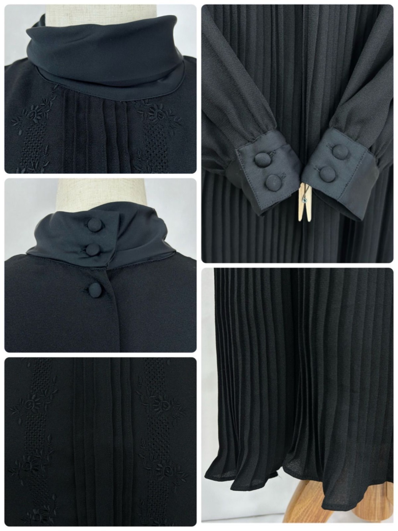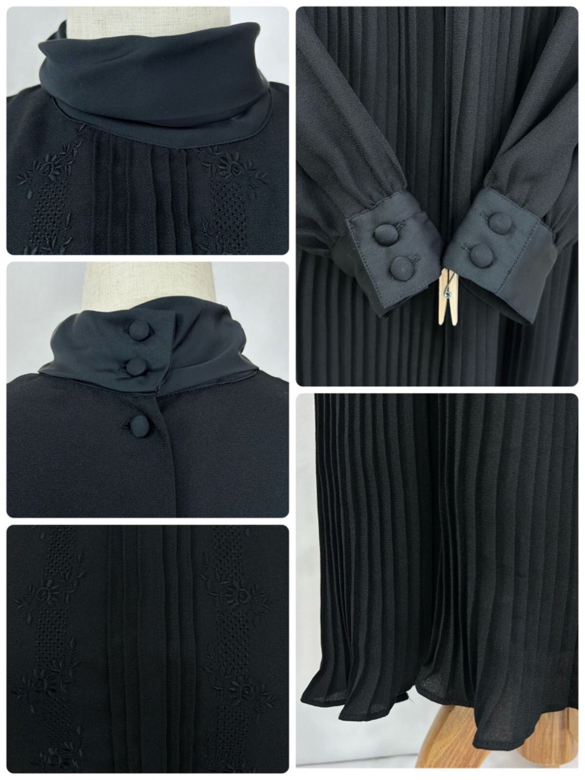 花柄刺繍 ピンタック ハイネック プリーツ 長袖 ロング丈 ワンピース