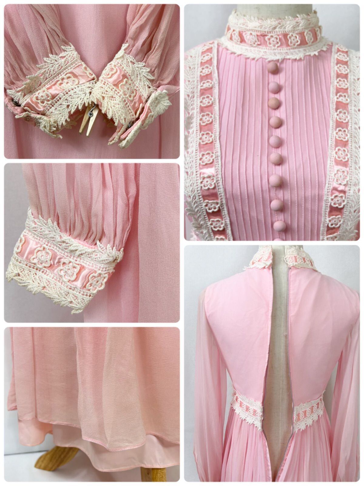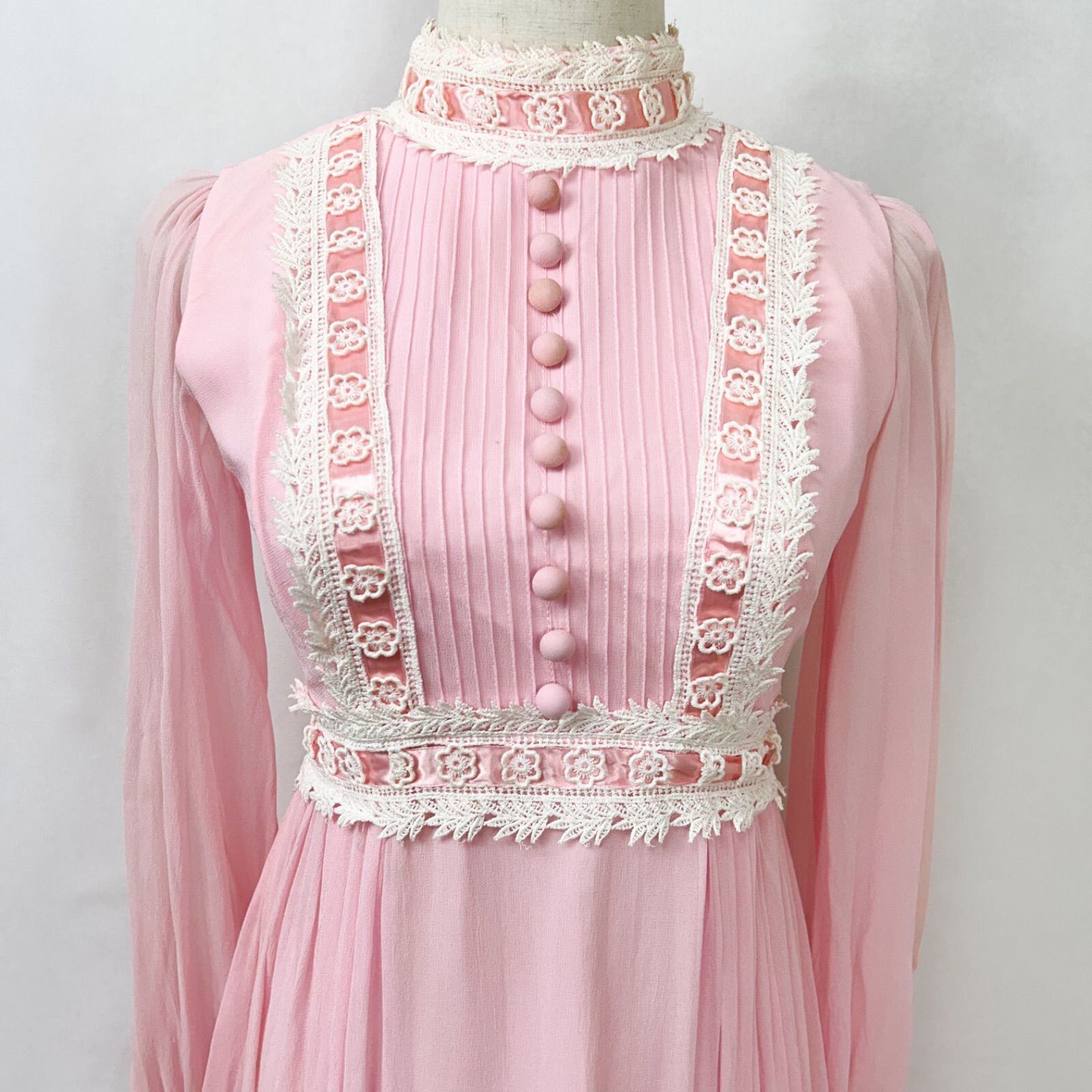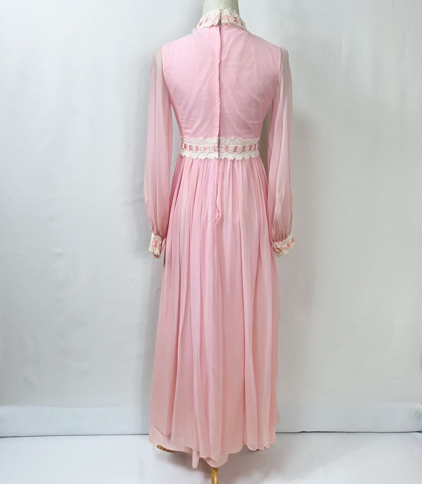 60s USA製 ハイネック ハシゴレース 長袖 袖シースルー ロングワンピース ドレス
