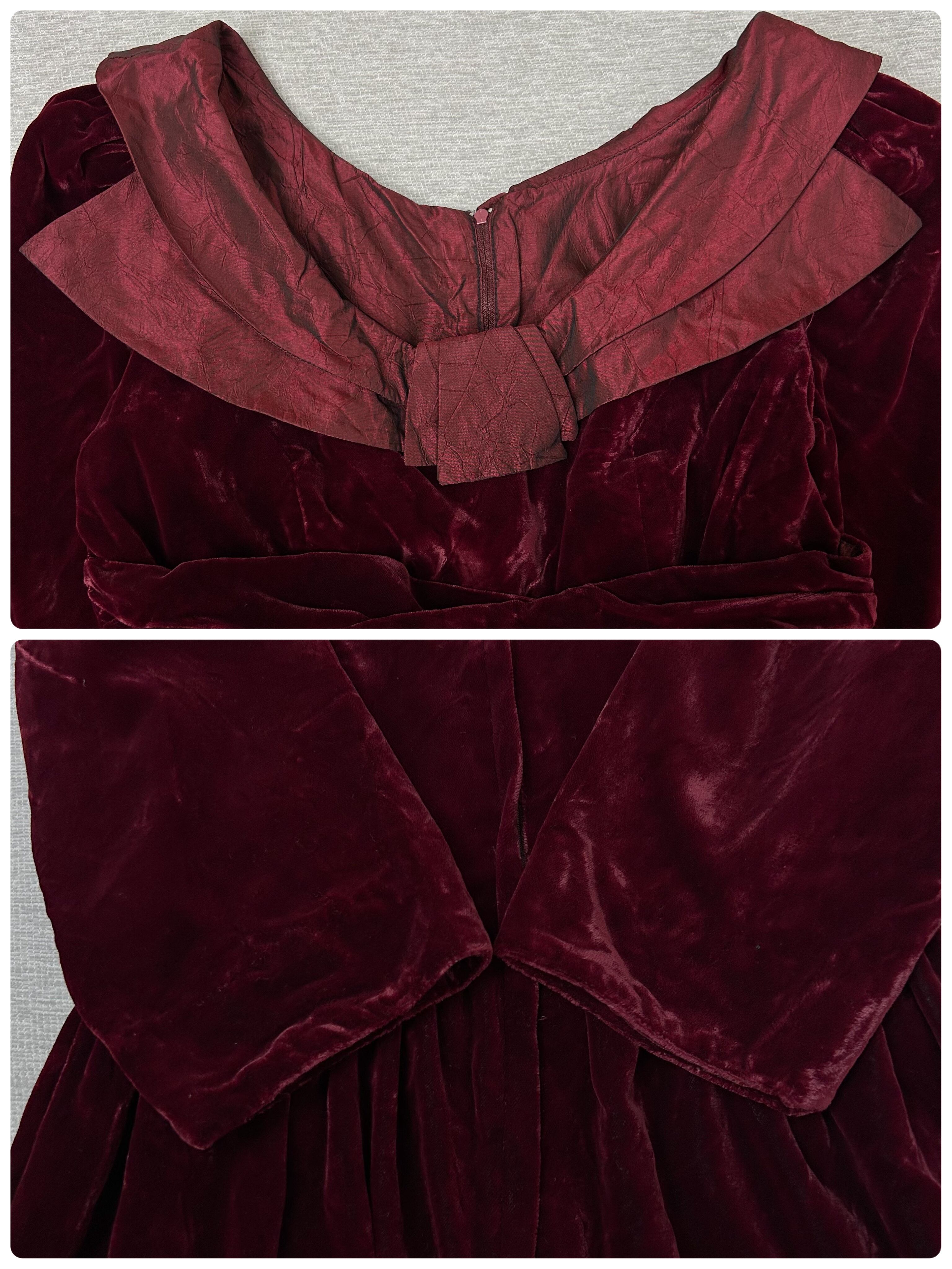 80s〜 ビンテージ USA製 襟リボンデザイン 七分袖 膝下丈 ベロア ドレス ワンピース