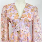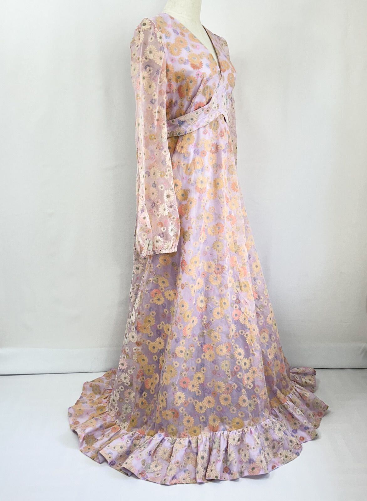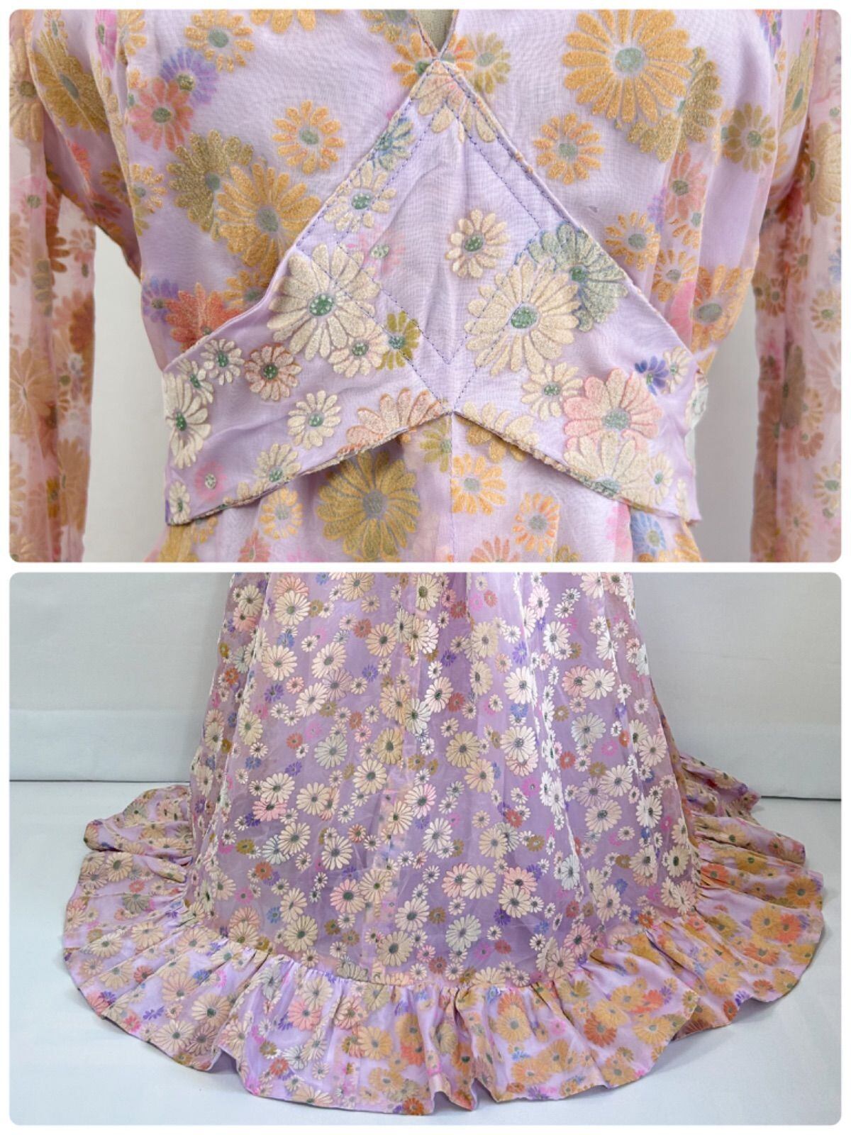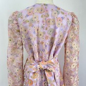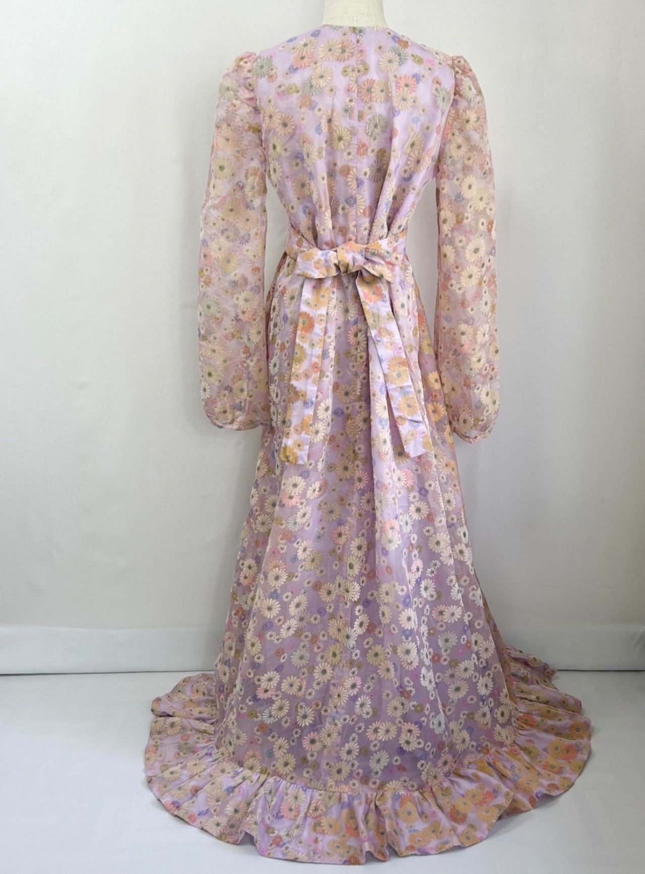 マーガレット 花柄 総柄 フロッキープリント 袖シースルー 裾フレアウエストリボン 長袖 ロングワンピース ドレス