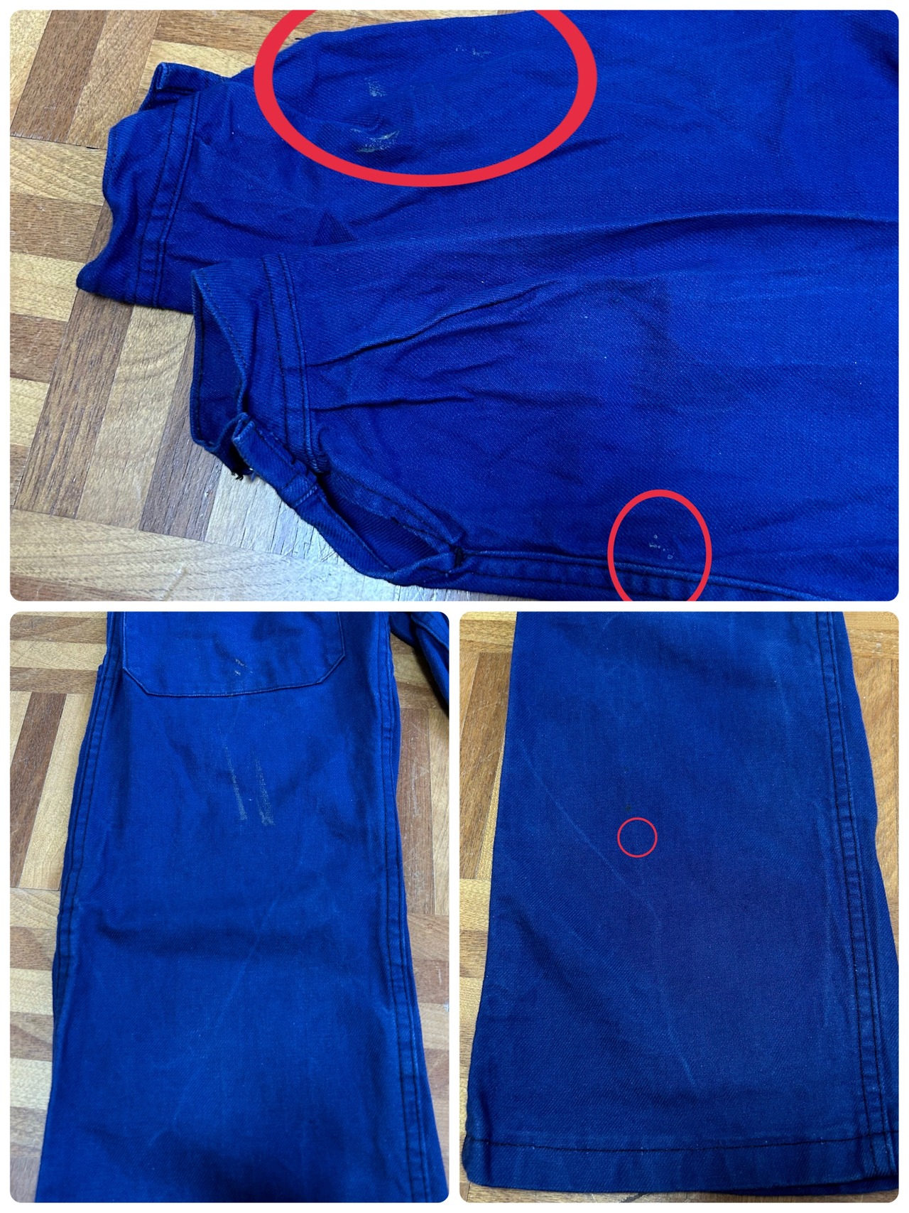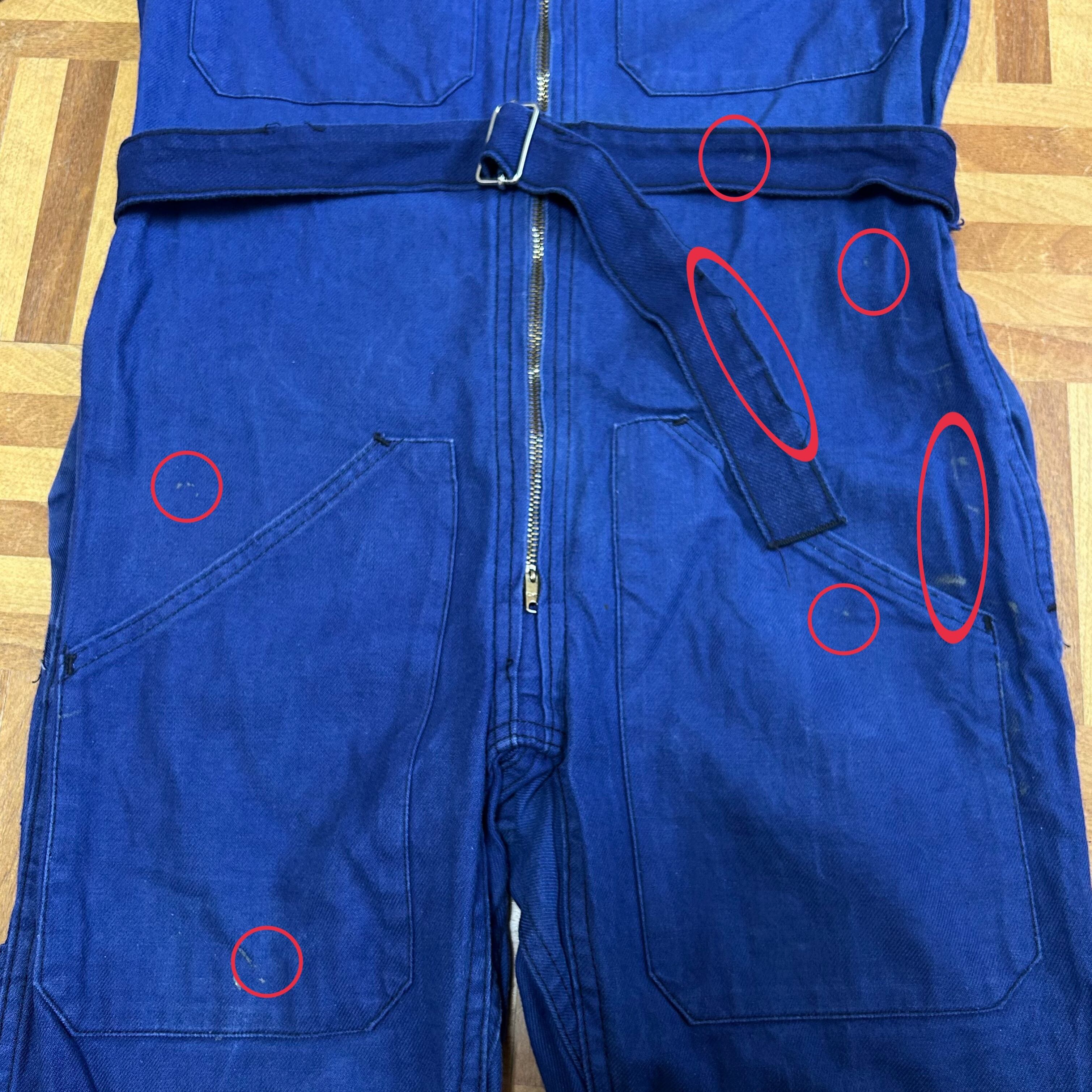首元に5㎜〜1.5㎝程度のダメージ数カ所あり。ベルト糸引け数カ所あり。袖、左肩下、胸元、ベルト、ウエスト辺り、左右下ポケット、右太もも、右裾上、ヒップ左サイドに薄汚れ数カ所あり。