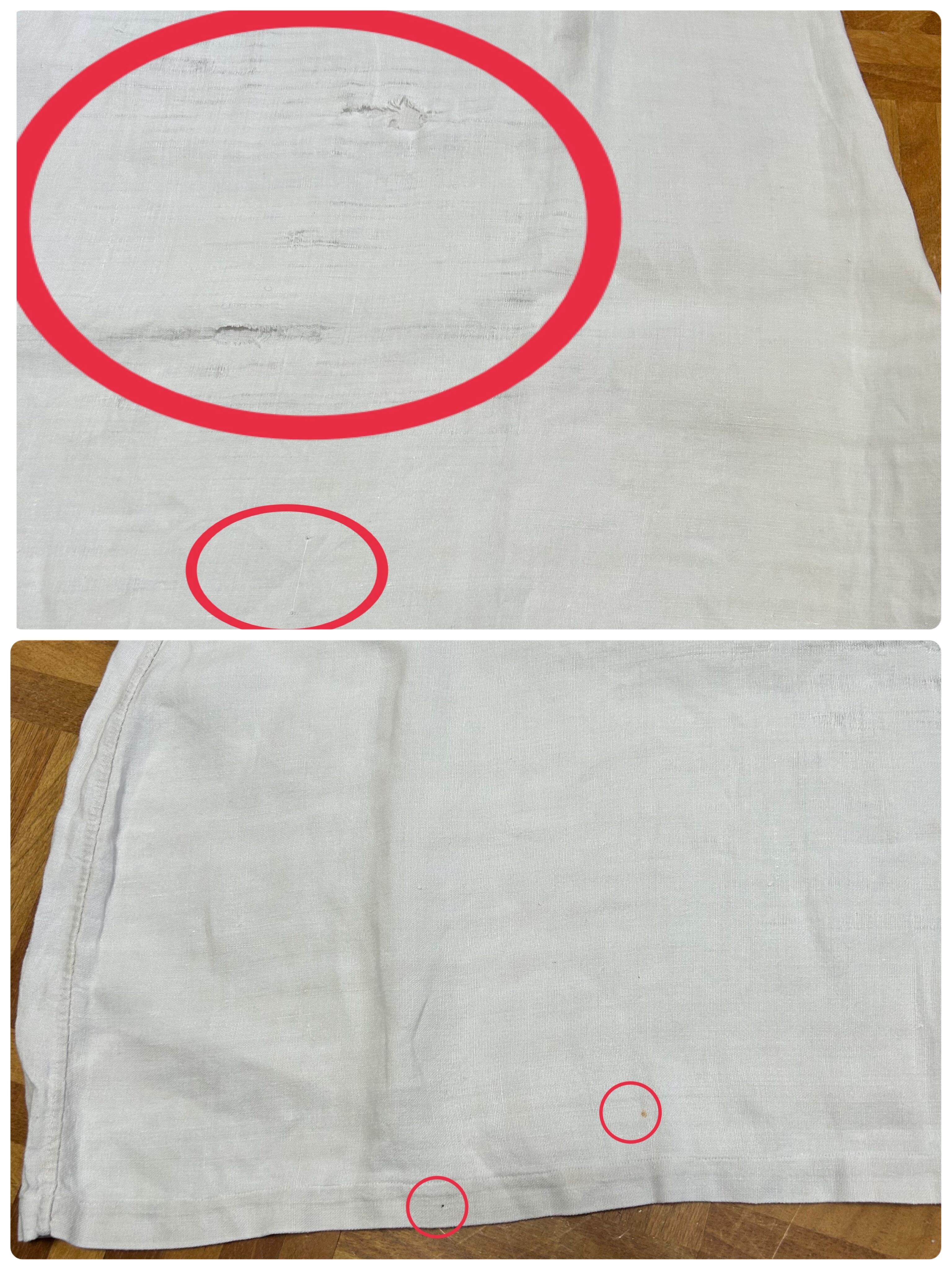 、前後裾辺り、バック右袖付け辺り、背中、ヒップに生地が薄くなっているところ、数カ所あり。ウエスト、背中、ヒップあたりに5㎜〜7㎝程度のダメージ数カ所あり。首周り、胸辺り、左右袖付け、前後裾あたり、前後左右サイド、背中に薄汚れ数カ所あり。