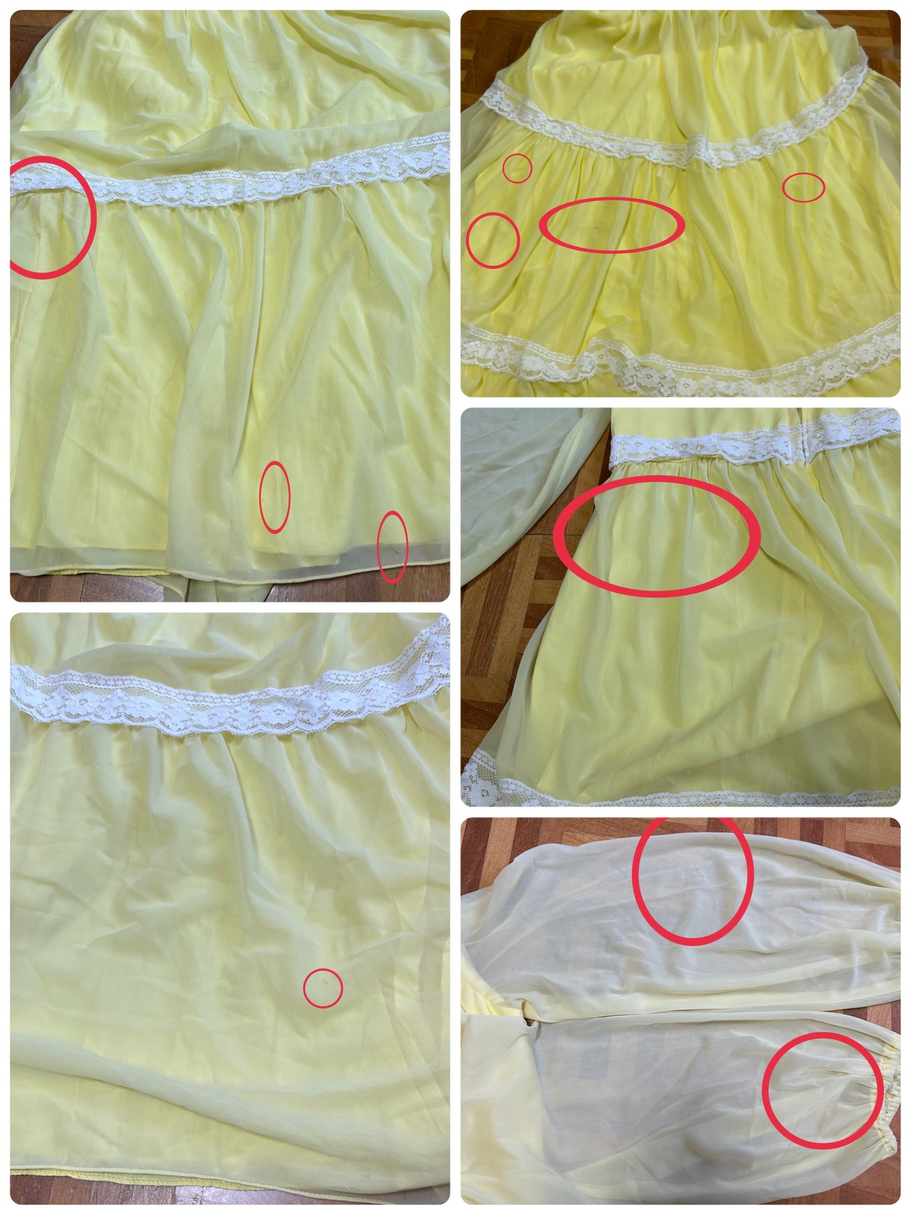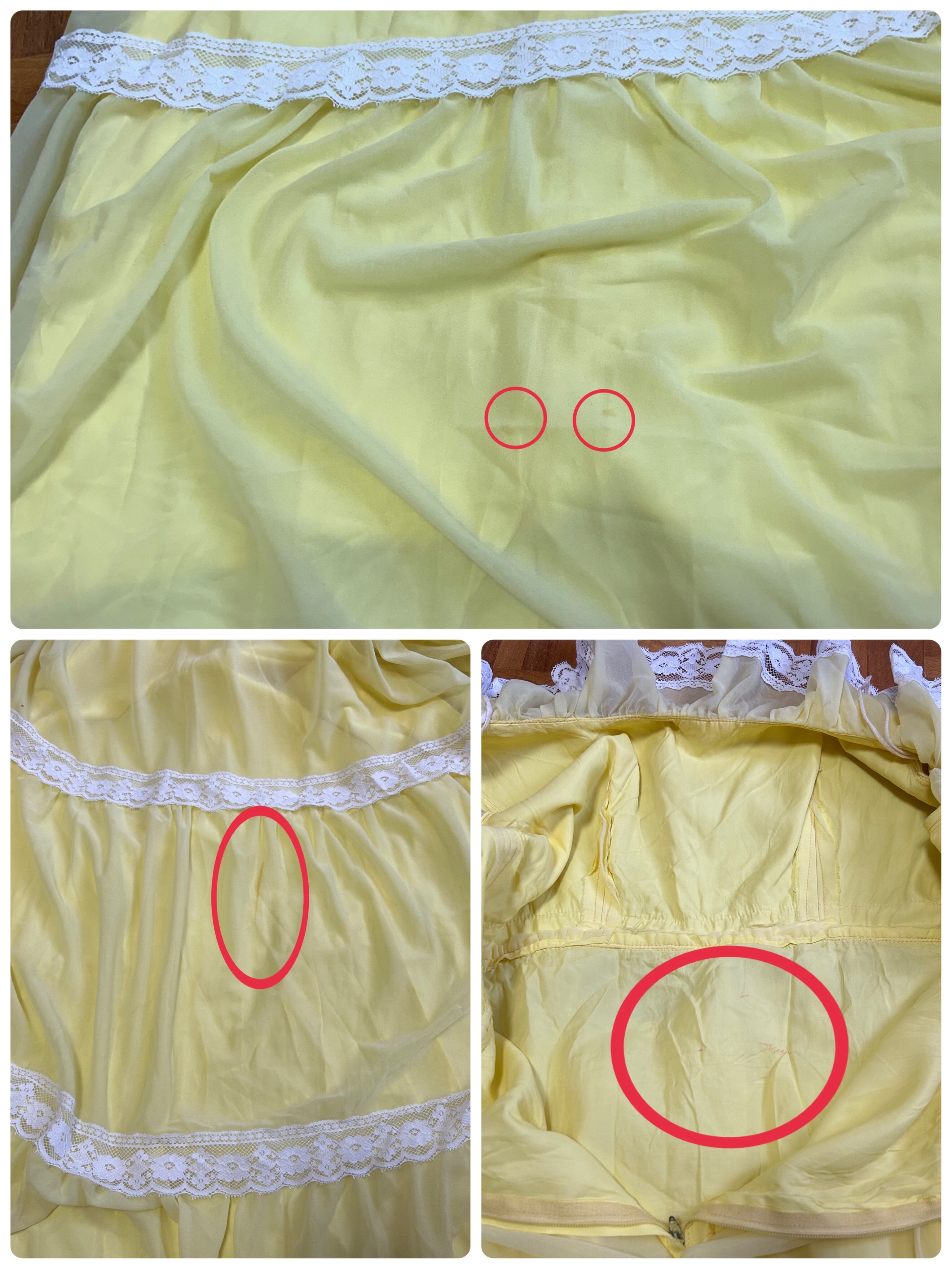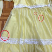 袖、ウエスト下辺り、バック左ウエスト下辺りに生地引け数カ所あり。ウエスト下辺り、スカート中央、バックスカート、左右サイド、前後裾辺りに薄汚れ数カ所あり。裏地お腹辺り薄汚れあり。
