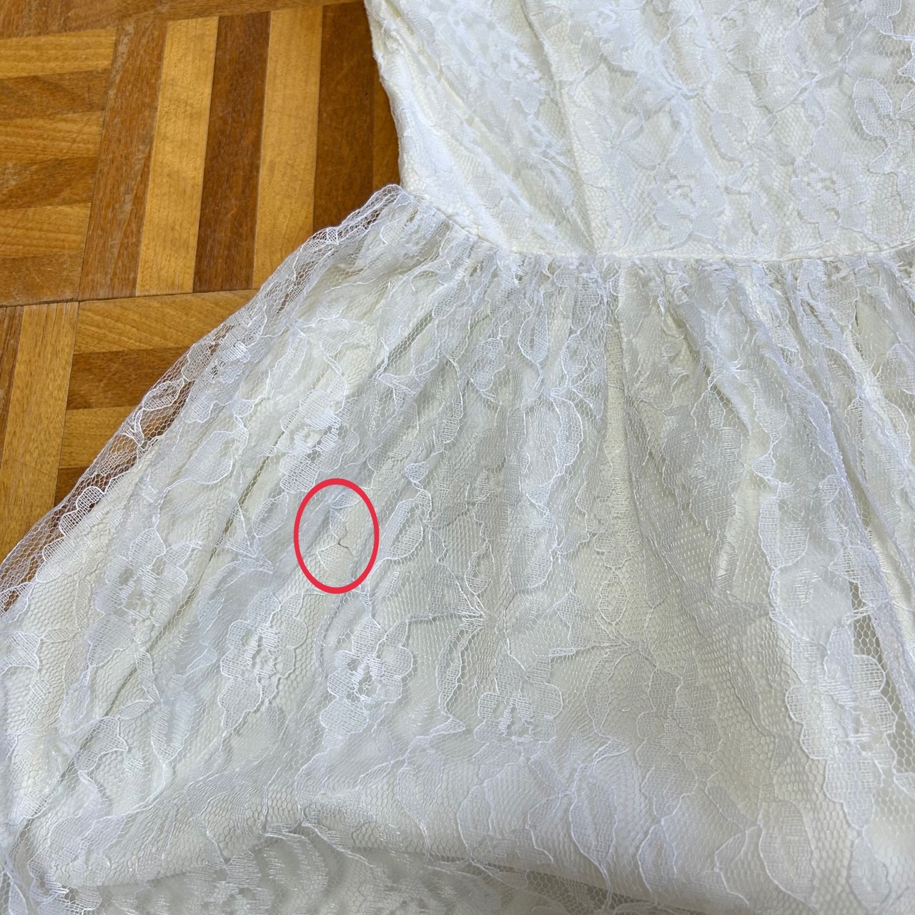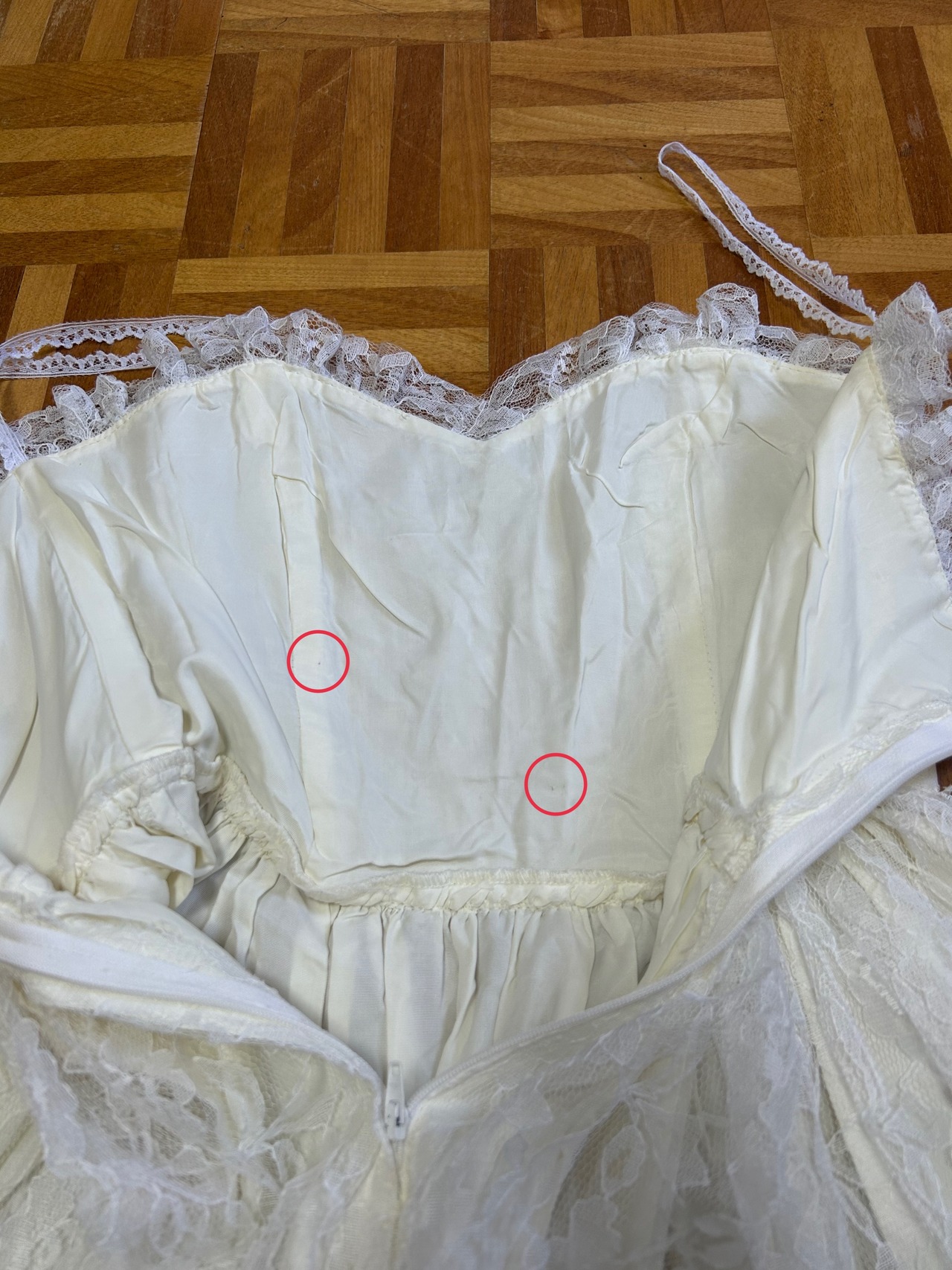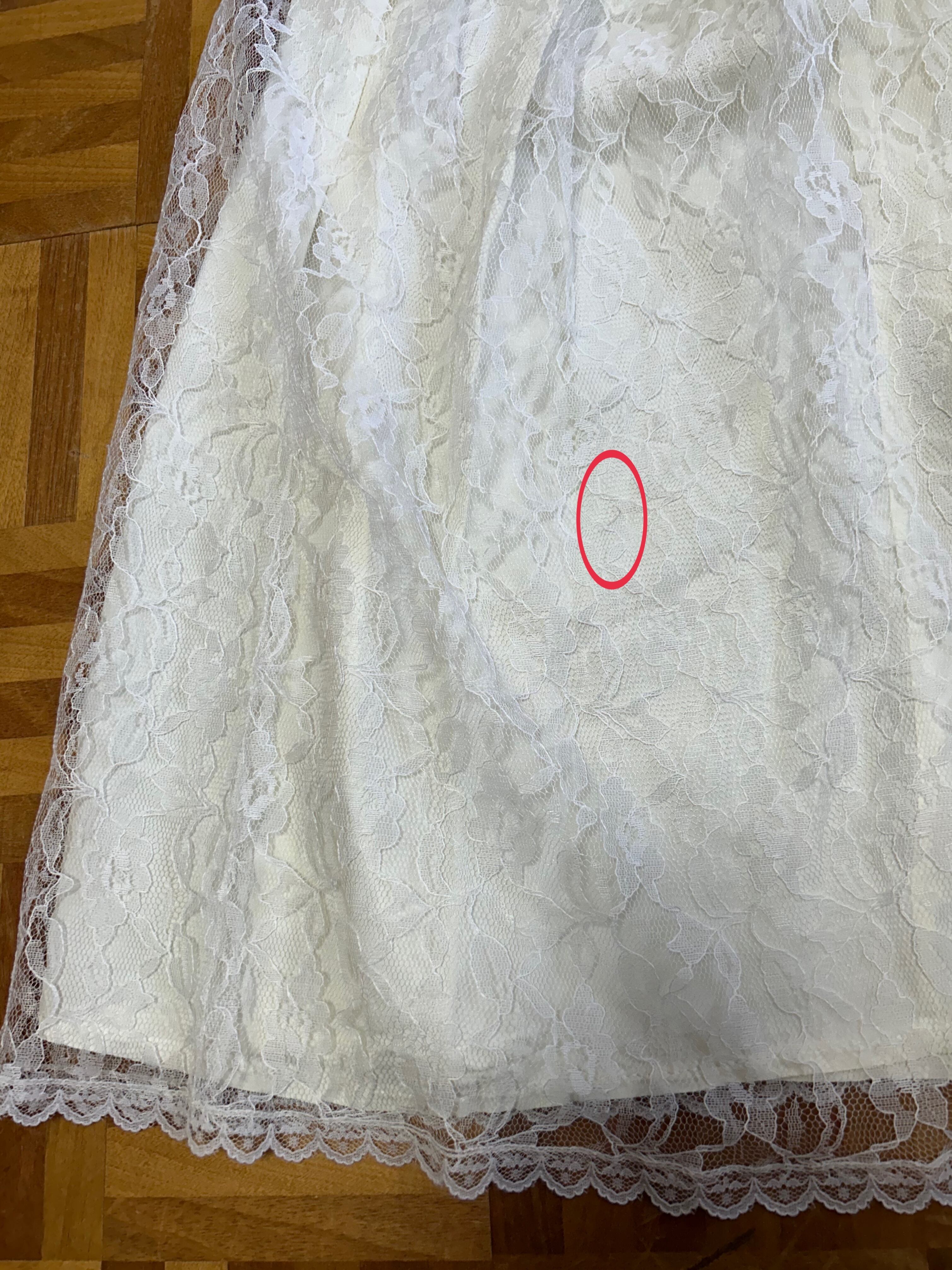 右ウエスト下辺り、バック左裾上、スカート裏地右裾上、裏地胸元に薄汚れあり。