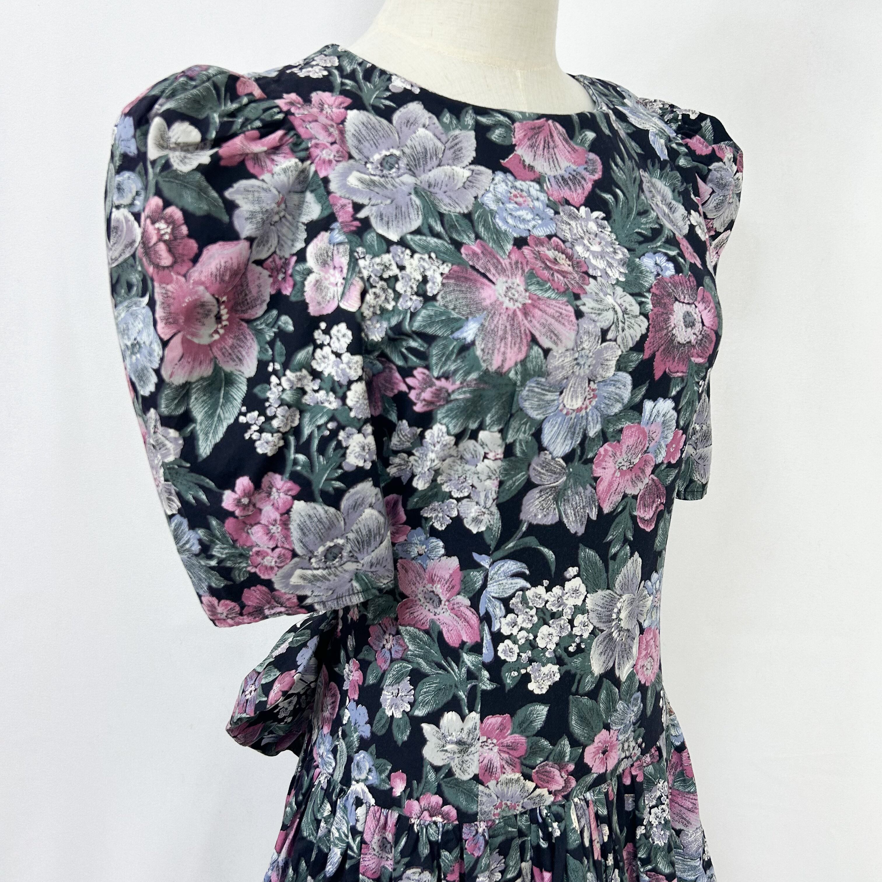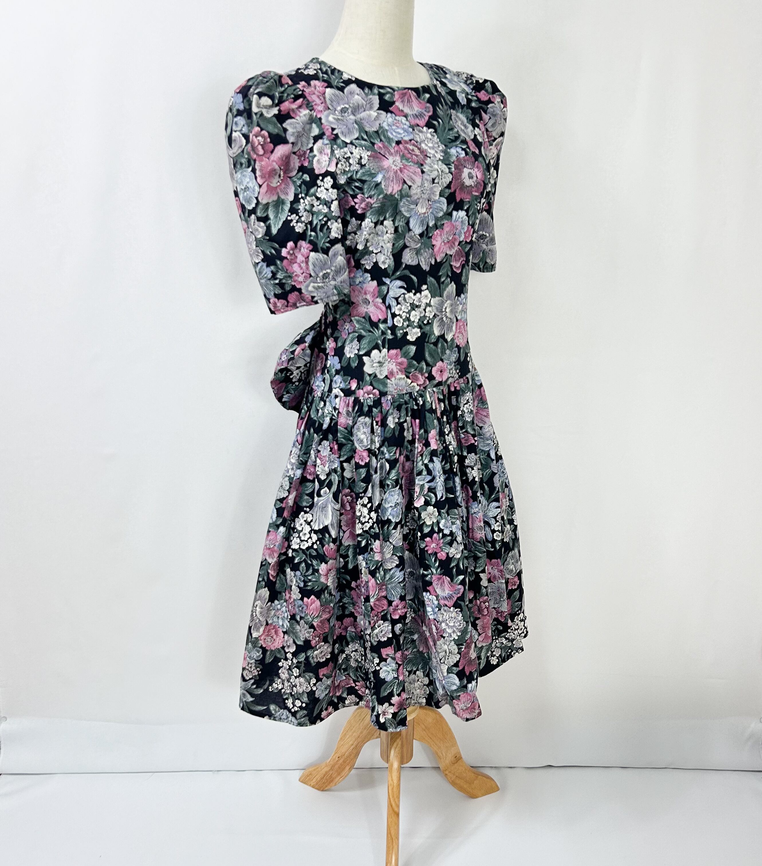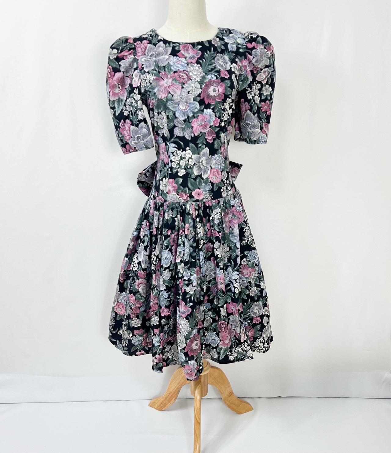 ヴィンテージ 80s USA製 花柄 フラワープリント ウエストリボン 半袖 フレアワンピース ドレス