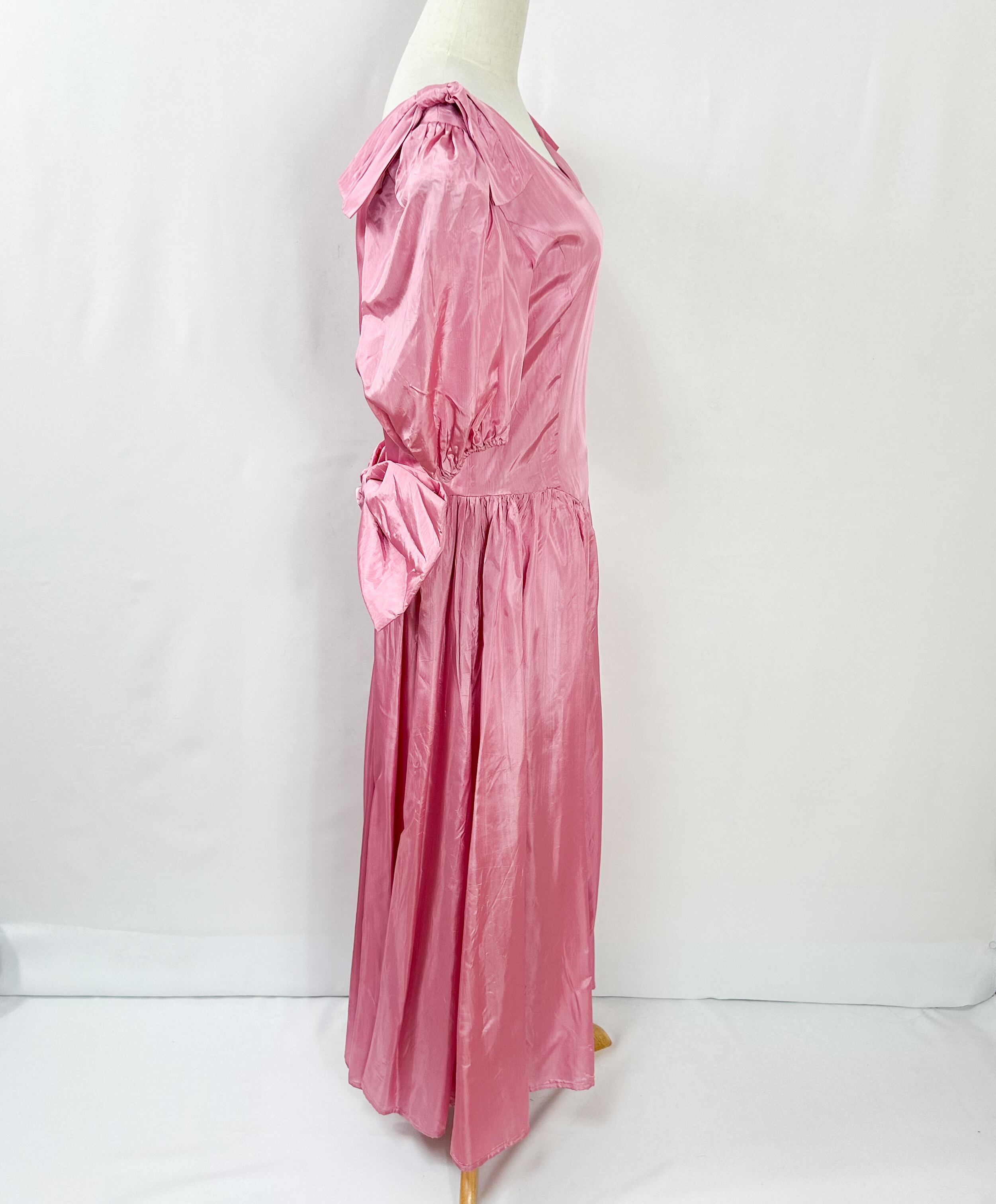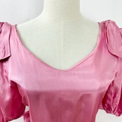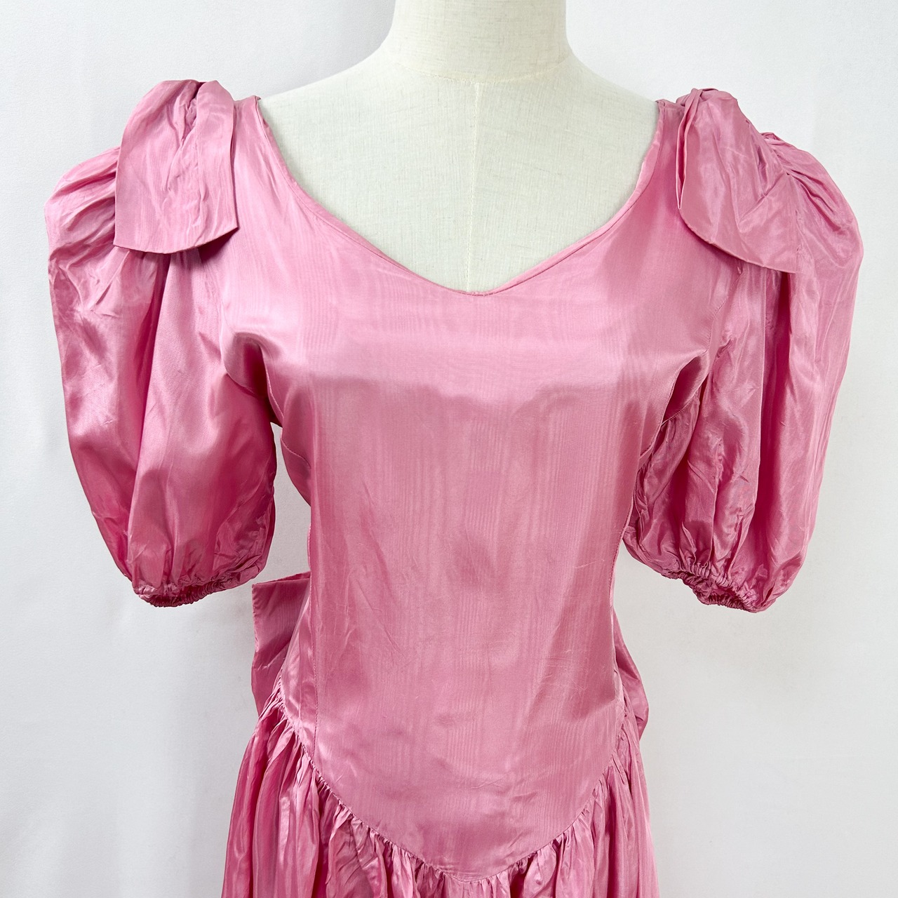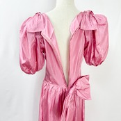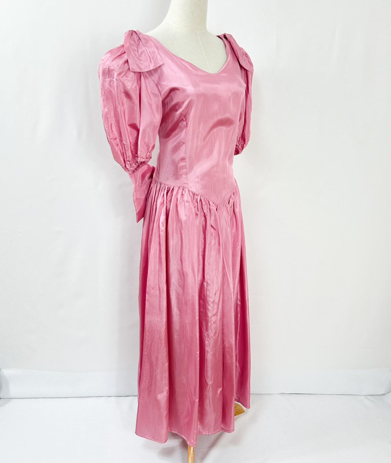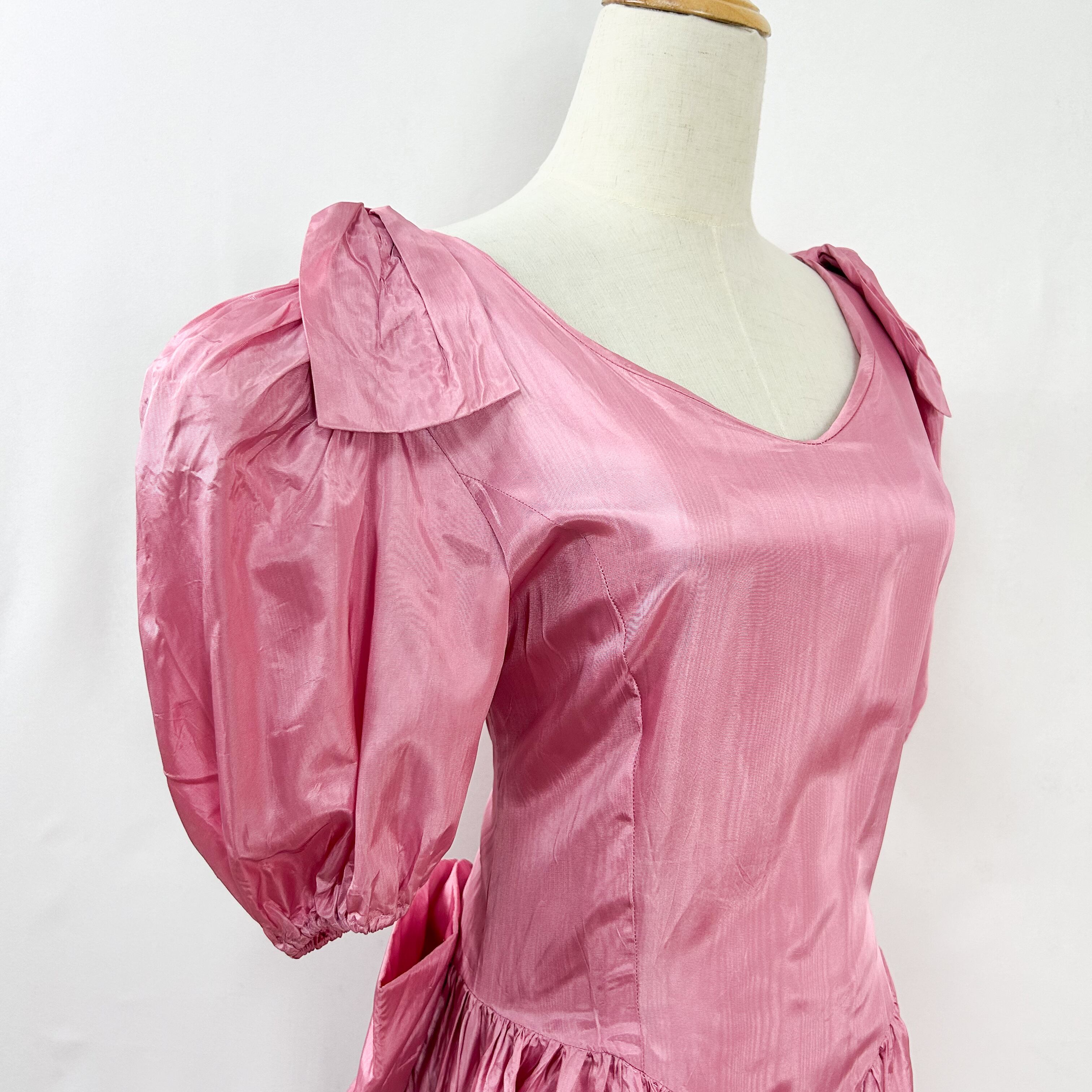 ヴィンテージ 肩リボン ウエストリボン バルーンスリーブ 半袖 ロング丈 サテン ワンピース ドレス