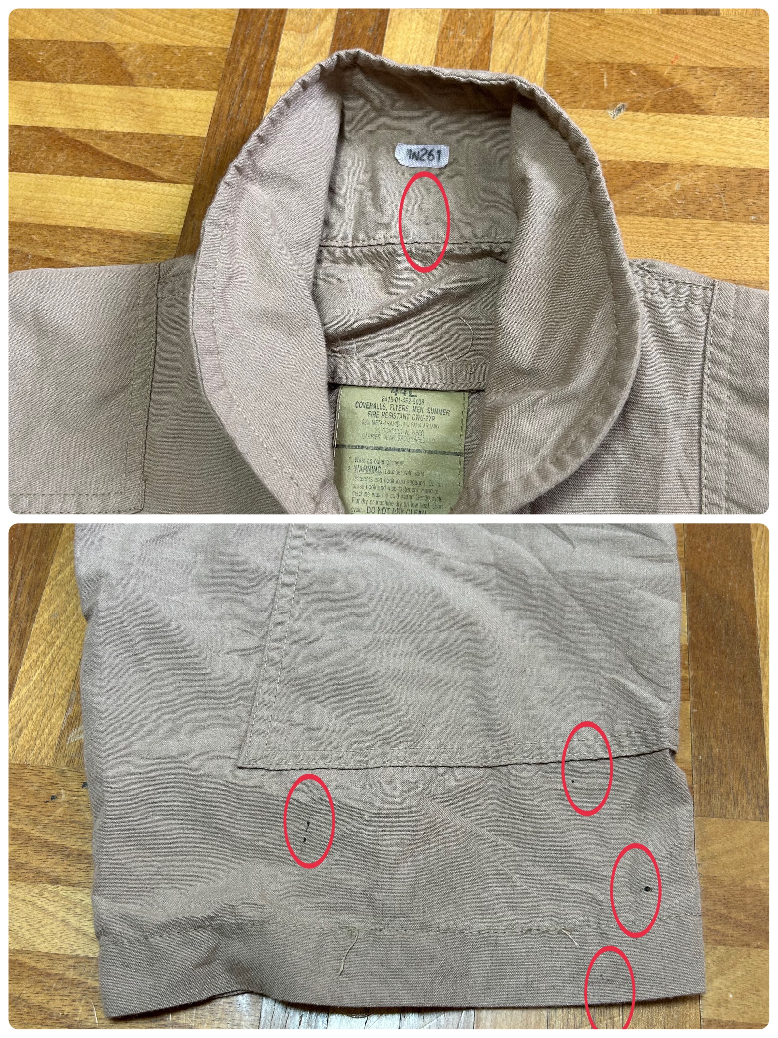 襟内側、左ウエスト下辺り、右太もも、バック右裾に薄汚れ数カ所あり。