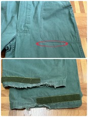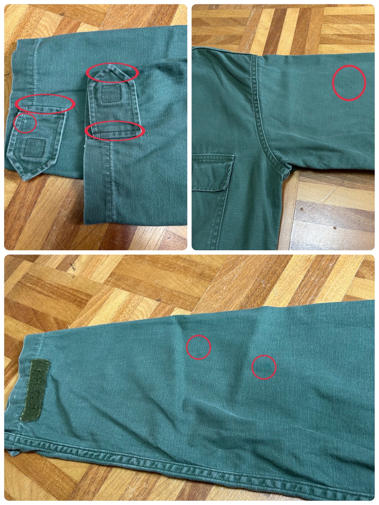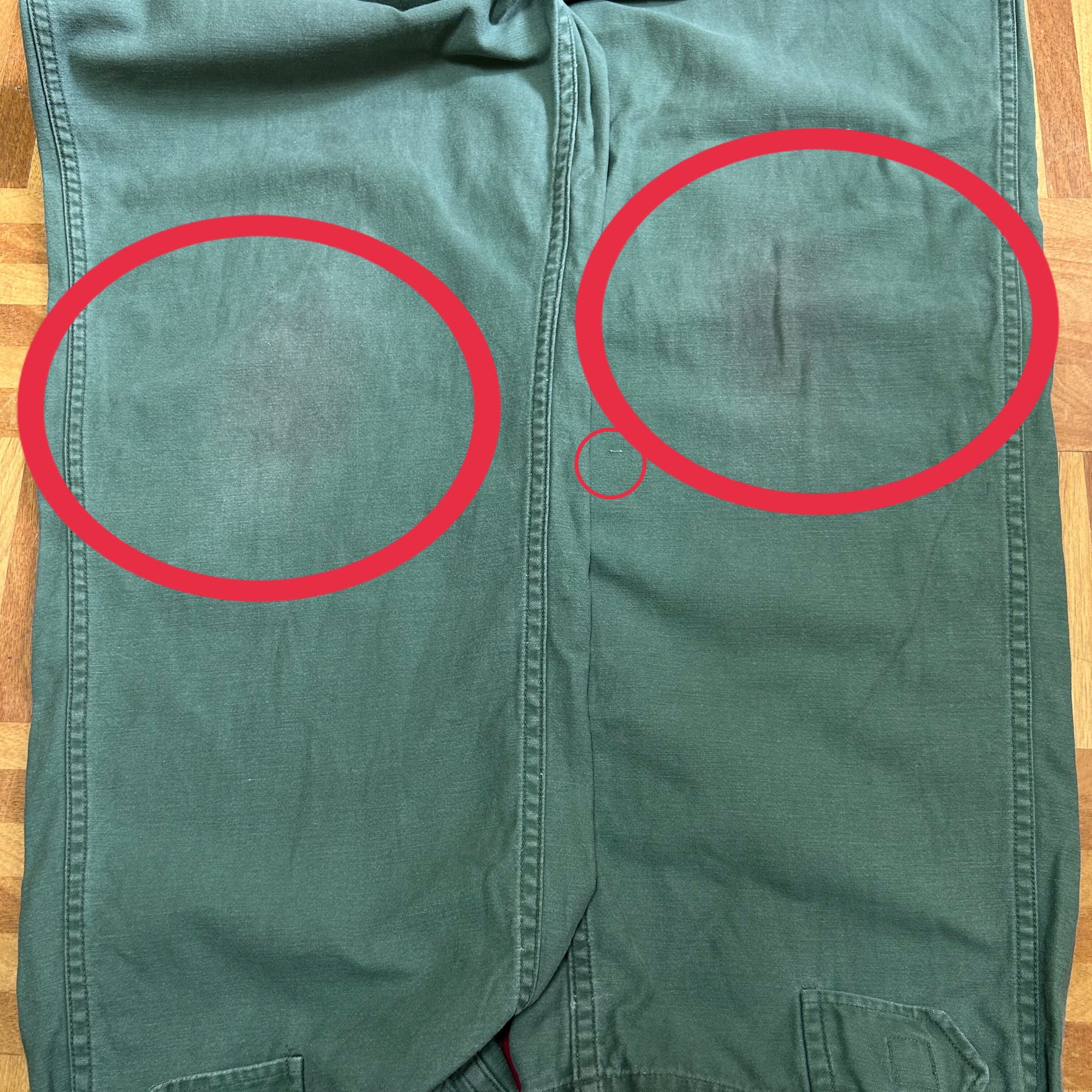 袖、膝に薄汚れ数カ所あり。袖先、左脚ポケット下、膝に生地引け数カ所あり。バック裾ダメージあり。
