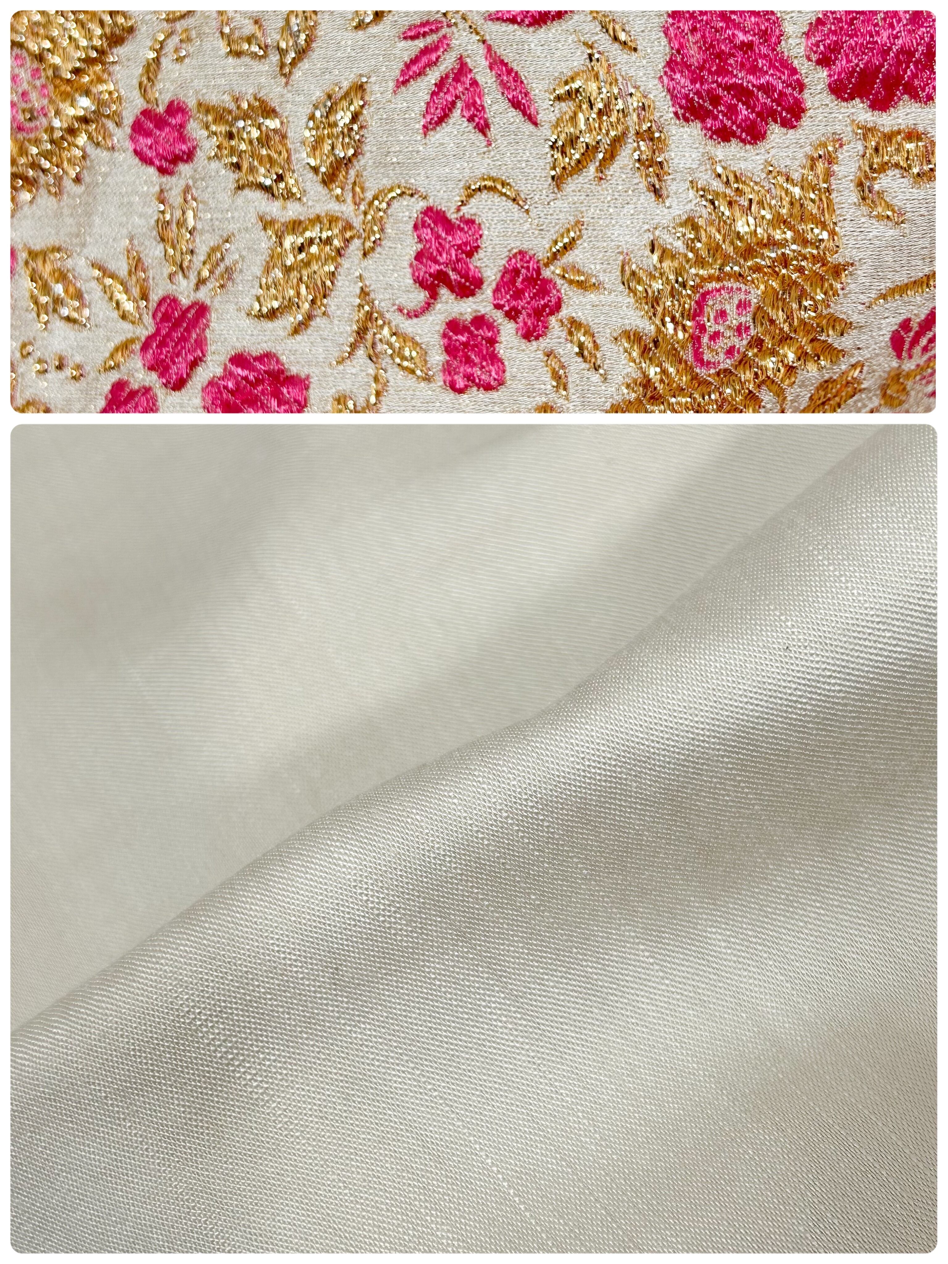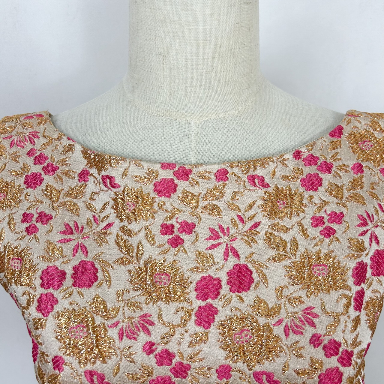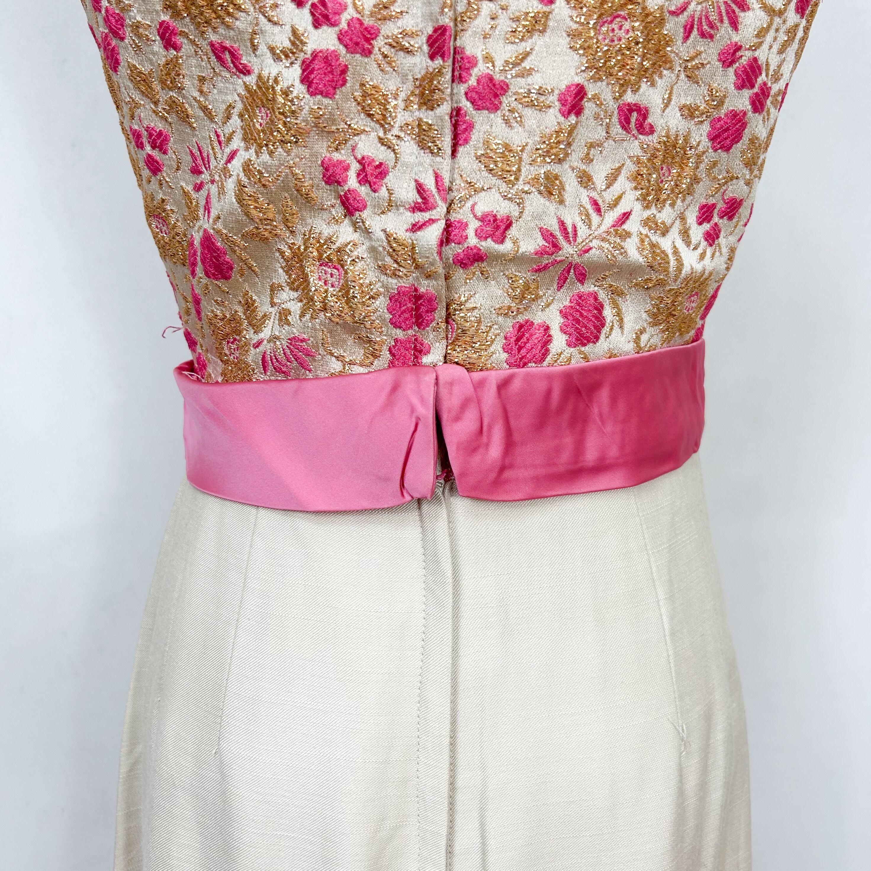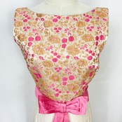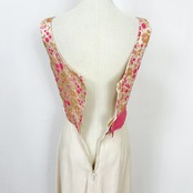 ゴールドカラーとピンクの花柄の刺繍が素敵なドレスです。