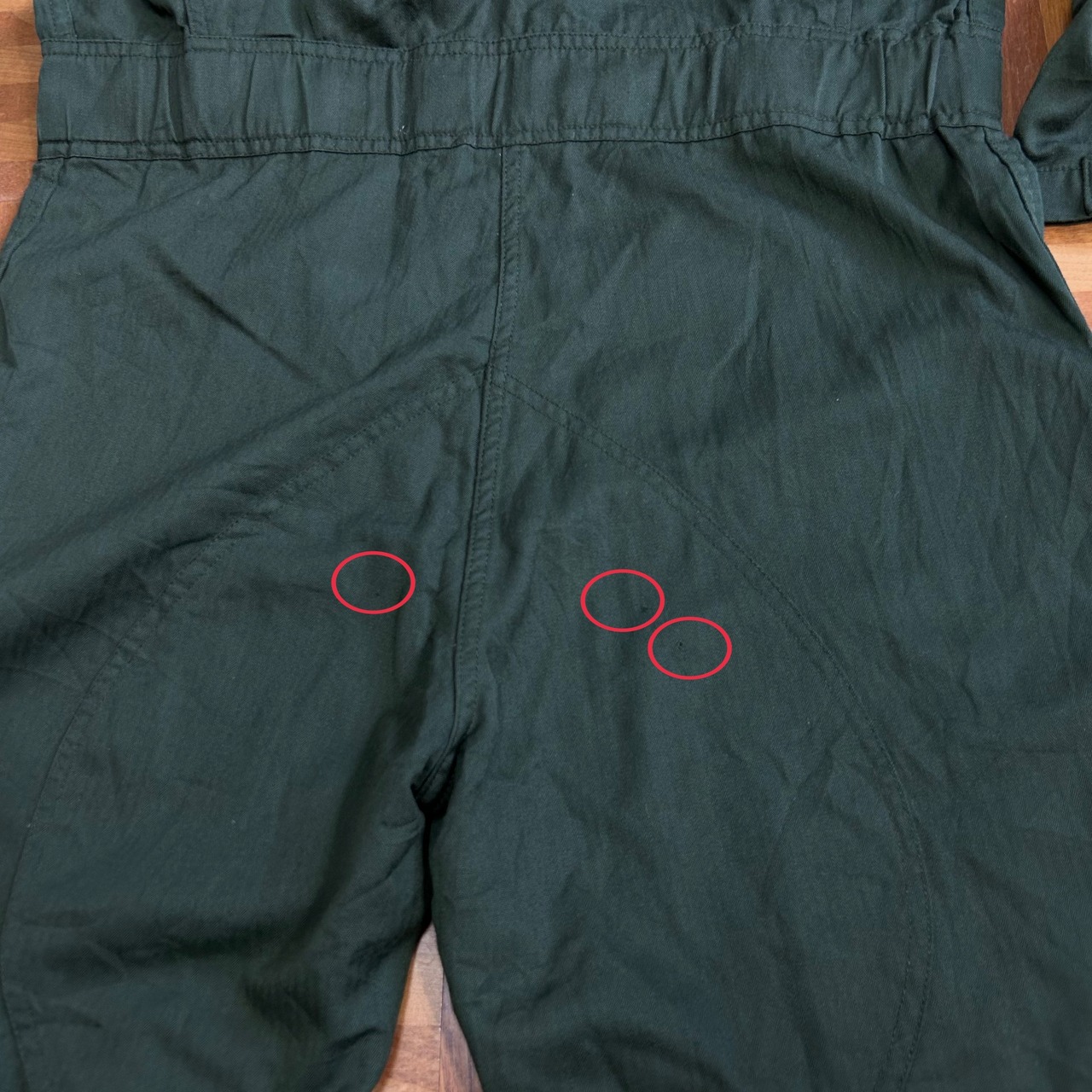 濃いグリーンにヘリンボーン生地なのでどこか上品さを感じるジャンプスーツです。
