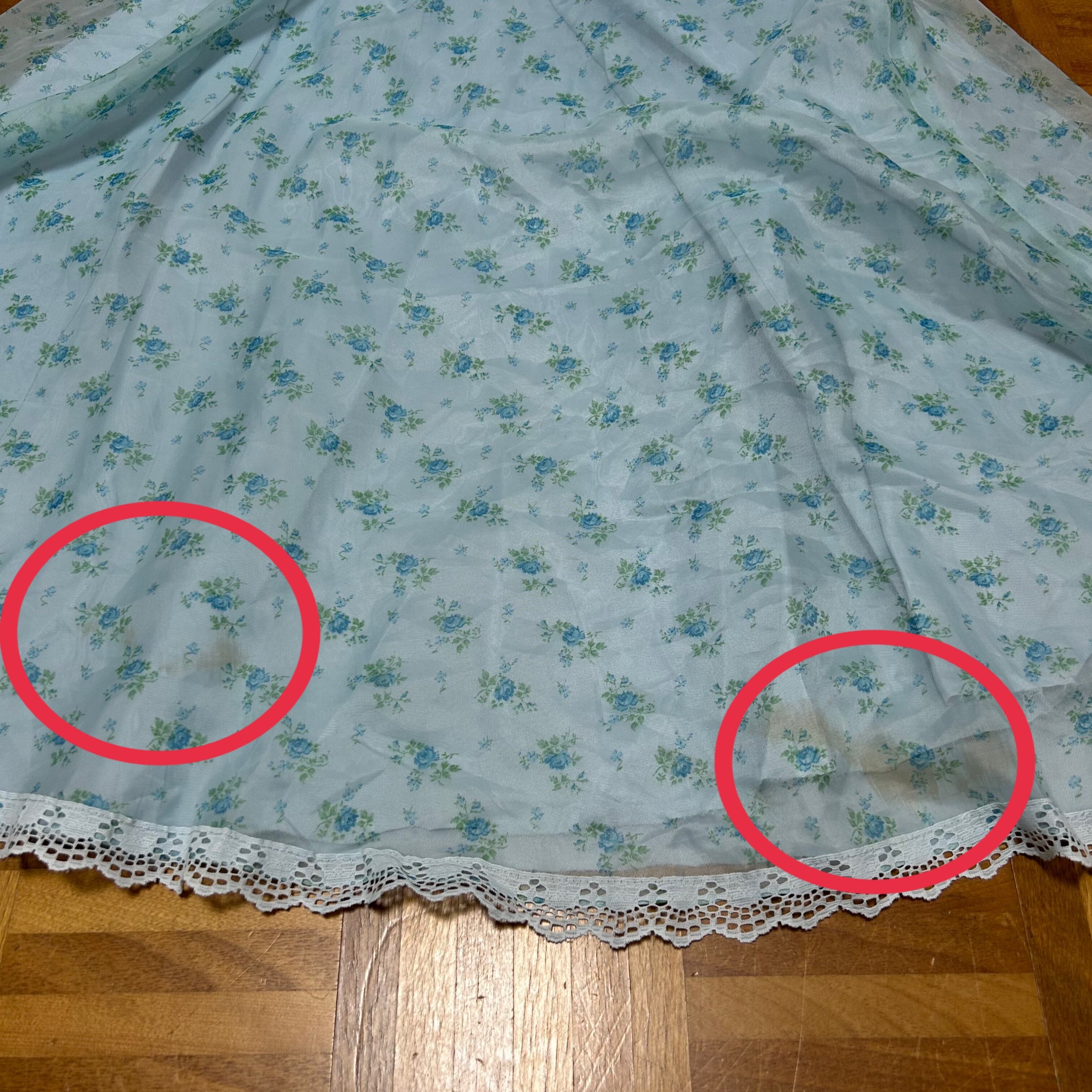 裾、バックウエスト下に薄汚れ数カ所あり。スカート裏地、バックウエスト下、バックスカート真ん中下辺りに薄汚れ数カ所あり。裏地の裾切りっぱなしです。
