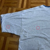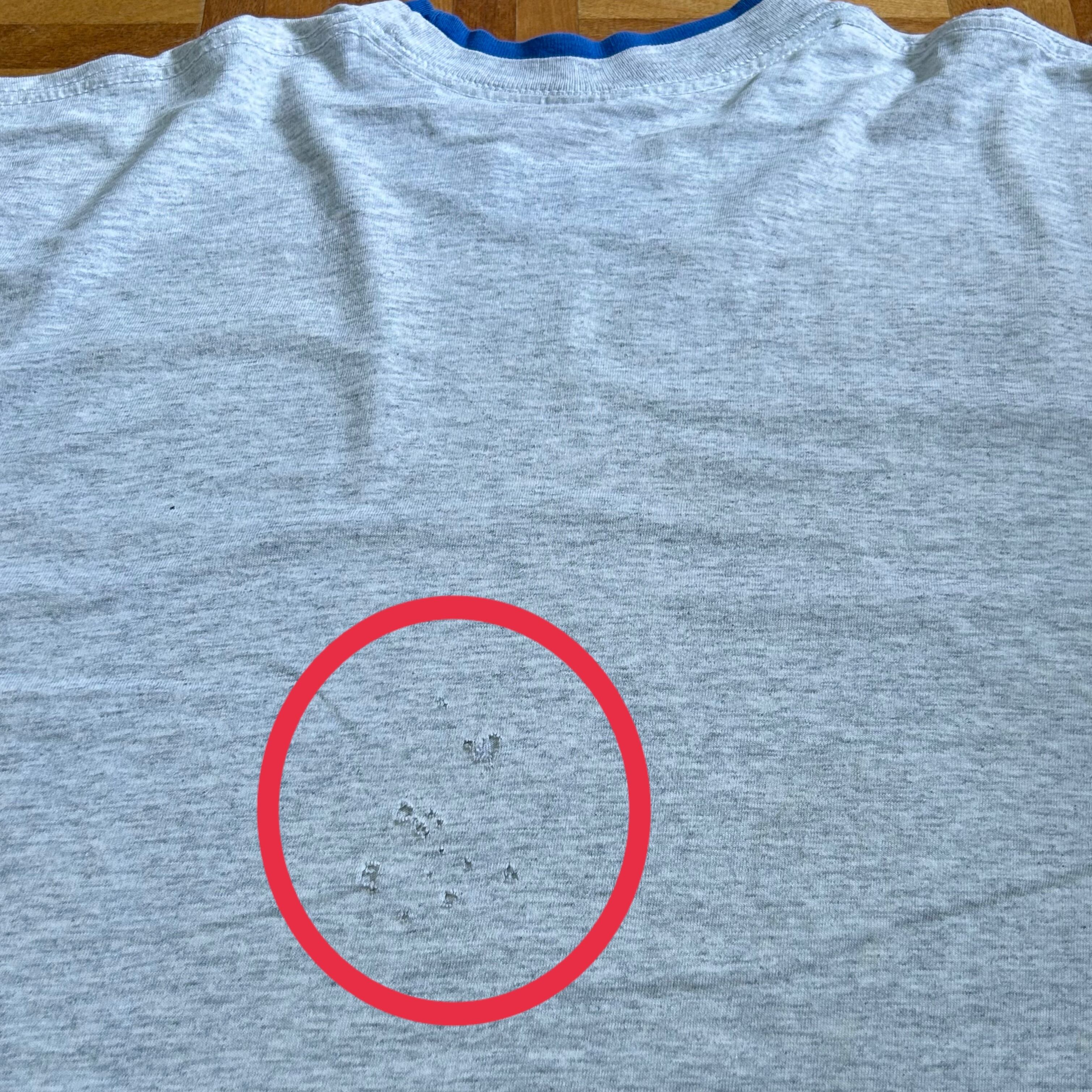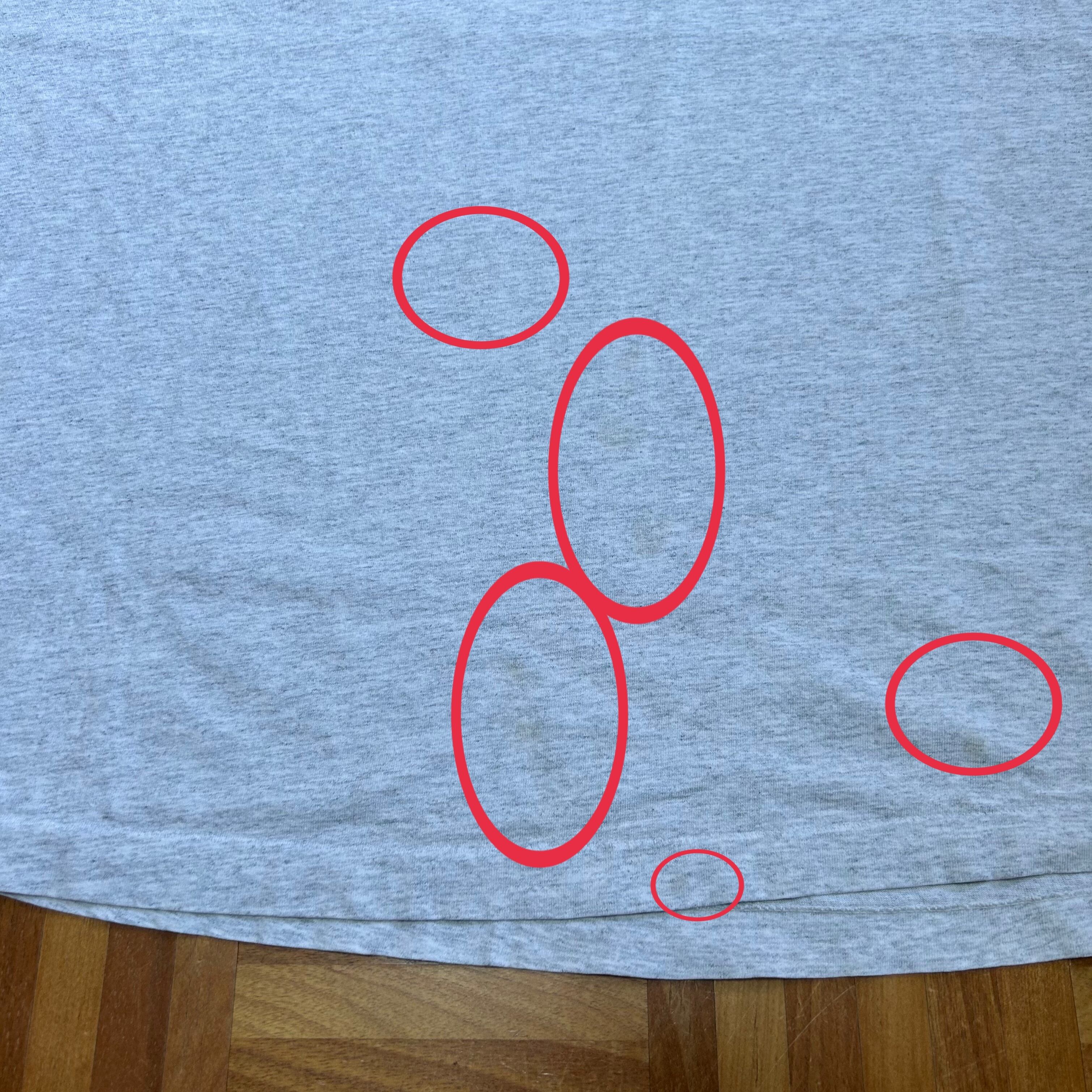 バック首元内側、左肩、背中に5㎜〜1㎝程度のダメージ数カ所あり。左右脇、裾上辺り、バック左袖、背中に薄汚れ数カ所あり。