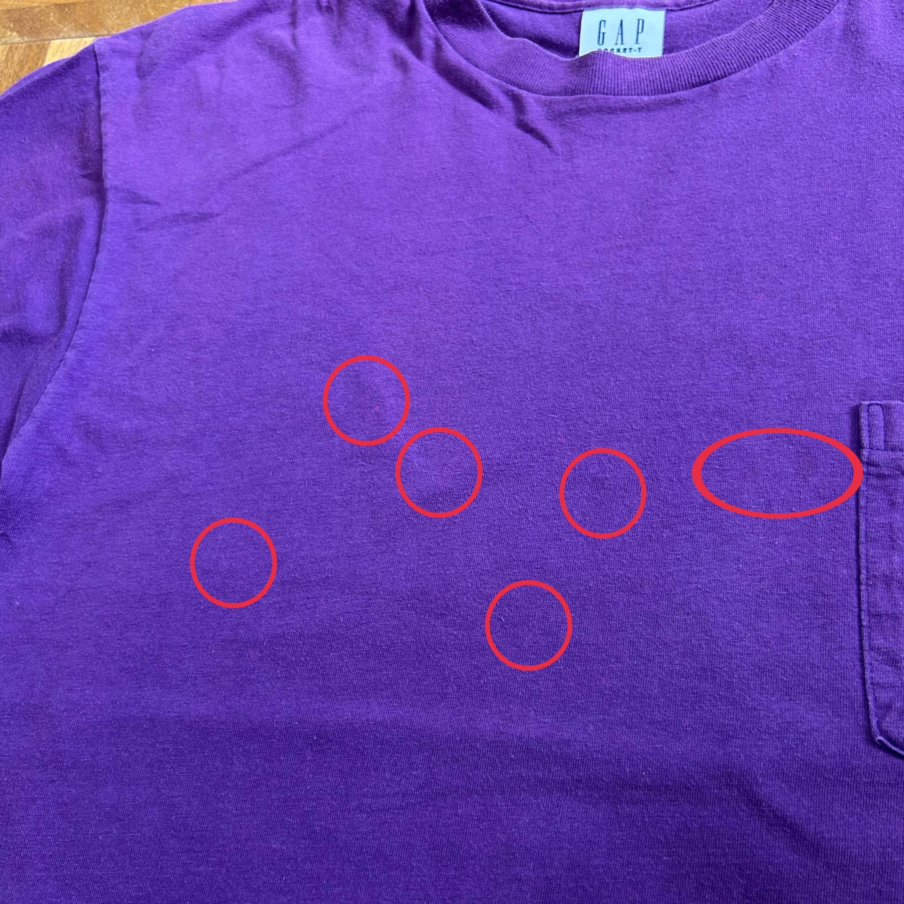左肩下に1㎜程度のピンホールあり。右袖、胸辺り、バック腰に薄汚れ数カ所あり。