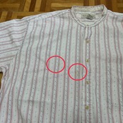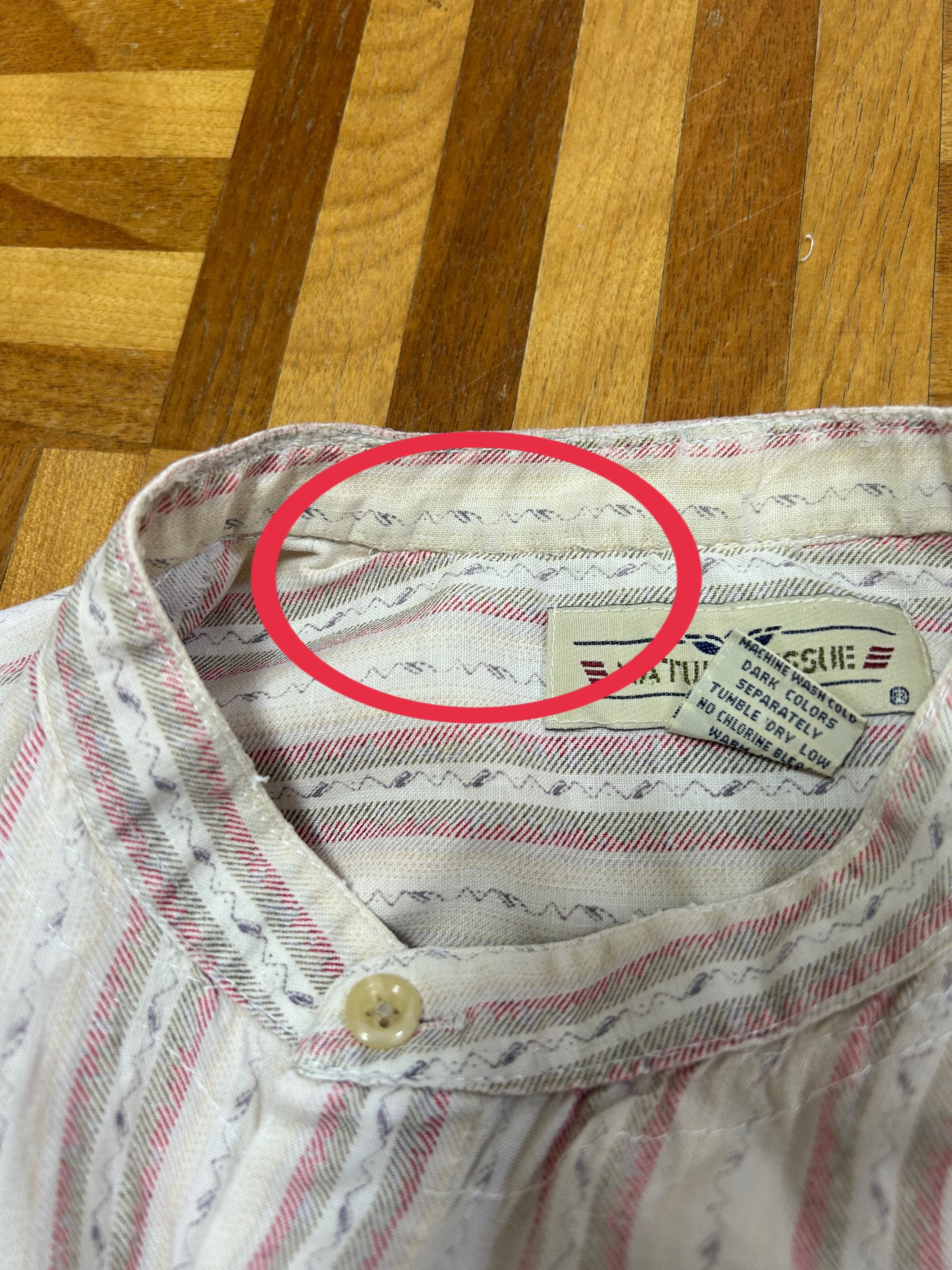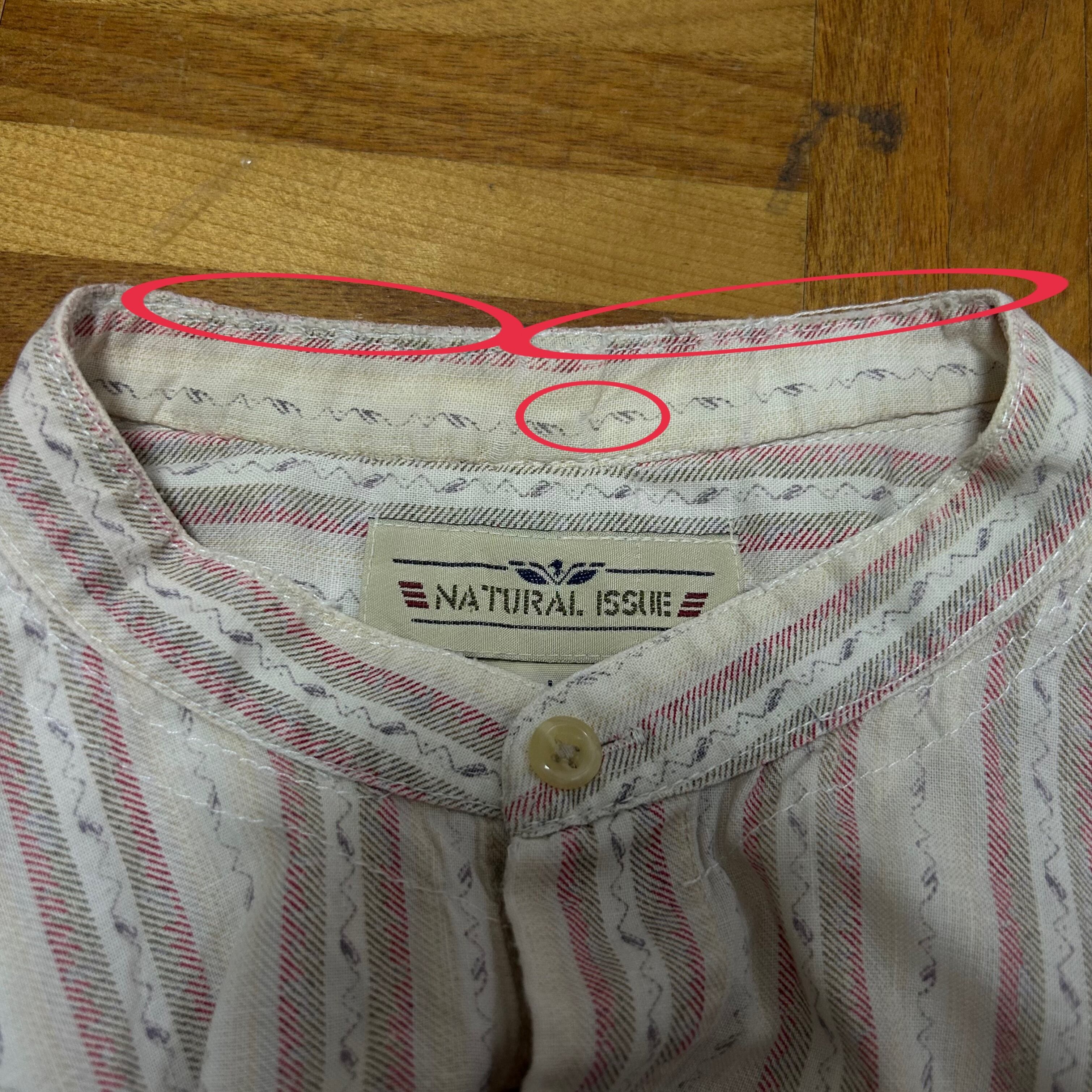 首周り擦れダメージ数カ所あり。首周り内側、右胸に薄汚れ数カ所あり。首周りリペア跡あり。