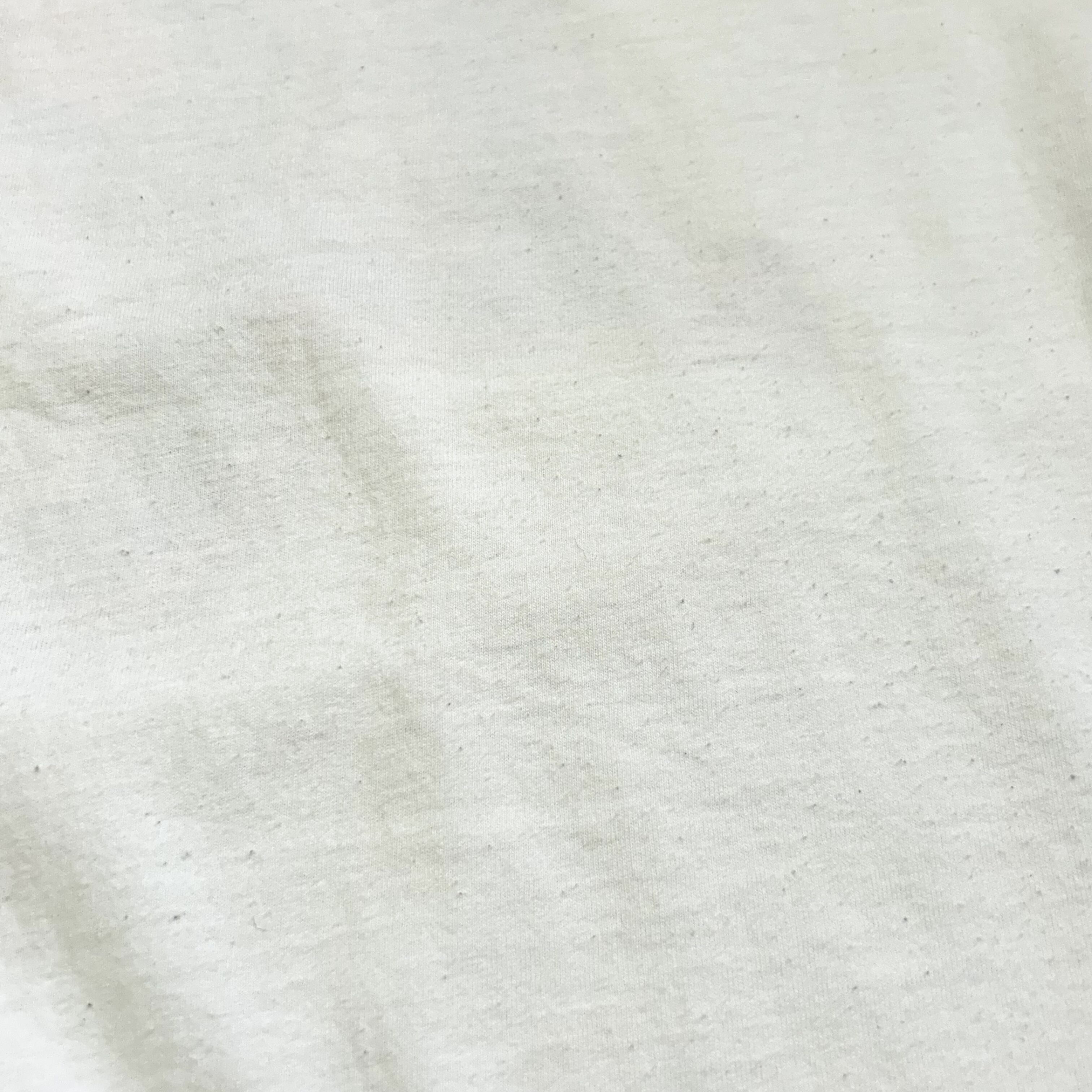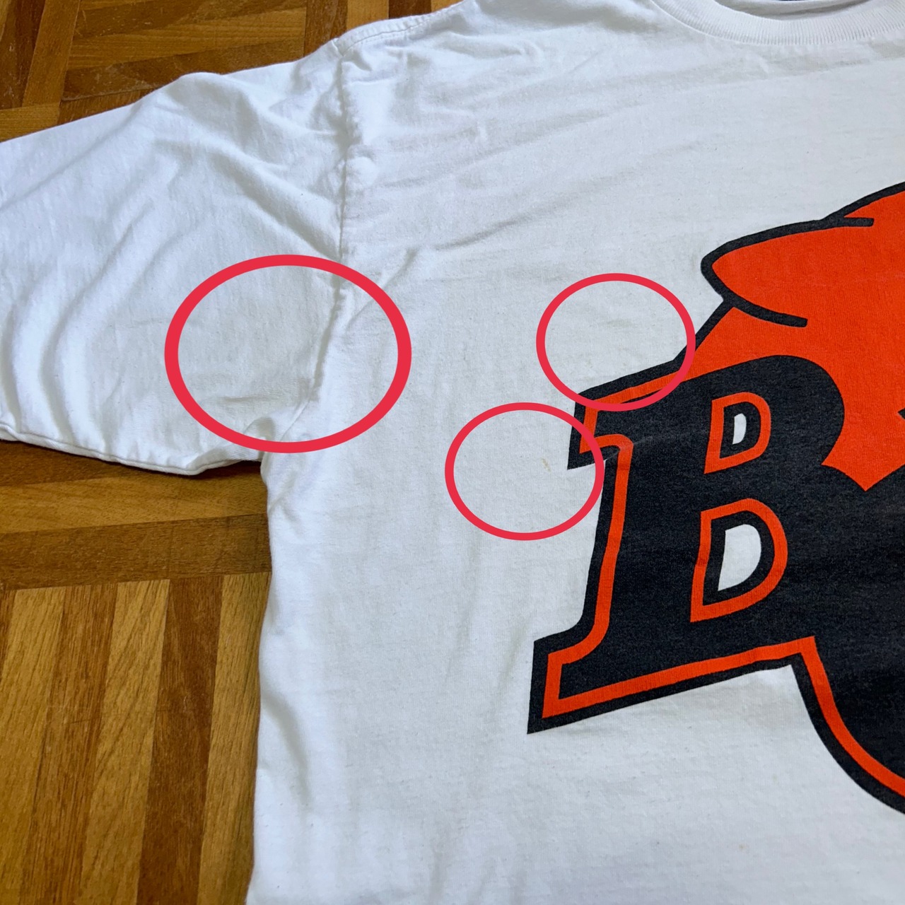 首周り、脇辺り、右胸、お腹、背中に薄汚れ数カ所あり。プリント若干白っぽくなっているところあり。所々毛玉あり。