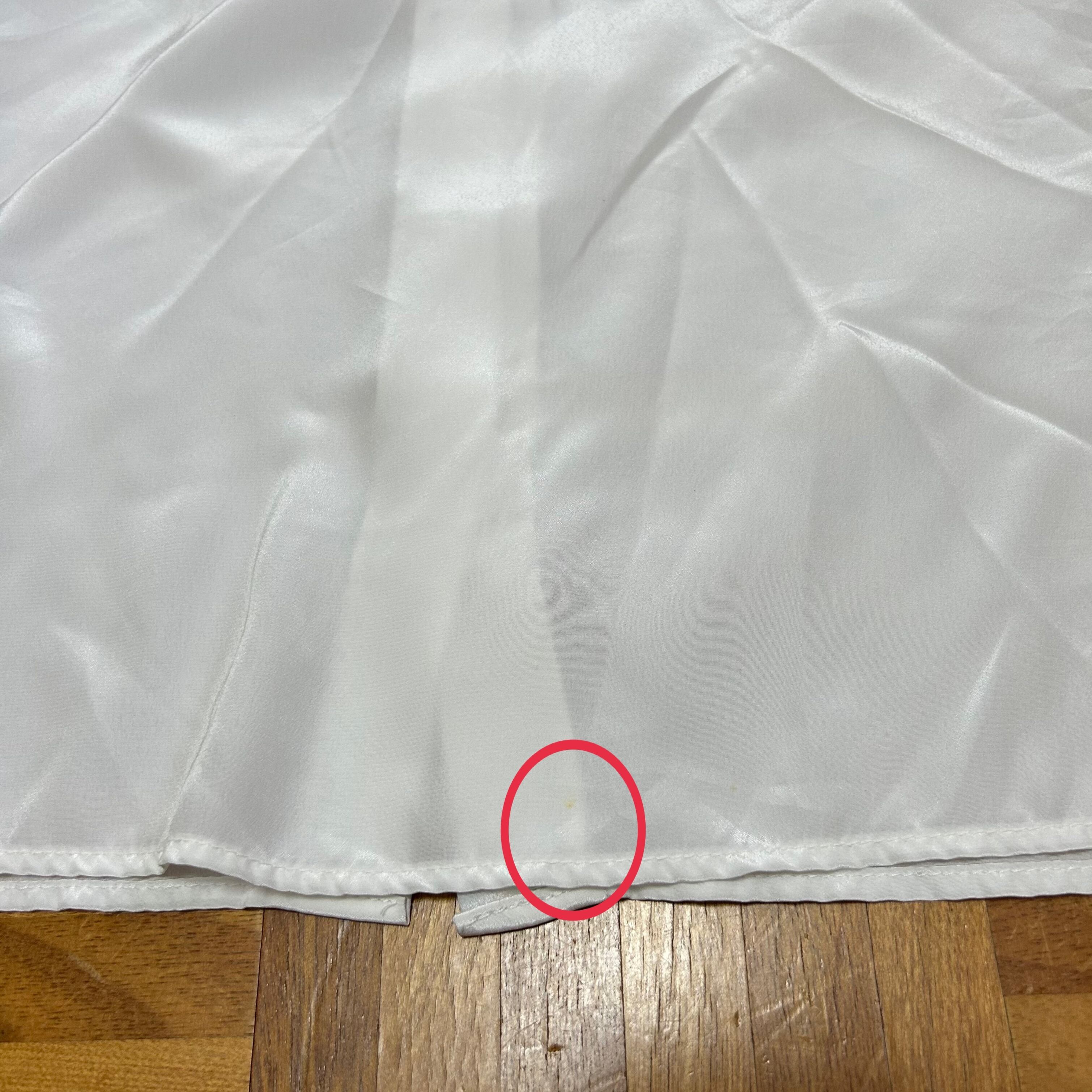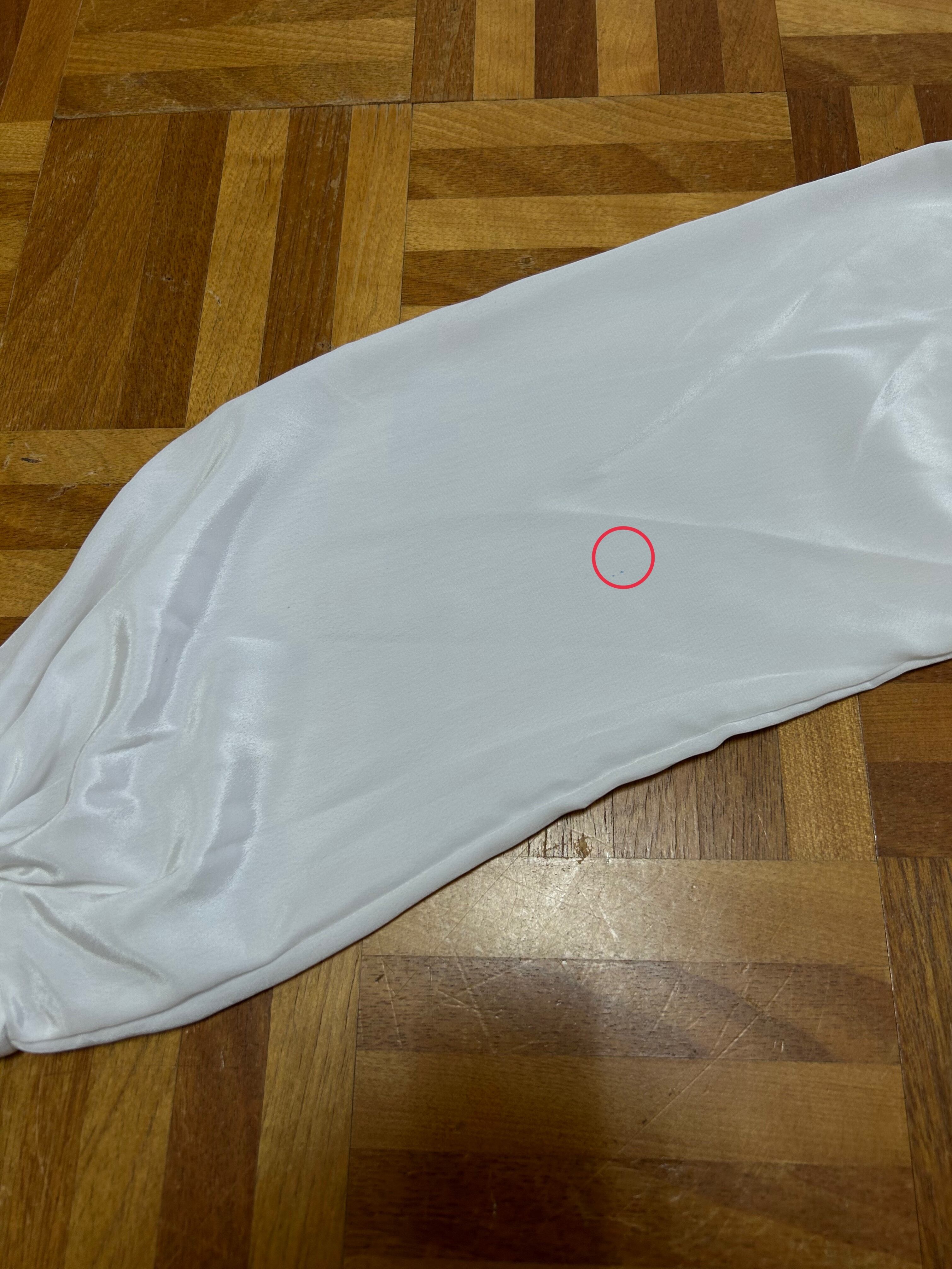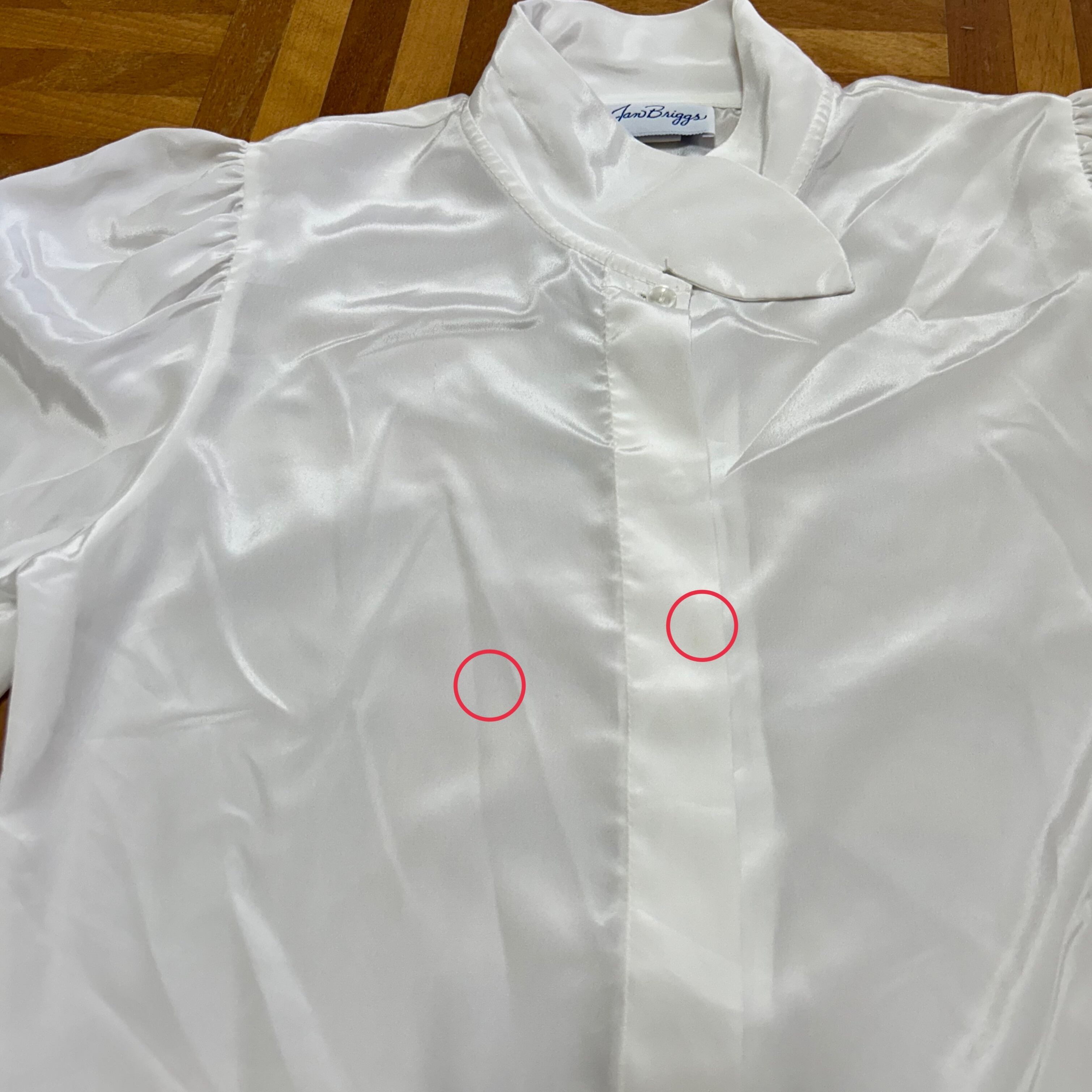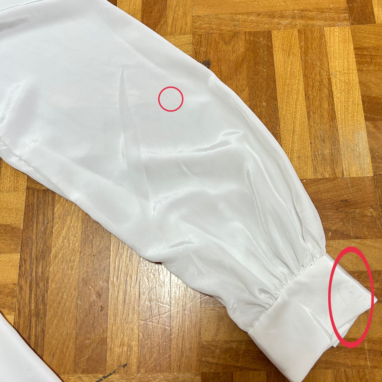 透け感あり。袖、胸辺り、バック裾に薄汚れ数カ所あり。胸の薄汚れはよく見ないと分からない程度です。襟先よく見ないと分からない程度のダメージ数カ所あり。